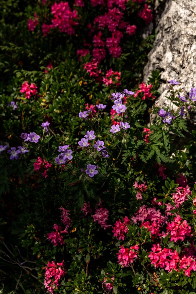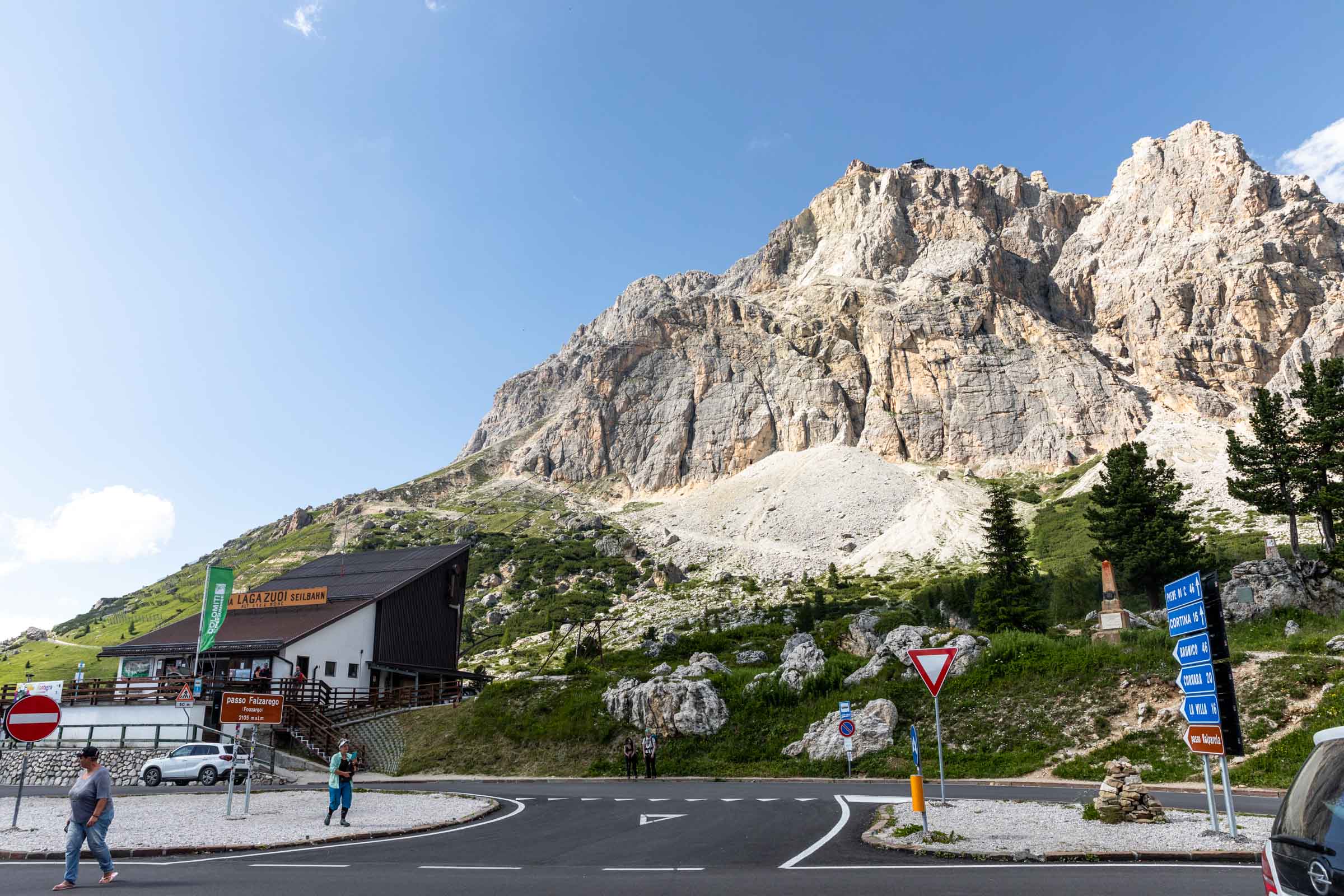 While I could have hiked from Rifugio Pomedes to Rifugio Averau if I had better planned, I walked nearly the same amount by going all the way down to Cortina to grab groceries and a bus ride to the pass. This allowed me to see more above treeline instead of hiking through the forest again. Taking Dolomiti bus 30/31west, I got at the touristy stop at Pass Falzarego where people were getting read to take the lift to Rifugio Lagazuoi, a highly sought after hut. I walked the other way, going southeast towards my hut. It was fun to pass by more lifts but seeing the fields dotted with wildflowers and the laughter of families enjoying a summer day outside. There’s several paths to get up to Forcella Averau, the pass to get around the main cliff band of the small peak. Surprisingly, the climbing spot was well labeled with a sign of all the sport climbing routes. How neat is that?