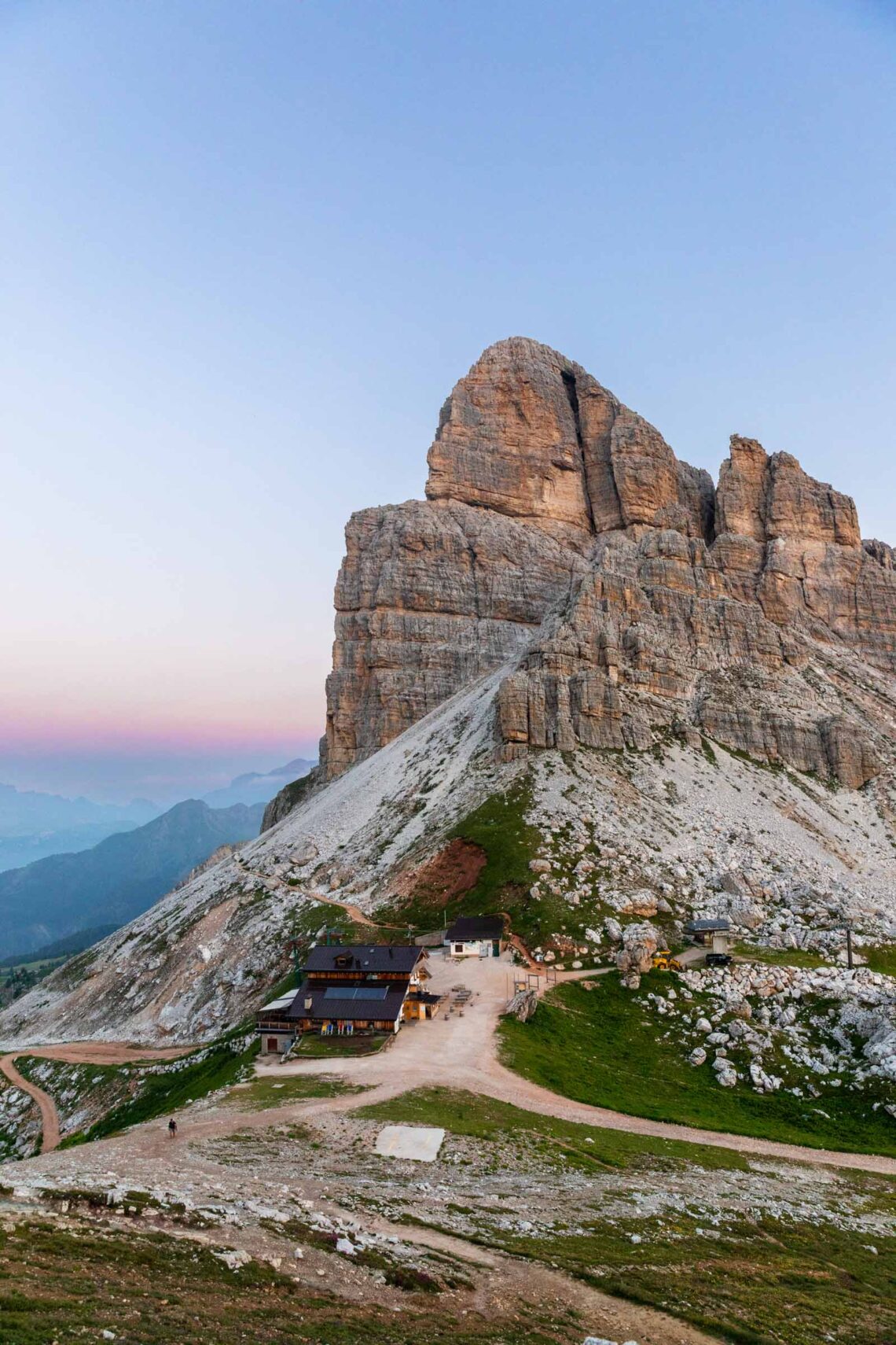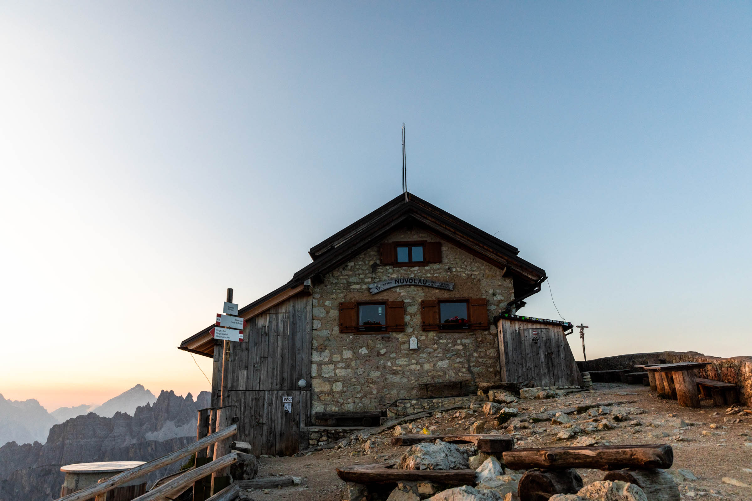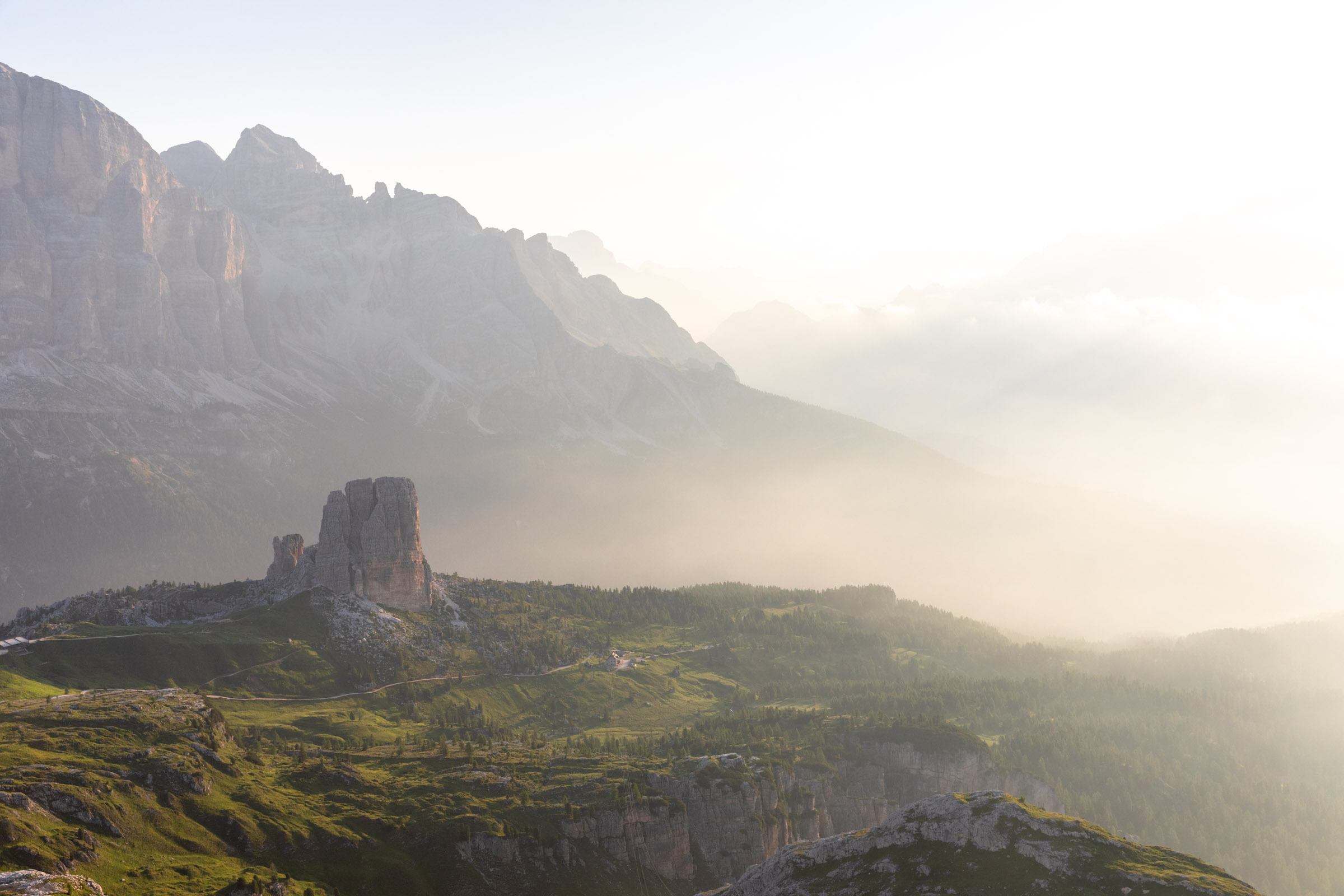 While we had dinner, the clouds quickly rolled in and my hopes for a spectacular sunset waned. I had a great time talking with another solo hiker who is a music producer in Sweden and takes lots of alp trips like this by himself and sometimes another friend who is more often tied down by family unlike this guy. We also had 3 other Germans in our little room and everyone was so nice! However, there were lots of teenagers running around the other rooms which felt a little chaotic. In the morning, I nearly didn’t wake up for sunrise because I thought I saw clouds outside, but I sprinted out the door and enjoyed the golden rays. I pushed forth for a brisk walk all the way up to Rifugio Nuvolau, the objectively better spot for seeing the sunrise, not blocked by any other peaks. This hut gets booked up much quicker and is a little smaller than Averau. Plenty of guests of this hut stepped out for sunrise. Eventually, I picked my way back down to my own rifugio, so as not to miss breakfast. It was still quite early and my bus out from Cortina wouldn’t be until the afternoon.