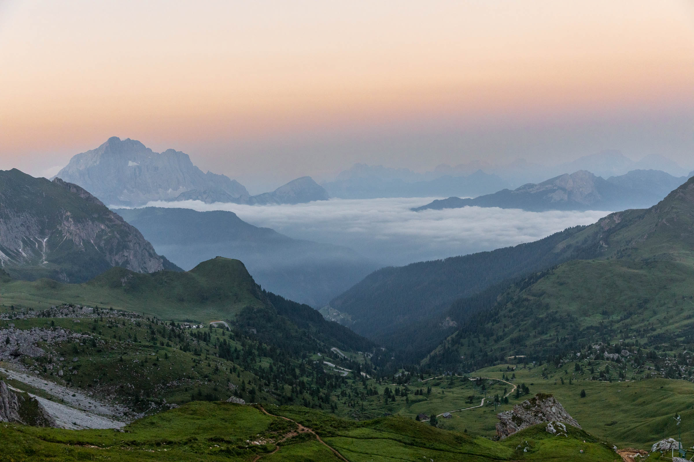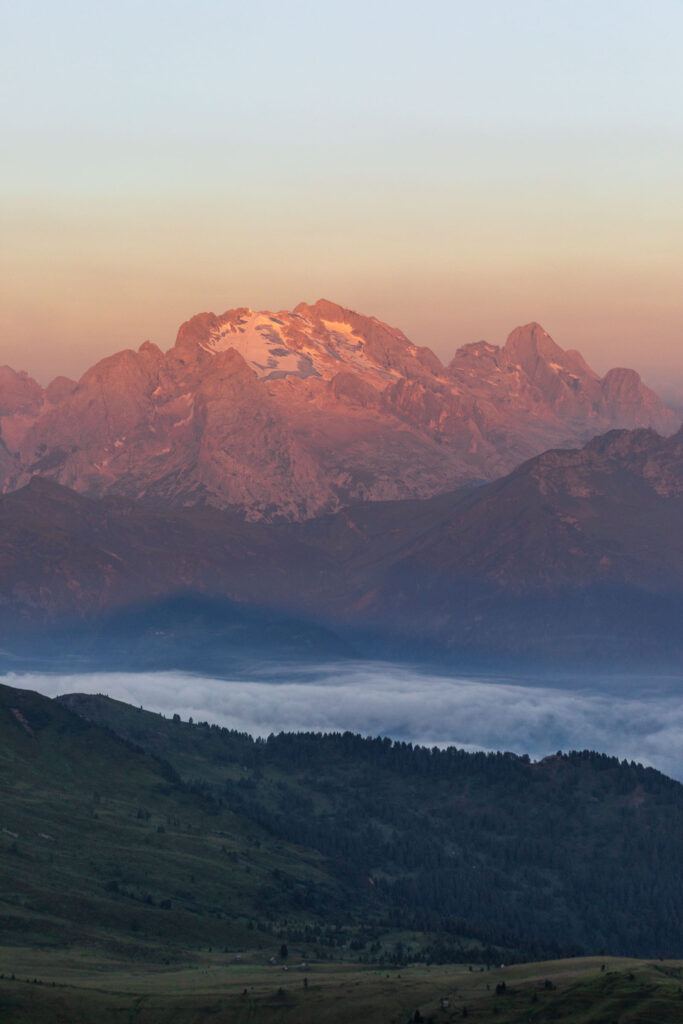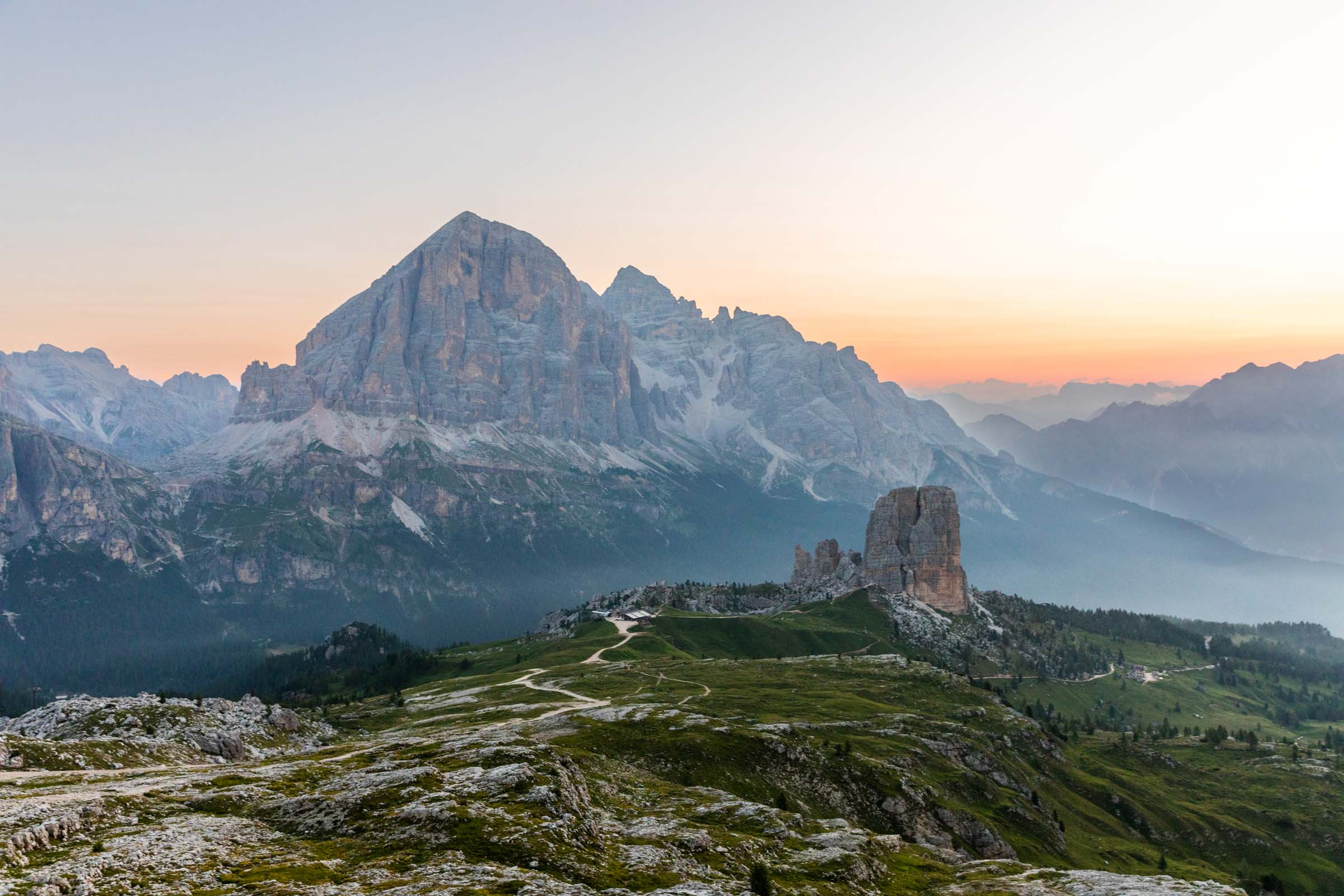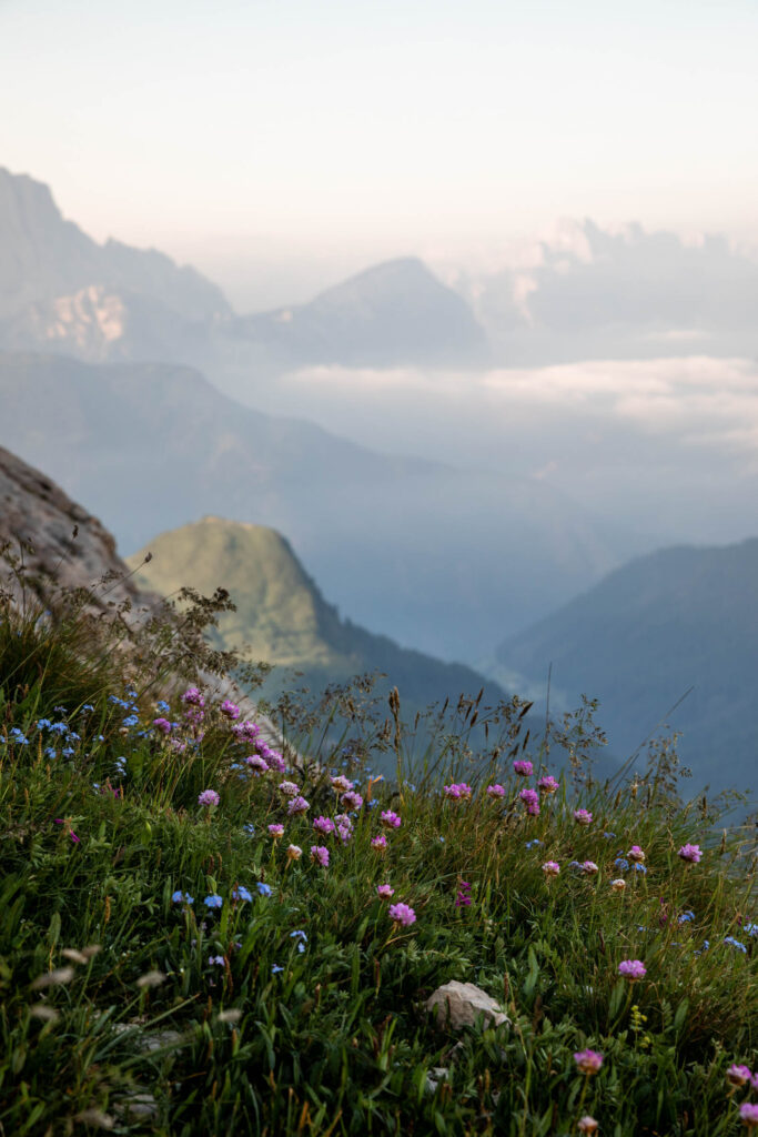 While we had dinner, the clouds quickly rolled in and my hopes for a spectacular sunset waned. I had a great time talking with another solo hiker who is a music producer in Sweden and takes lots of alp trips like this by himself and sometimes another friend who is more often tied down by family unlike this guy. We also had 3 other Germans in our little room and everyone was so nice! However, there were lots of teenagers running around the other rooms which felt a little chaotic. In the morning, I nearly didn’t wake up for sunrise because I thought I saw clouds outside, but I sprinted out the door and enjoyed the golden rays. I pushed forth for a brisk walk all the way up to Rifugio Nuvolau, the objectively better spot for seeing the sunrise, not blocked by any other peaks. This hut gets booked up much quicker and is a little smaller than Averau. Plenty of guests of this hut stepped out for sunrise. Eventually, I picked my way back down to my own rifugio, so as not to miss breakfast. It was still quite early and my bus out from Cortina wouldn’t be until the afternoon.