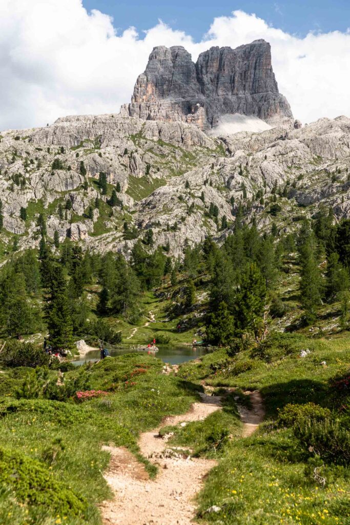 I decided to take a different hike down to enjoy the views and pass by Cinque Torri while also taking a morning nap after so many days of late nights and early mornings. It was cute to see groups of little kids being taken on a hike and also plenty of people watching as people passed near and far. I got to my bus stop early so I took a cappuccino at Rifugio Baita Bai de Dones. Lago Bain de Dones is not remarkable – I just had extra time to walk to it before my bus came. But seriously, what a lovely way to end my time in the Dolomites!