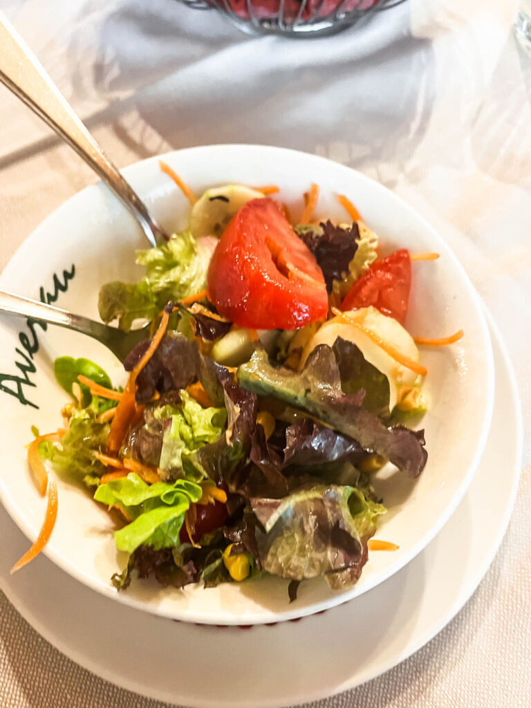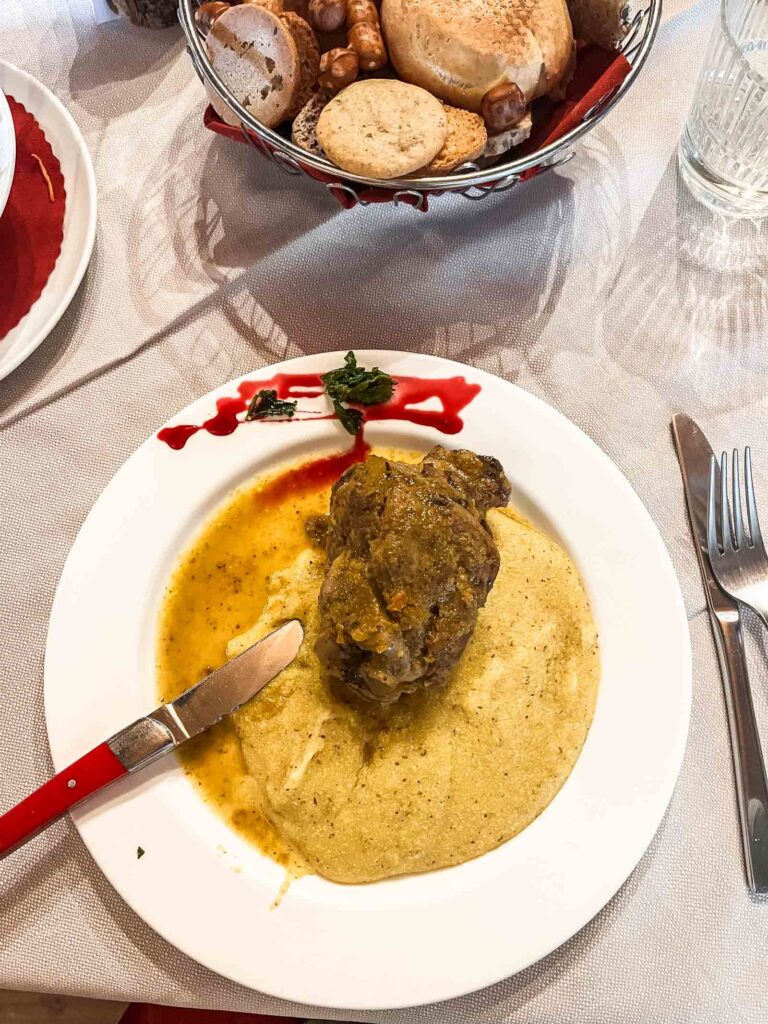 Coming over the ridge, I got a great view into the rest of the Dolomites outside of the Cortina region. THere’s still so much more to explore! This was a fairly leisurely hike with minimal gain, but getting to what would be considered at altitude. The first few huts I saw were beneath in the valley – I recommend booking huts that sit higher for better views, but there are plenty of huts if you look for them (on a map). Then I saw Rifugio Nuvolau which looked so impressive sitting on top of a sheer cliff to one side and a gently sloping ridge on the other. Rounding the corner, I eventually saw my home for the night and it was most impressive. The outside and inside were far more impressive than any of the other rifugios I’d been to. It also opens in the winter and is easily accessed by multiple lifts, so that probably why it was built to be more luxurious. It was so neat that it offered free wifi, hotel slippers, really clean rooms, and you had a huge selection of food. Since the room and board covered any meal, I naturally picked the more expensive offerings. It was the most expensive rifugio after all!