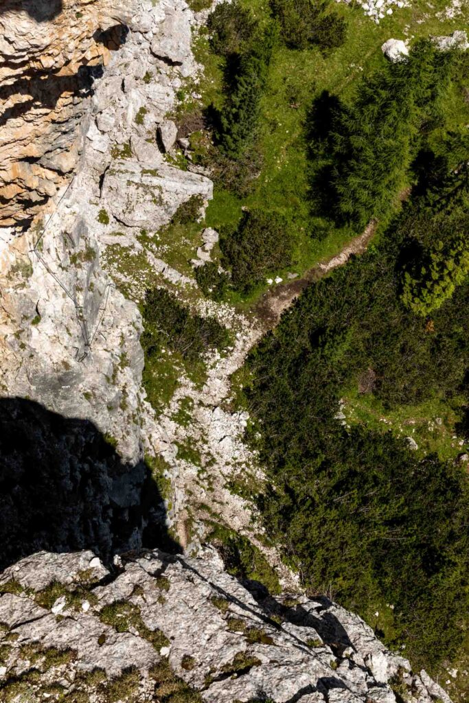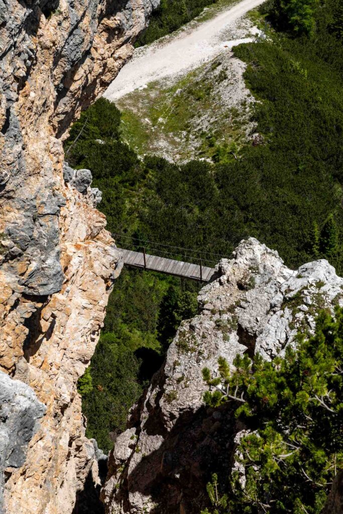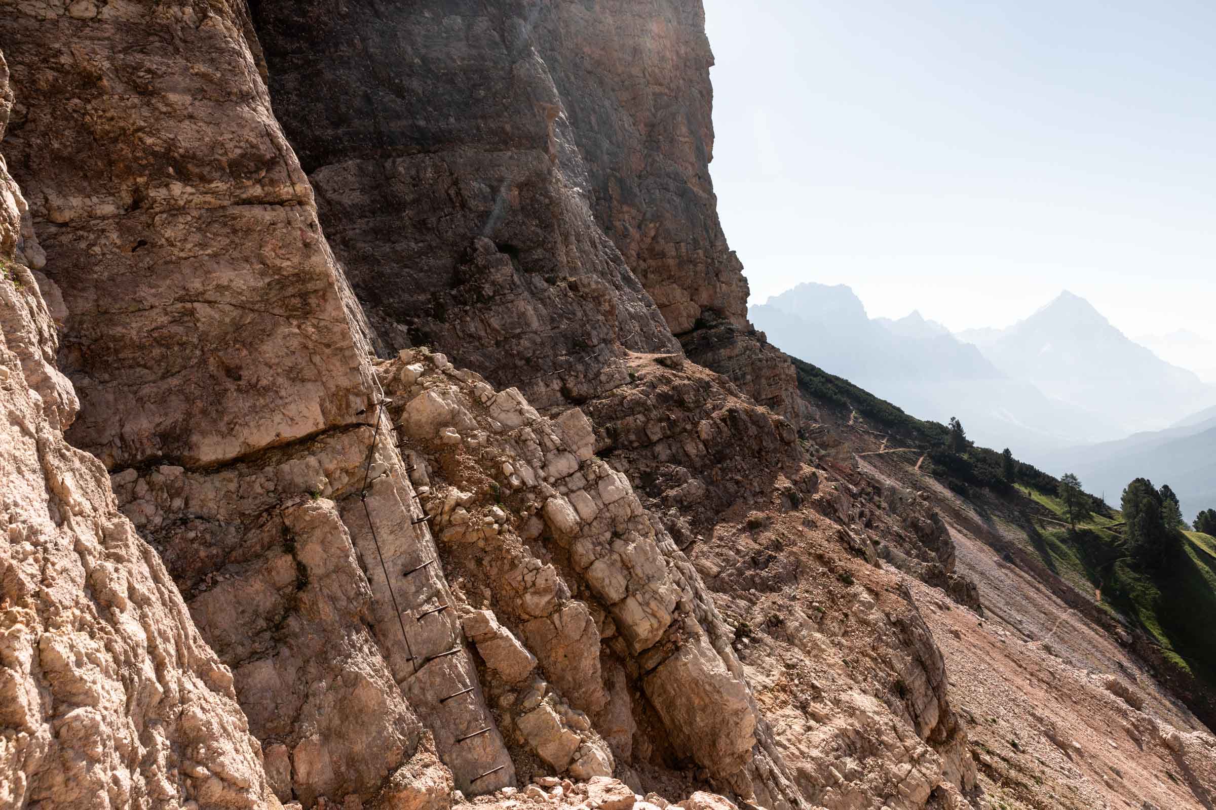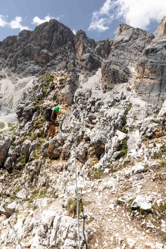 It took a little bit of effort to realize I needed to walk right and around to the base of the cliff. I hear that there are guided trips to do this half day (or shorter) via ferrata for those who are new or wanting more guidance. I thought this would be so easy but I was pretty wrong. If you’re taking it properly, you’ll be doing some 4th class moves – good thing you won’t fall too far when you’re clipped up with your harness. I felt like a lot of the early moves felt like sport climbing. If you fell, you wouldn’t fall too far, but you’d far as far as your via ferrata lanyard stretches plus how far you are from the previous anchor. So, it’s kind of important not to lose your grip. I still had my heavy pack on, so I powered through the sections rather quickly. Once I got above the steepest parts, I could enjoy the views and the route better. Two people were just ahead of me and I took my time (although taking your time as a solo climber is still relatively speedy). There were two fun bridges that rivaled the one I did the day before on Ivano Dibona, although short it still had a lot of empty air beneath you. I would’ve loved to have done this with someone else for more pictures showing the scale. But it was still super fun alone.