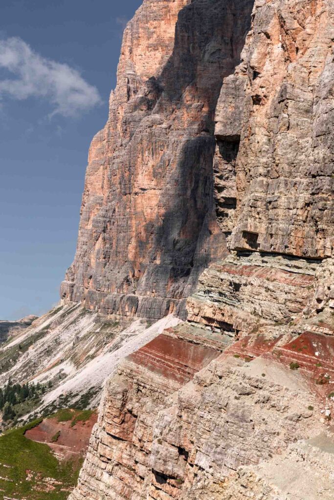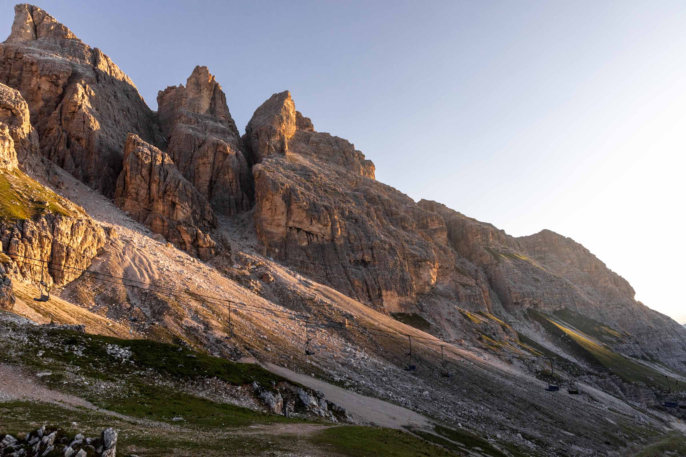 Taking yet another lazy day (seems like an every-other-day thing for this trip), I opted to take two lifts up to the base of via ferrata instead of hiking. It was worth the fairly low price cost and I felt no need to hike extra for similar views. No need to push my body too much and work out a specific amount. I walked over from the bus station to the base of the Col Drusciè gondola, riding above all the green larches. For just 12€, I would skip 1850 ft of gain, of trail I had done before a few years back, checking out Ghedina and Fiames. Descending half a mile and 300 ft, I was quickly at the base of the next lift from Piè Tofana to Luca d’Aosta. If you want a quick snack break, stay longer at Col Drusciè! This time 10.5€ saved 1400 ft of gain! Worth it for these tired legs of mine. This lift puts you right at the base of either climb. The climb looker’s left of the next lift to Pomedes is Ra Pegna. And the cliff band to the right is Ra Bujela. Take your pick!