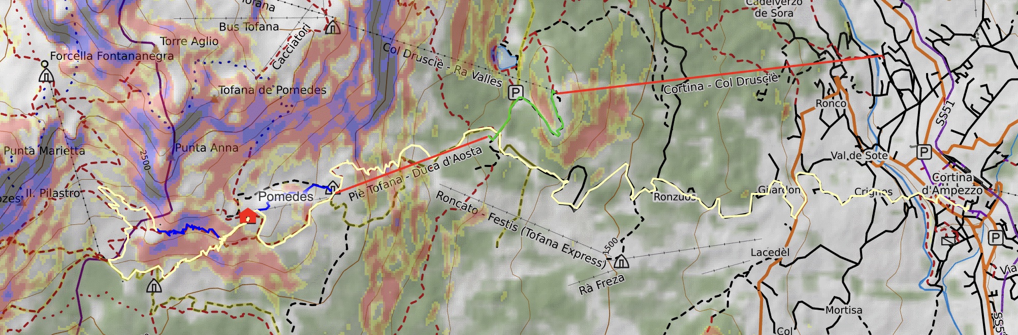 - Getting there: For the Ferrata Ra Bujela, you can hike from town all the way up or take a series of lifts from Col Drusciè to the Duca d’Aosta. Alternatively, if you have a car, drive to Rifugio Angelo Dibona and hike a short distance to Rifugio Pomedes and back to the base at Rifugio Dura d’Aosta. For the Sentiero Astaldi, begin at Rifugio Angelo Dibona. I started from Rifugio Pomedes since I was already there and linked the two trails.