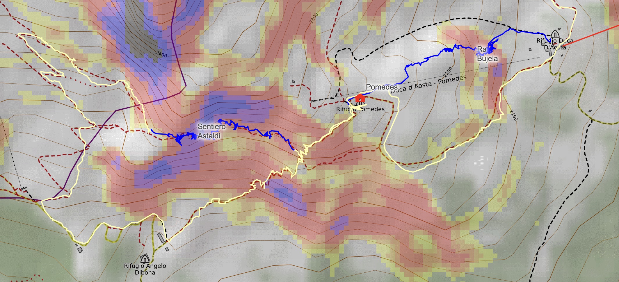 - Sentiero Astaldi: rated 1A, likely the easiest via ferrata in the Cortina region, basically a hiking trail that gets narrow at times, but essentially no climbing involved. The loop including Rifugio Pomedes is 800 ft gain and 3.5 miles (a little less starting from Rifugio A Dibona)