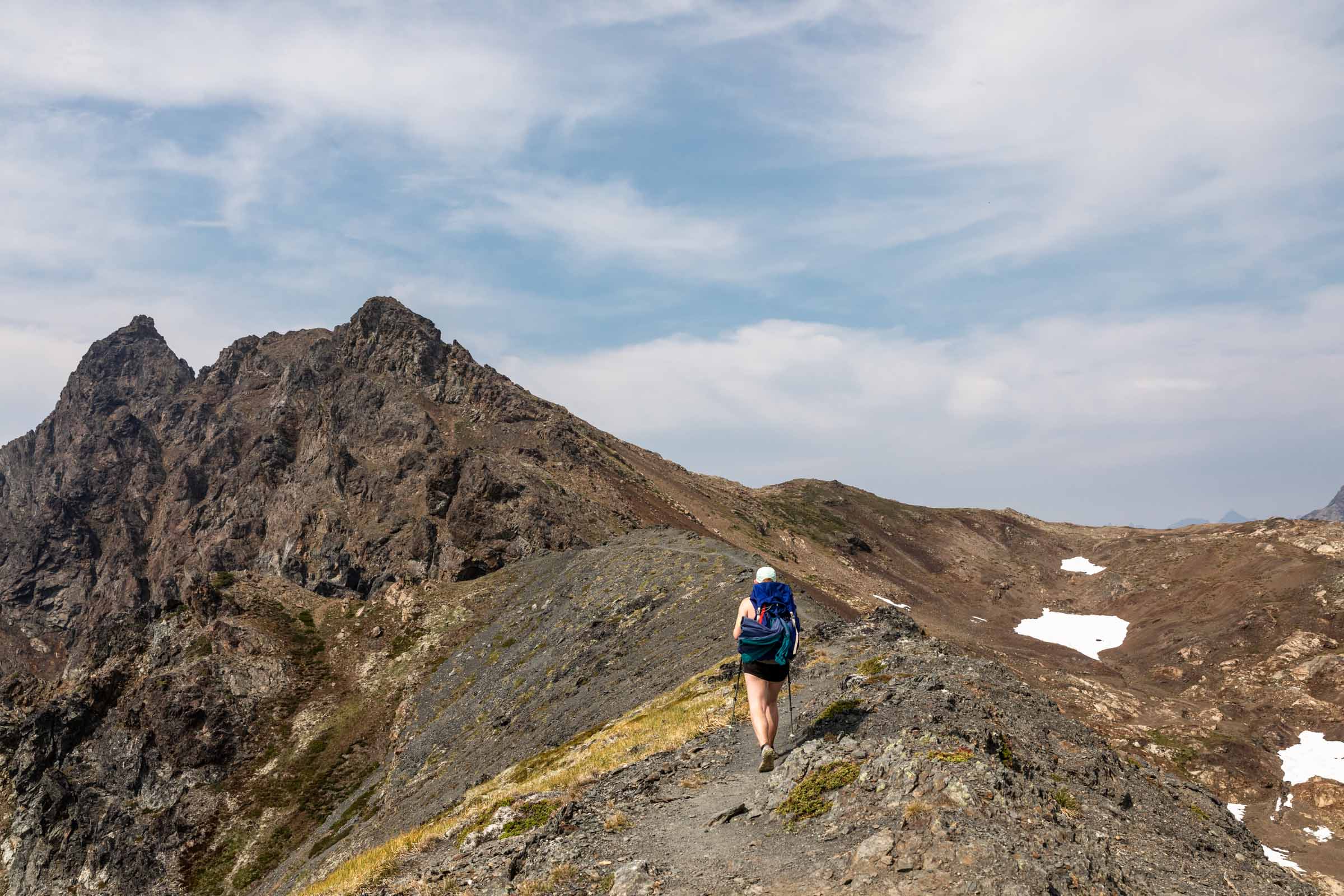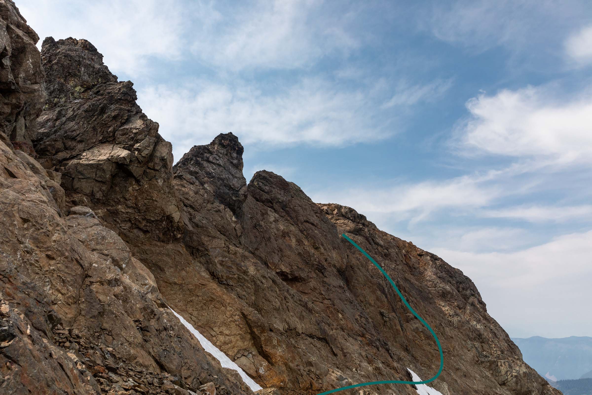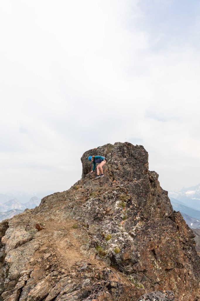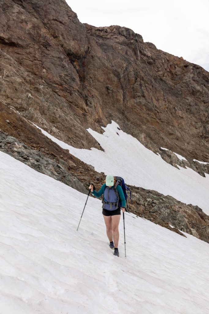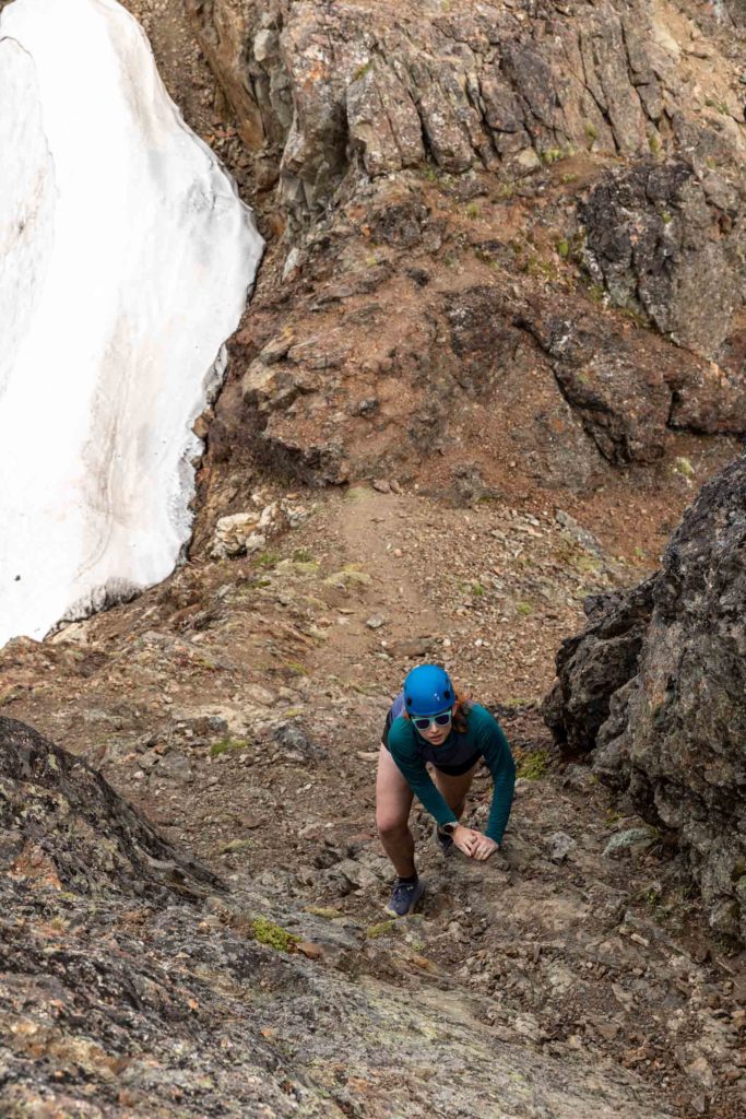 The trail continues fairly distinctly over relatively mellow terrain with a couple ups and downs, the biggest being a 200 ft descent on your way up to Tomyhoi. The trail then takes you up on a spine and wanders itself across a pile of choss. Keep following it across the snow (as opposed to up the ridge where you’ll likely get cliffed out. Depending on season, the amount of snow will vary, but for us we didn’t need any snow gear and poles were sufficient for the soft layer of snow. You might see 3 fingers of snow, or they might be mostly merged or melted out. Cross the 3 dips until you see some cairns that lead up a class 3 scramble on solid rock. The path takes you west (left of ridge) on a trail until you reach the false summit. From here, it might look like the true summit is impossible, but you have to trust that what looks entirely vertical has great steps all the way up. Sometimes you can use the coloring on the rock to see where other people have stepped. It weaves its way directly up the rib and to the right. It may feel a little exposed for a move or two, but it’s all sill just class 3. Traverse above a gully and keep taking the path left around the ridge. The scramble continues on the ridge and the the true summit. Beyond the summit is a lovely place to hang out as well! We did not find a summit register here though.
