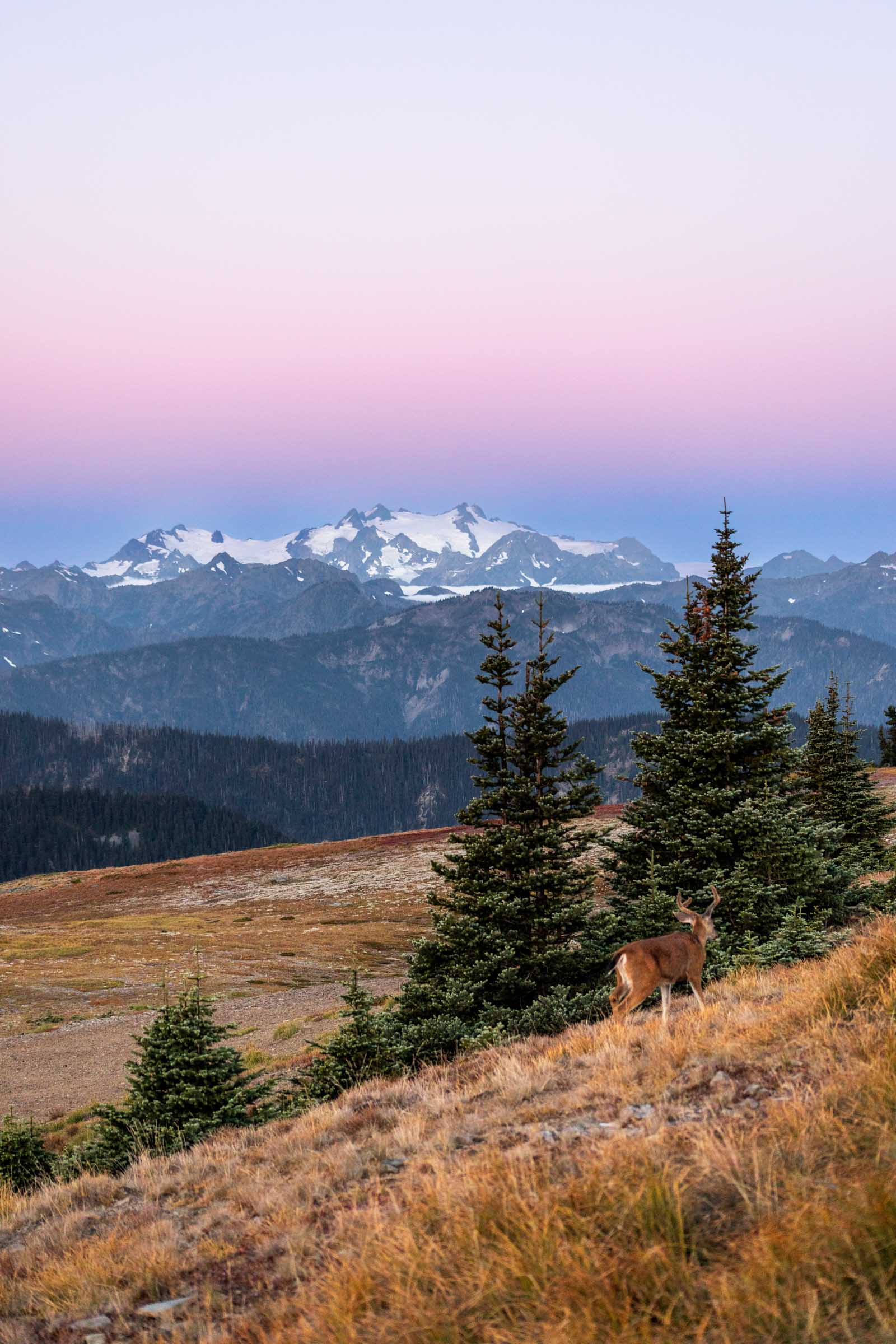 For sunrise, start by driving towards Port Angeles and grabbing a coffee and pastry at one of the many cafes in town! Enjoy the most northern section of the PCH – the famous Pacific Coast Highway, most known for its stretch along California, but it actually wraps around the Olympic Peninsula. From the highway, signage is obvious for approaching Hurricane Ridge. It’s about a 40 minute drive from town to mountain. If you’re not afraid of driving along a cliffside, keep going to Obstruction Point Trailhead for even better views of Mt Olympus, the tallest point in the peninsula. Otherwise, take a stroll along the trails near the visitor center (currently closed due to fire as of 2023) to Hurricane Hill or the Klahhane Ridge.