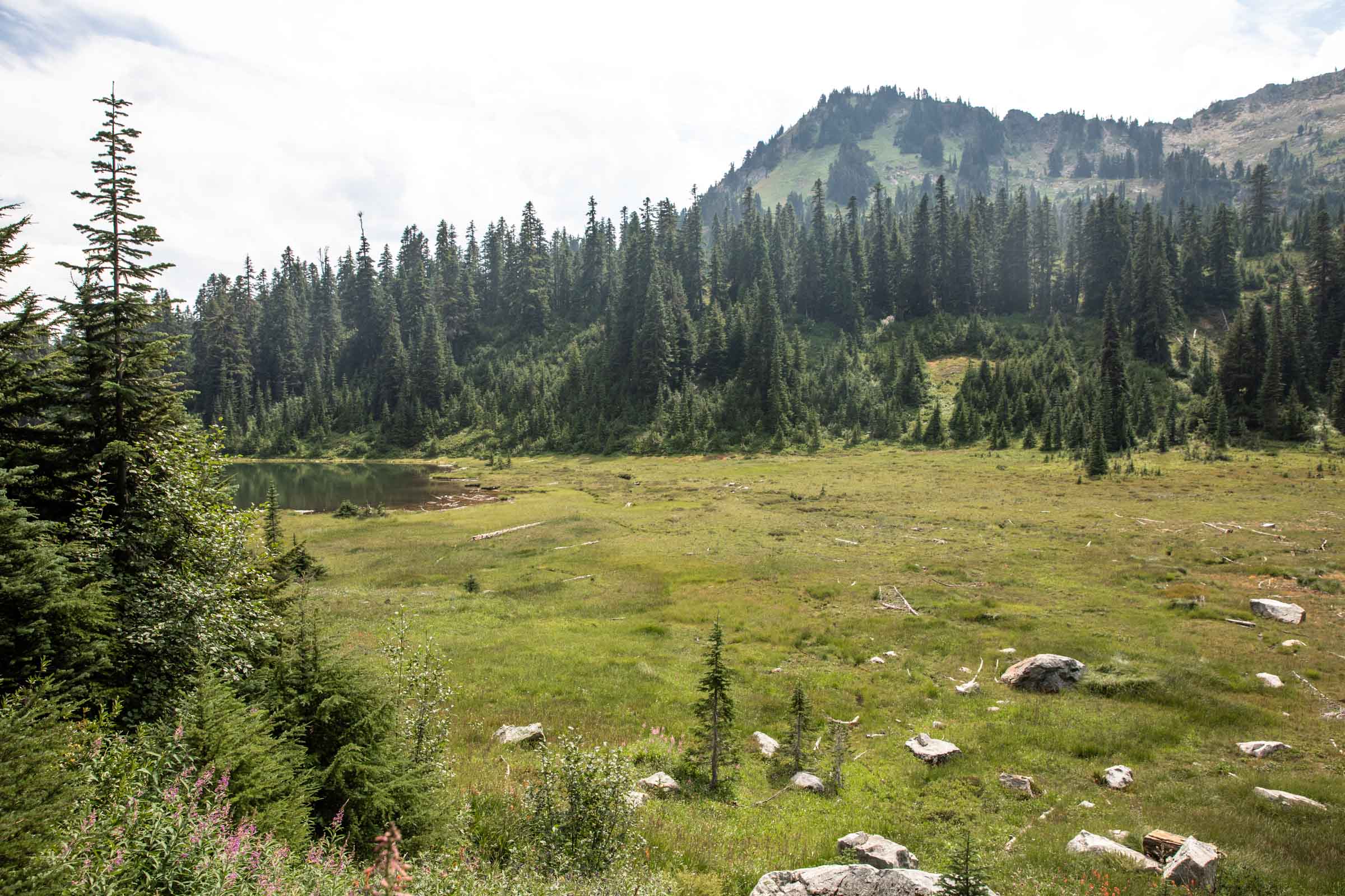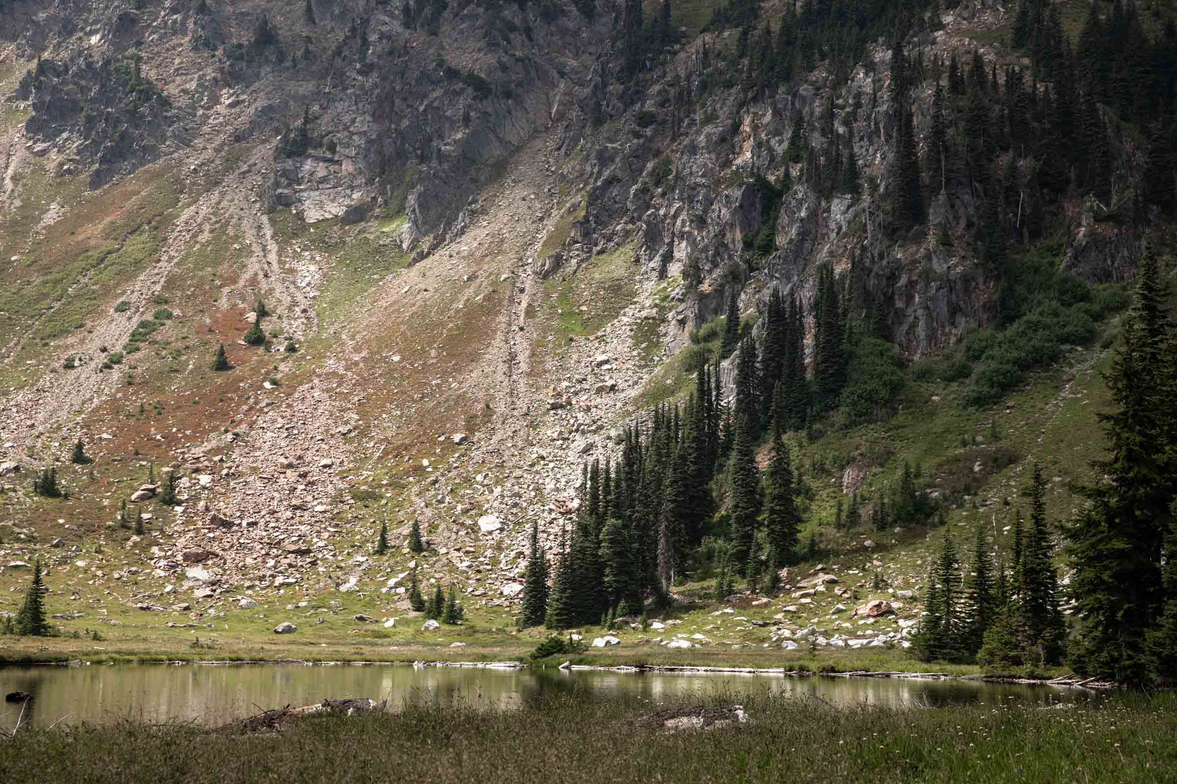 Descending Mount Howard was much more difficult than I had anticipated, likely due to a lack of research on my part. So good for you if you’re reading this far!! The gist of it is to aim downhill toward crescent lake. There’s 2 mandatory steep sections. For about 800 ft, it should be mellow open meadows that are fun to walk down after you pass the initial boulder field. Then it gets a little tricky following which gully. We picked one furthest west and what felt like blindly tumbling down the mountain, we made it down section by section. Following old tracks only took us so far – I highly recommend challenging your instincts, see if a path works, if not, don’t go down too far before you can’t get back up and around again. The last 100 ft of descent to Crescent Lake felt like mandatory bushwhacking. At least a majority was through super soft and gentle fireweed bushes and then a tunnel of alder branches that was manageable. It was entirely laughable!