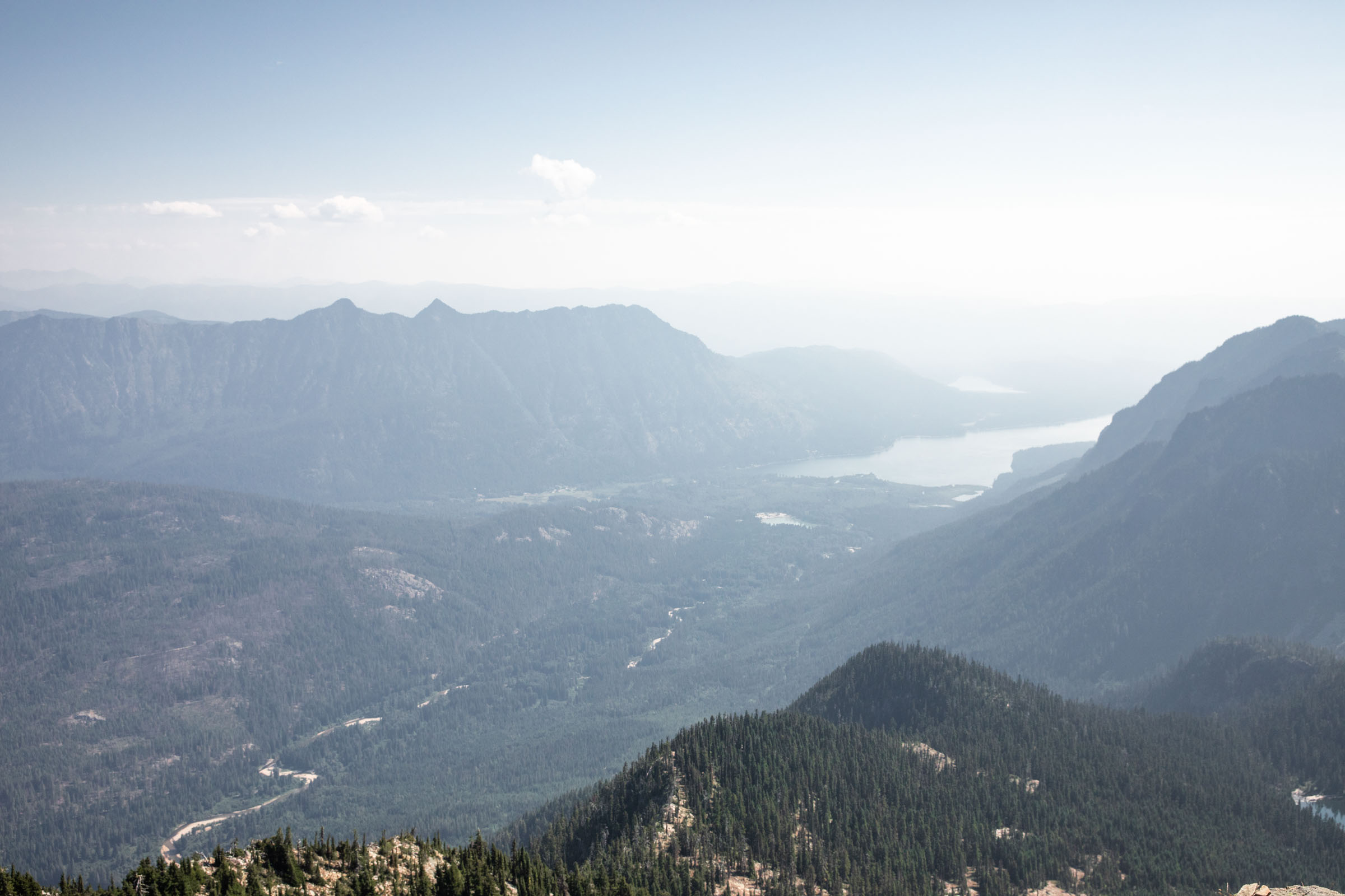 After a quick lunch break, we pushed onwards. We descended Mount Mastiff as close to the ridge, again as much as possible. We tried avoiding the trees and maximized rocky terrain for less bushwhacking. There were great views of Canan Lake to give you motivation! At the saddle between the two peaks, we started to pick our way uphill again. The lower angled terrain made it seem easy to travel on. There were a couple light spots to navigate through trees and cliffs, but all very manageable. The last 200 feet or so felt a bit more like scrambling on boulders and talus. Helmets are good here! There are faint paths you can follow or you can choose whichever way, though probably the least steep method. It naturally pushed us a bit south of the summit where we gained there ridge a short couple minutes to true summit of Mount Howard.