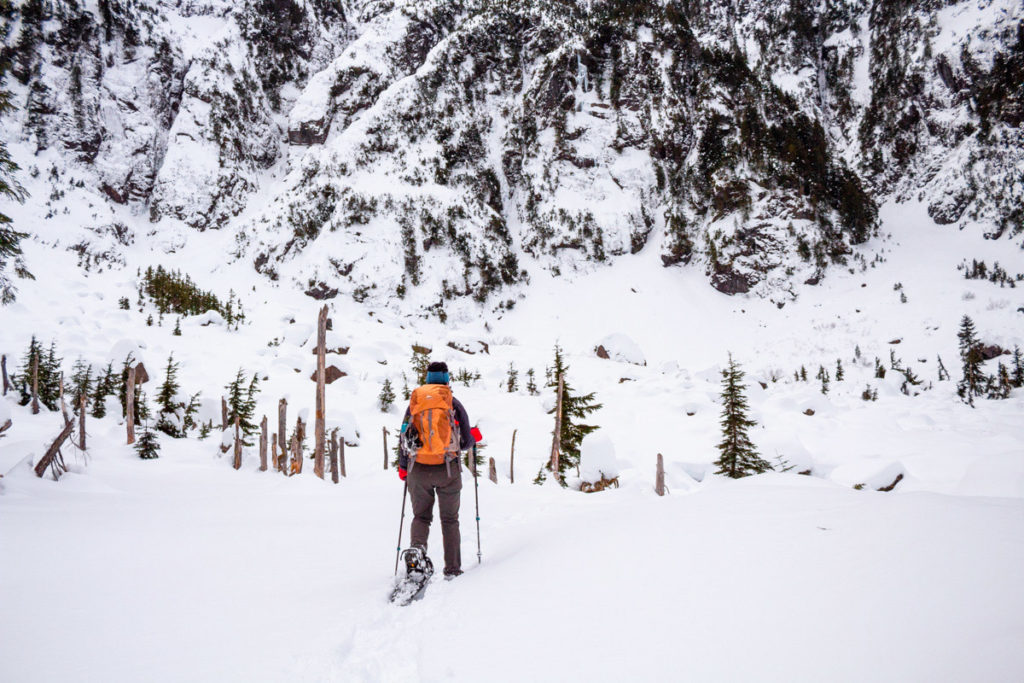 - Winter hiking: When you can still hike on trails but sometimes they might be snow covered or a little icy. Many of the popular summer trails are still hiked in the winter (except those that are under avalanche terrain ahem Snow Lake in Snoqualmie is a bad choice for example) and the trail gets packed down enough you don’t need much equipment other than good footing. I’d highly recommend investing in some microspikes and hiking poles for stability and traction though. For more about hiking in the winter check out my guide here.