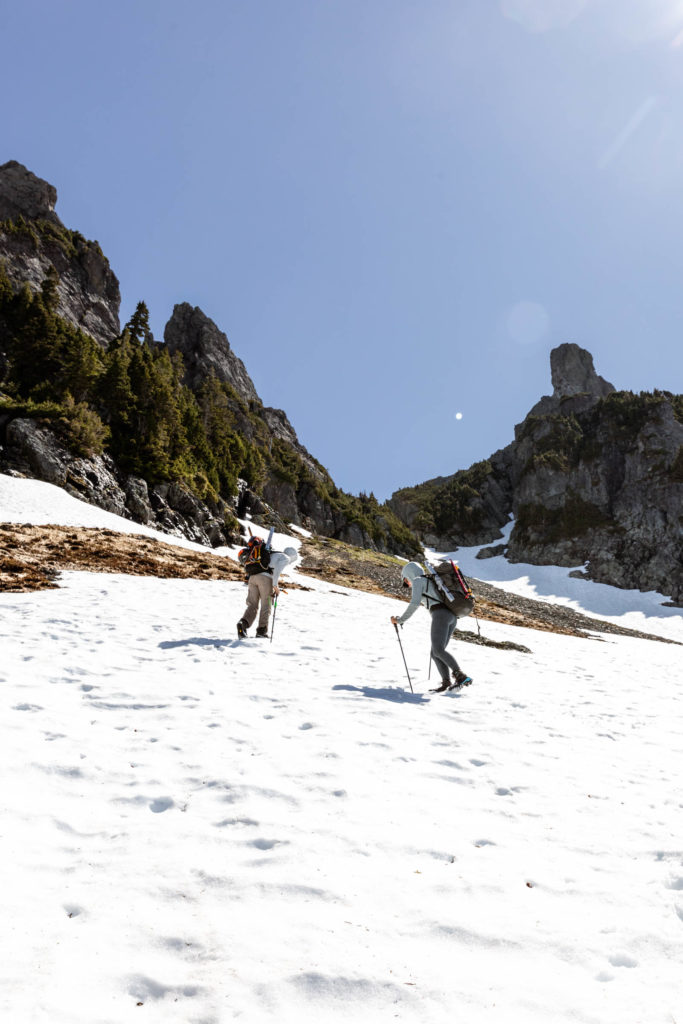 When we arrived at the trailhead, we were surprised to see another car. We wondered why their packs were so giant like an overnight pack, but turns out they were paragliding. To cut the chase, we never saw them again and the only evidence of them was the boot pack they made which melted out over the day and also their flight path from near the summit. You could see how the foot prints look like someone running and then they disappear into thin air. Must’ve been a beautiful flight!