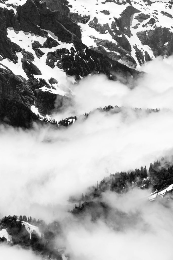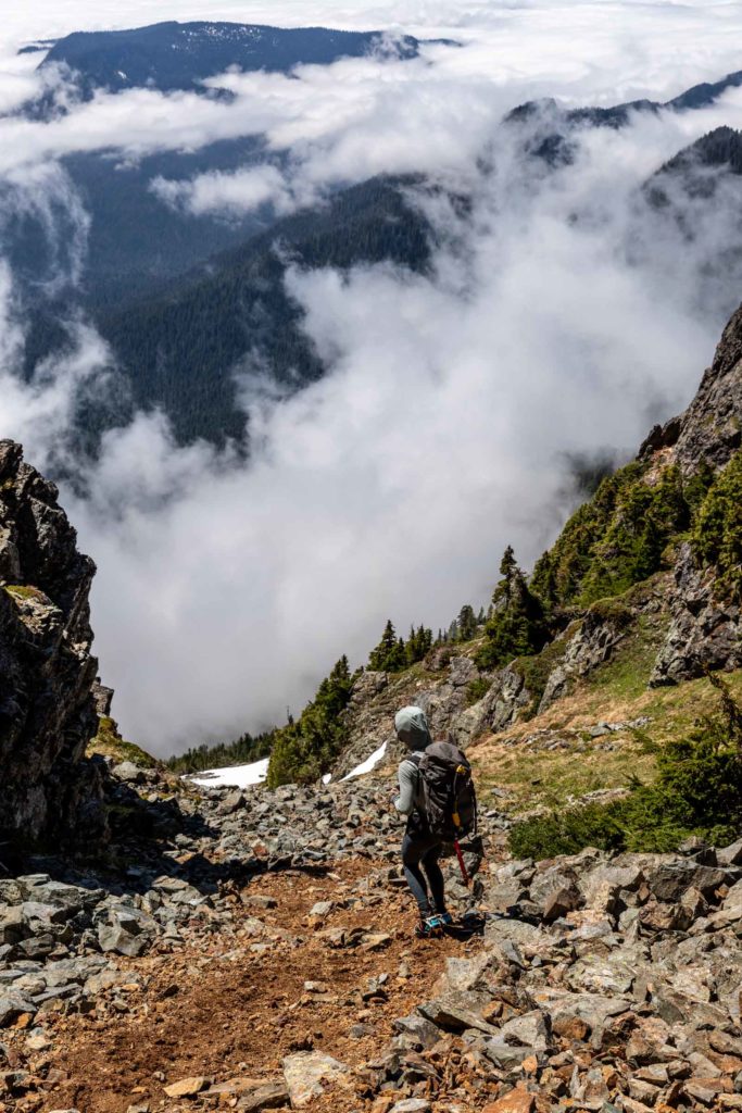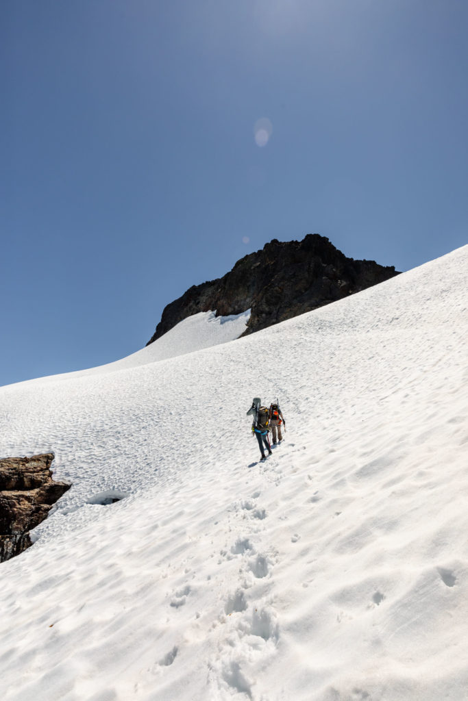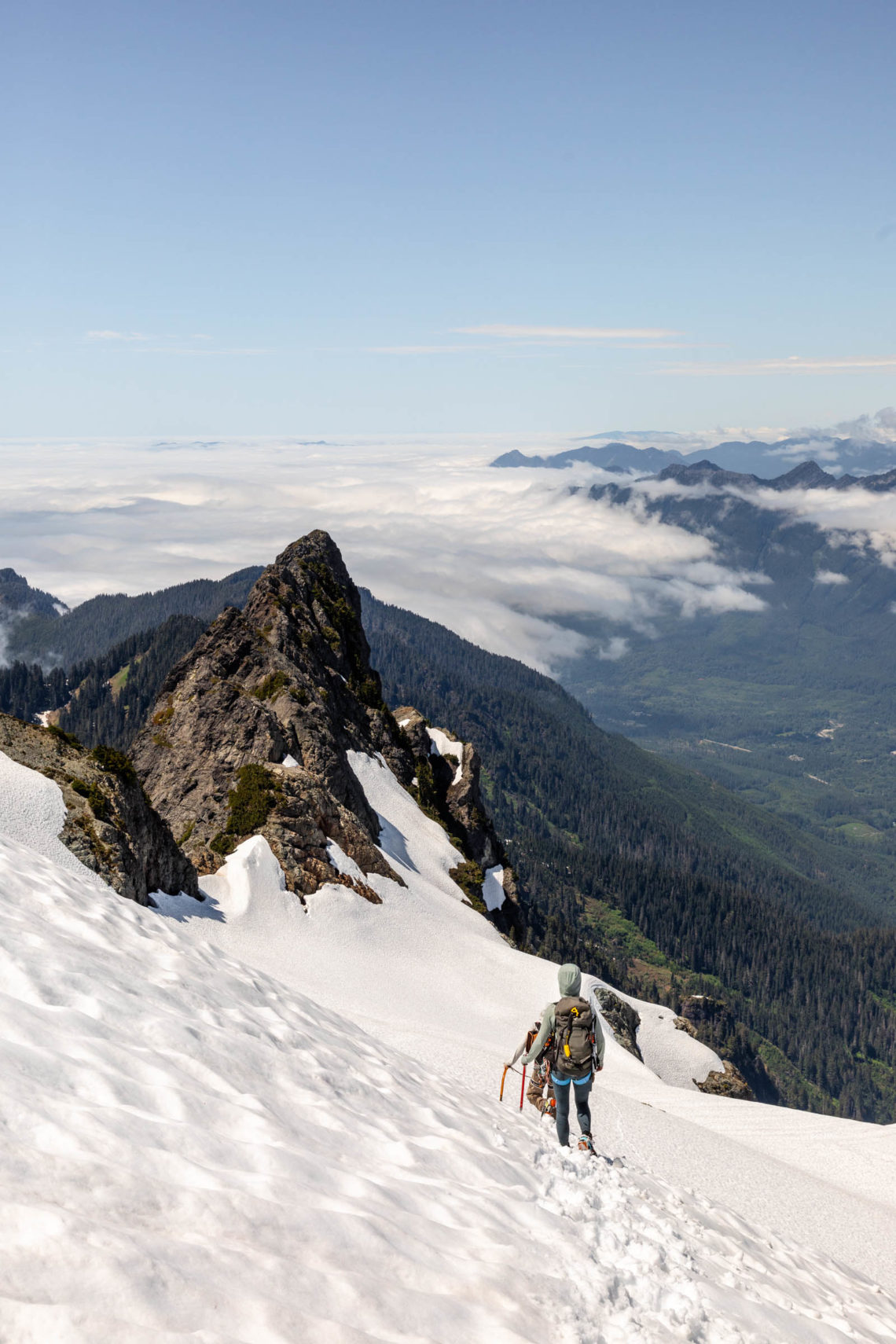 Memory already fades, but the mountaineer’s beta is pretty accurate. You “make a long rising traverse” and yes, it’s long. What all it entails, the pictures show a little here and there. We ascended until we were under the main gully where snow still funnels up. We took turns leading and eventually got onto dry land and quickly made our way to High Pass. From here the views were already incredible. The marine layer was starting to lift and you can see peek-a-boo views from Darrington and the land below. Mountains peaked above the clouds and it was layers on layers. From High Pass, we put on crampons for some extra traction and our glacier gear as a precaution. We did not feel a strong desire to rope up, so we left that in the bag.
