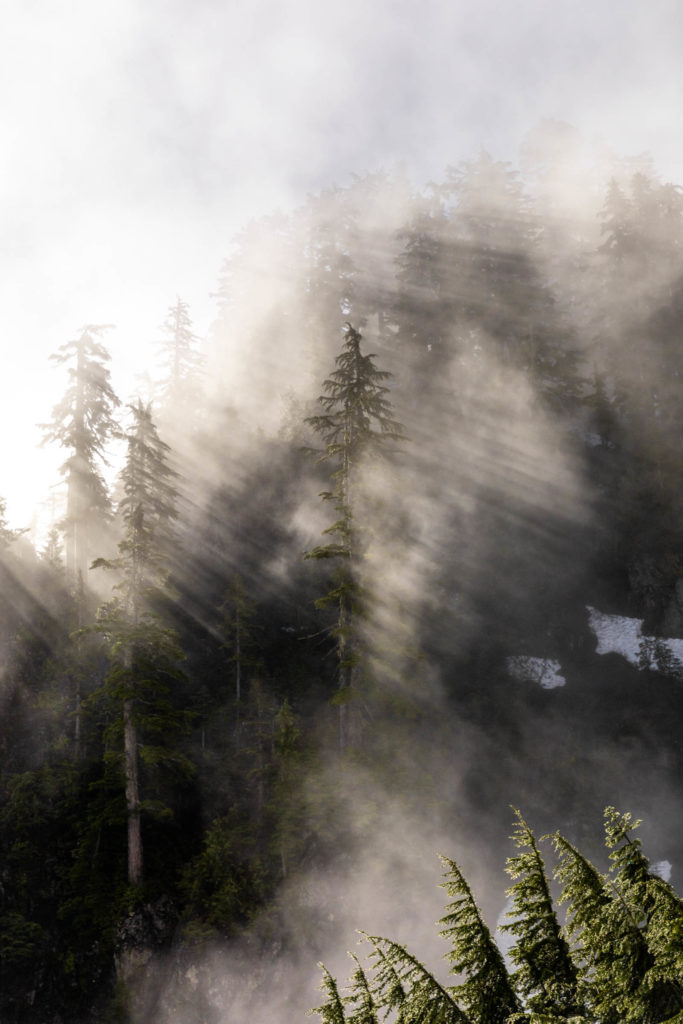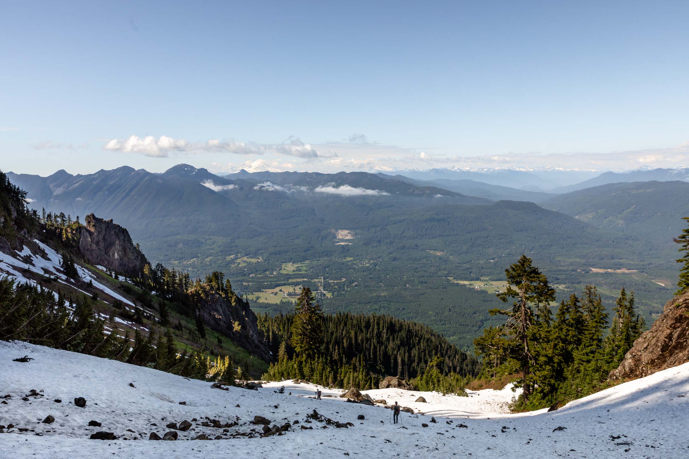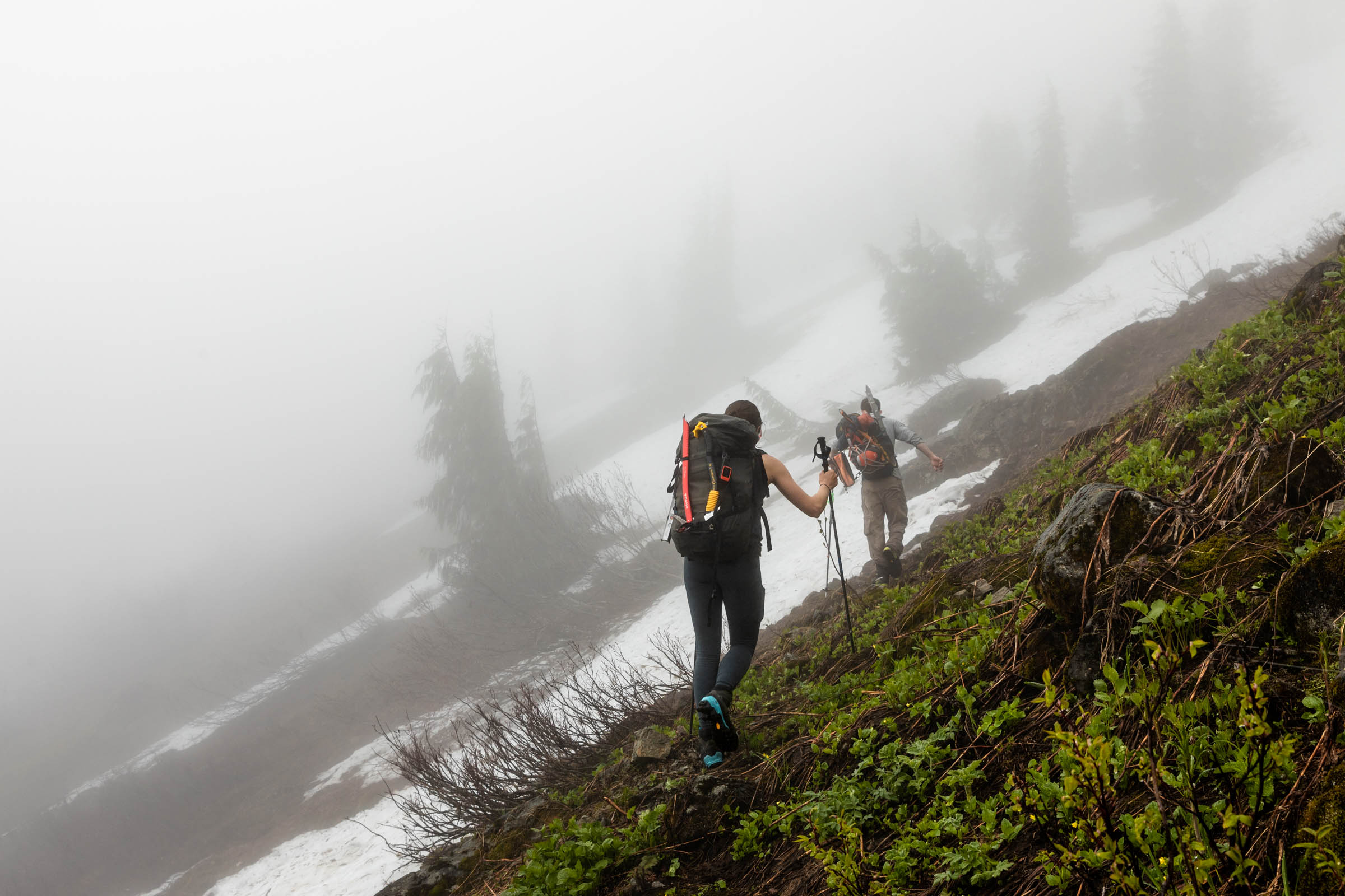 Memory already fades, but the mountaineer’s beta is pretty accurate. You “make a long rising traverse” and yes, it’s long. What all it entails, the pictures show a little here and there. We ascended until we were under the main gully where snow still funnels up. We took turns leading and eventually got onto dry land and quickly made our way to High Pass. From here the views were already incredible. The marine layer was starting to lift and you can see peek-a-boo views from Darrington and the land below. Mountains peaked above the clouds and it was layers on layers. From High Pass, we put on crampons for some extra traction and our glacier gear as a precaution. We did not feel a strong desire to rope up, so we left that in the bag.