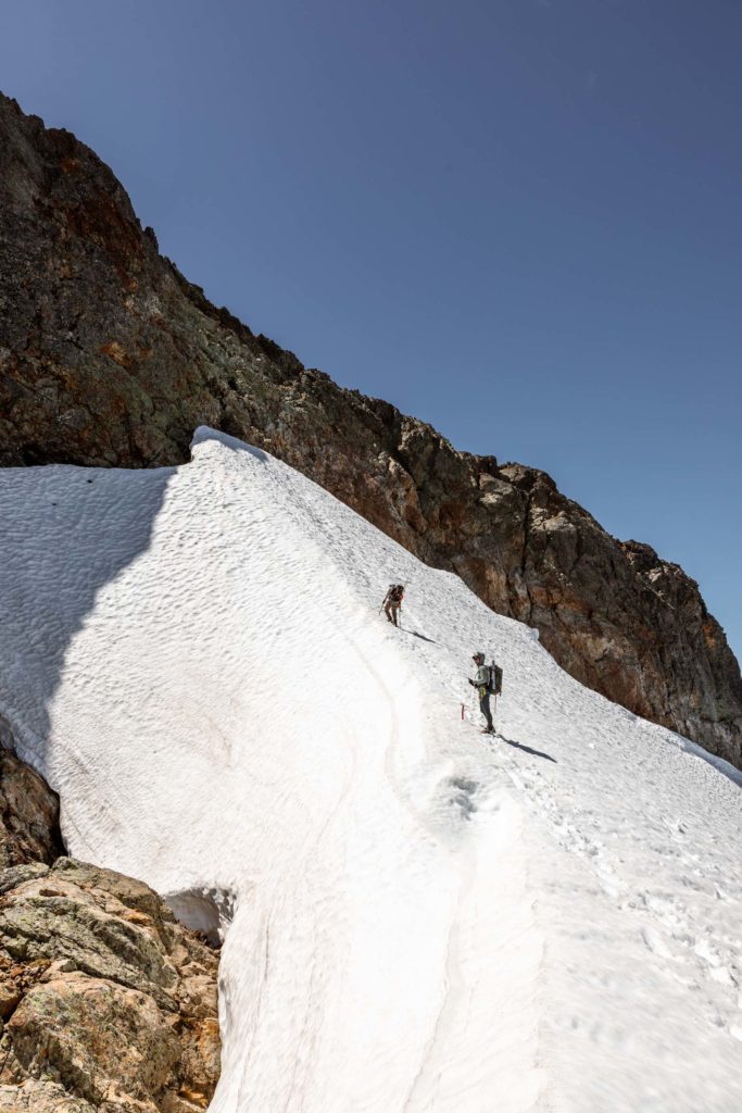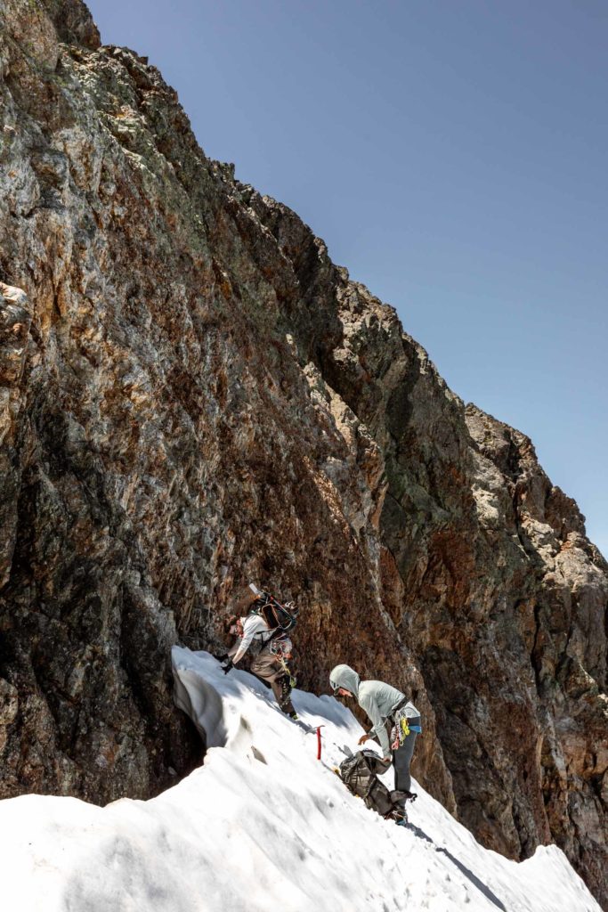 As we ascended the So-Bahli-Alhi Glacier, we eventually saw the flight tracks of the paragliders who were long since gone. We continued up the edge of the snow to view the moat. The moat itself was quite large, you’d have to go inside to access the rock where it’s opened up. Luckily there was one sliver of snow that still hung on to the rock. We made that our starting point for the scramble.