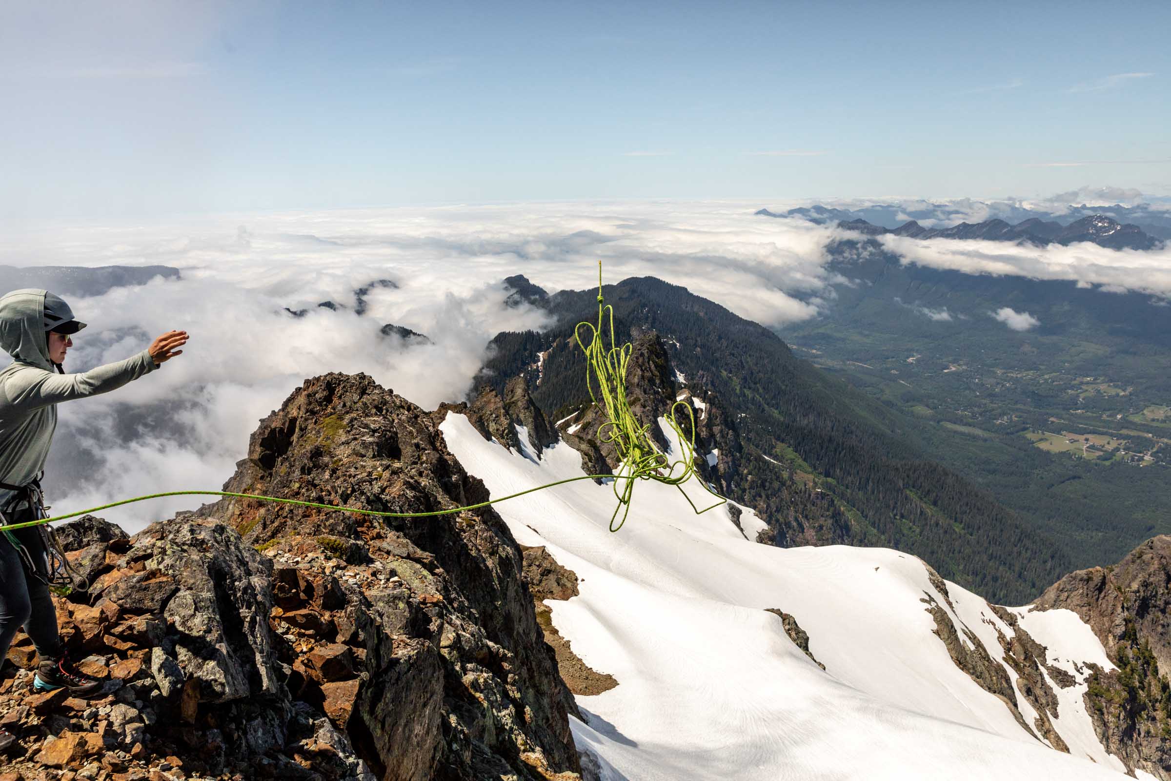 Sadly we couldn’t just stay on the summit forever, although we really wanted to. With just enough time for pictures and refueling our bodies, we started to prepare for our rappel down to the snow. Thankfully our 60m rope was just enough to double strand rappel down to the snow. Wait a week and you’ll need a 70m (or maybe more than a week depending on weather). The summit block has a bunch of loose rock that we had to be careful navigating or risk flying rock towards people.