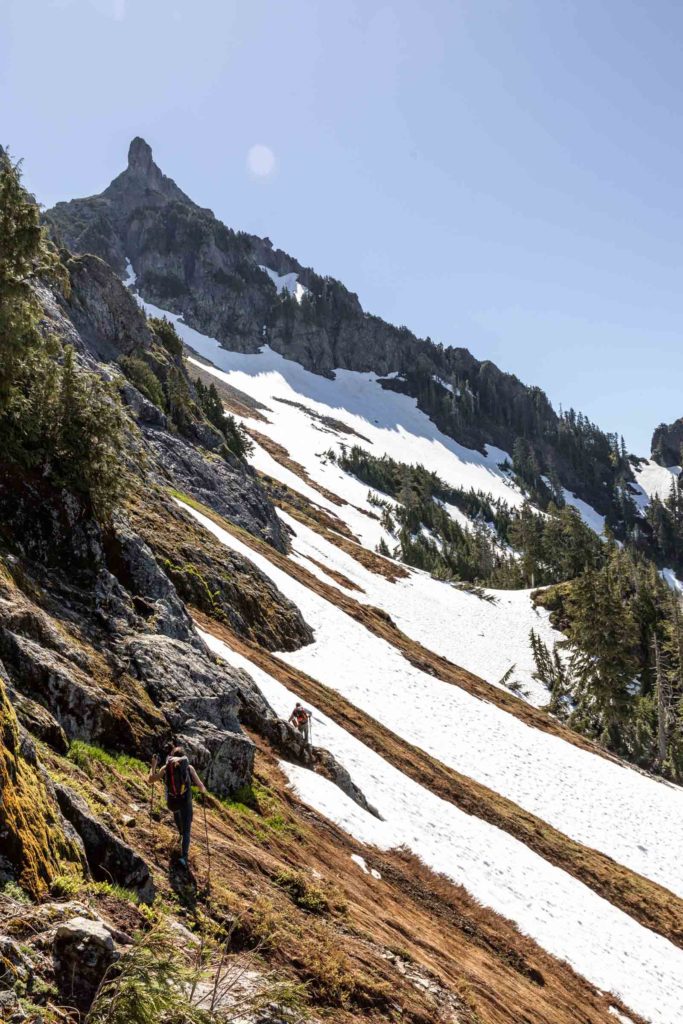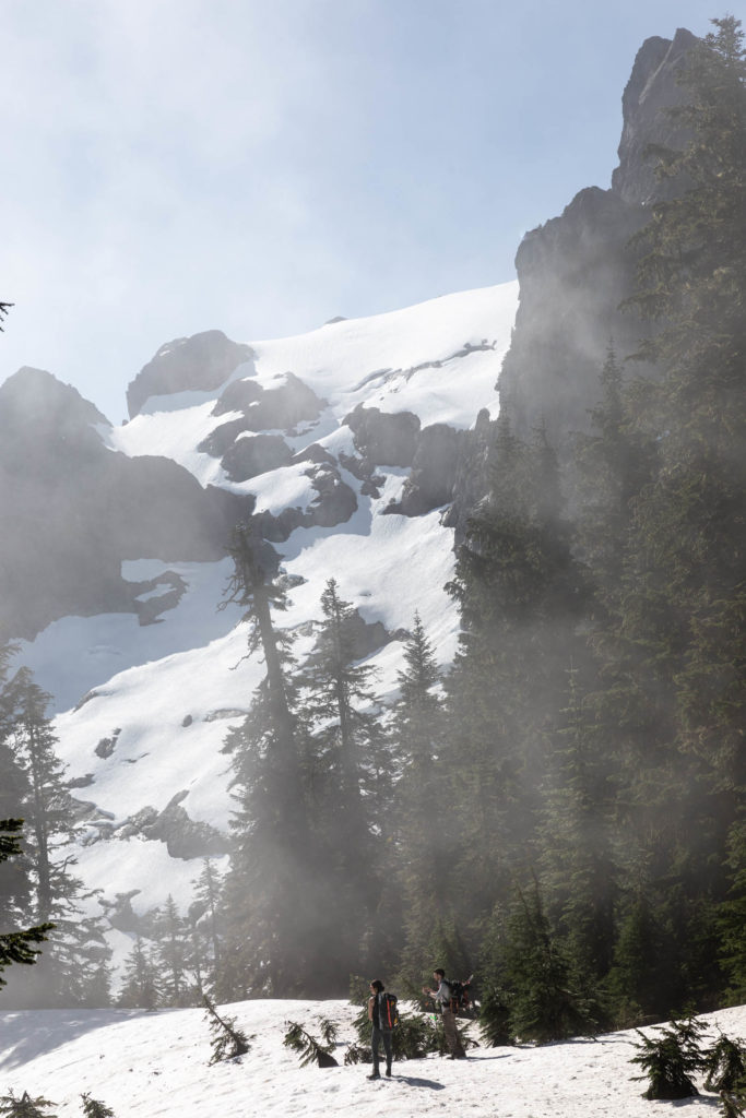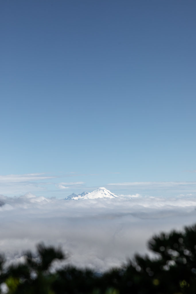 Traversing under the ridge cliffs, we found our snowy ascent to Lone Tree Pass. There were many trees, so I’m unclear why it was named Lone Tree Pass unless it was from eons ago. Up till now we were in clouds but at the pass, we just surmounted the marine layer and a lovely view of Mt Baker appeared before us. This is a great snack break point before you traverse the ridge. The ridge is actually a lovely walk, not overgrown and fairly flat. We were still in and out of snow until we broke out of the trees and really saw Whitehorse in its entirety. It was magnificent and the number of times we said “wow” could not be counted between that and all the other cascade peaks surrounding us.