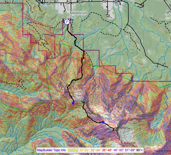 We started at the Niederprum Trailhead and followed the gentle grade for a mile before taking the trail straight up the forest. There’s a trail register! The trail is slightly overgrown in places but is honestly quite good for a fairly unmaintained trail. However the main trail will disappear part way up to Lone Tree Pass. If you go late season, you’ll likely find a good use trail that’s fairly faint but helps reduce the amount of sidehilling. We were in and out of snow and my choice in using trail runners started to be a less ideal decision. I like having light footwear but my non-waterproof shoes weren’t the best. On the other hand the other two wore mountaineering boots the whole time and still got water into their boots. What’s best? Who knows.