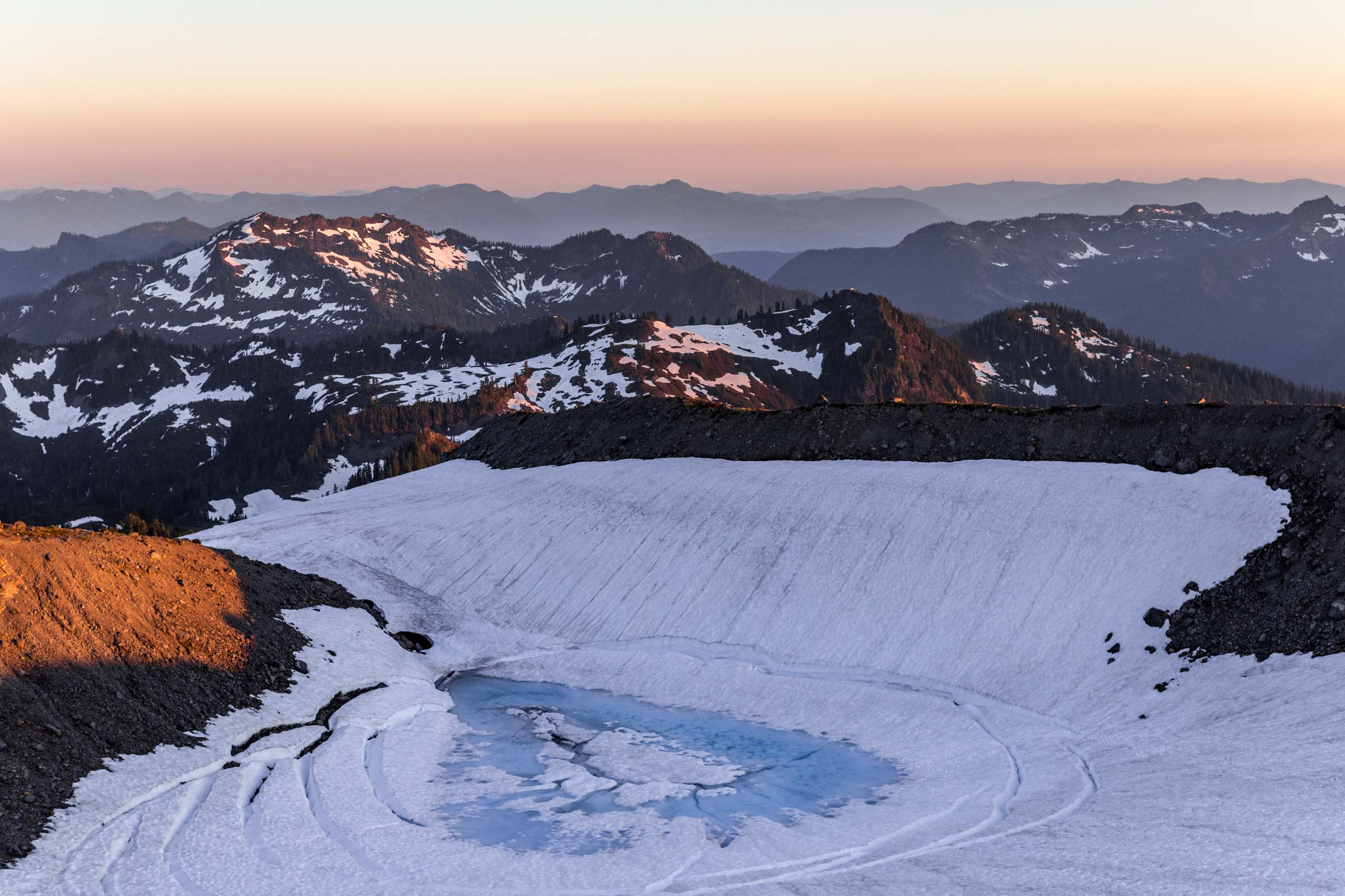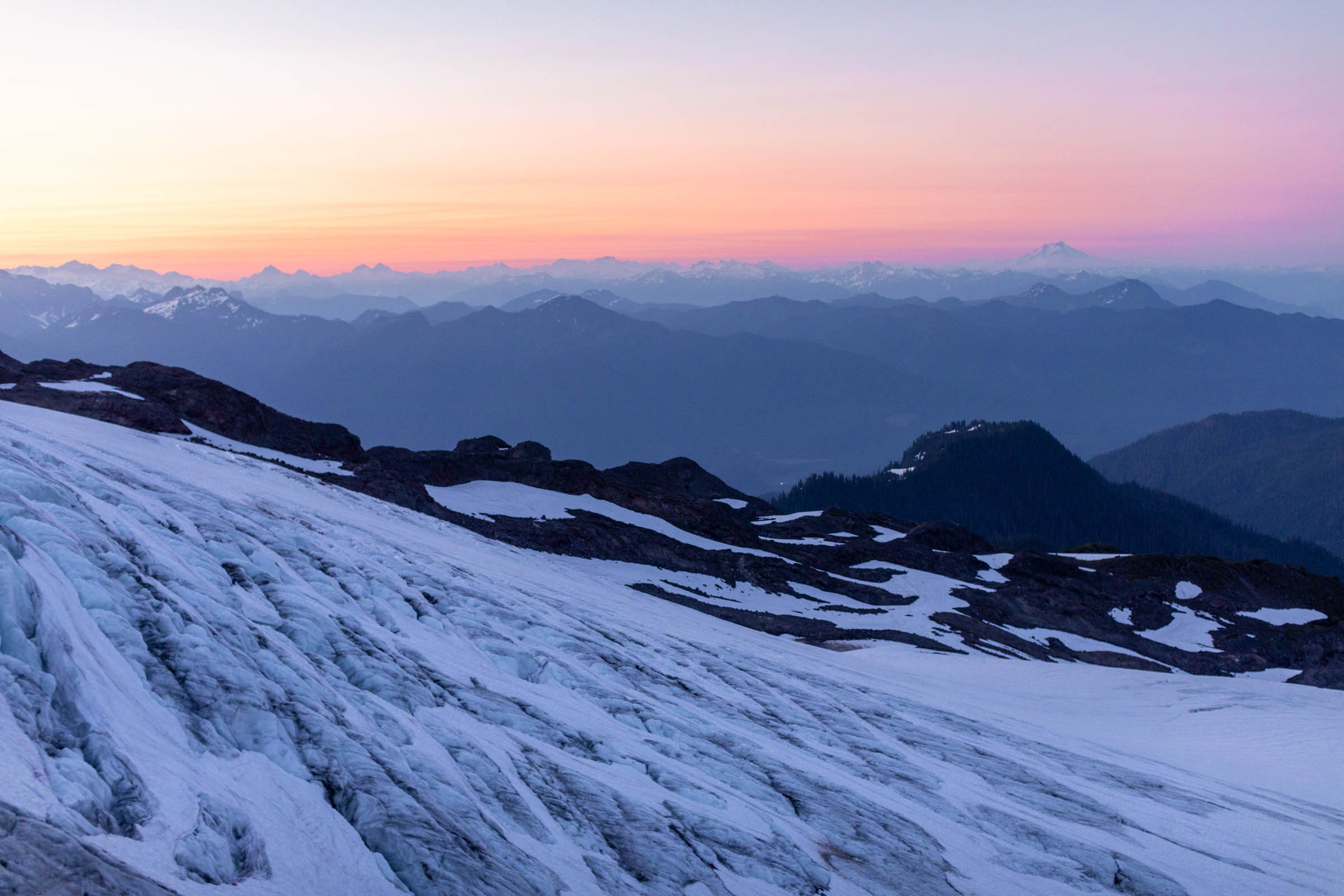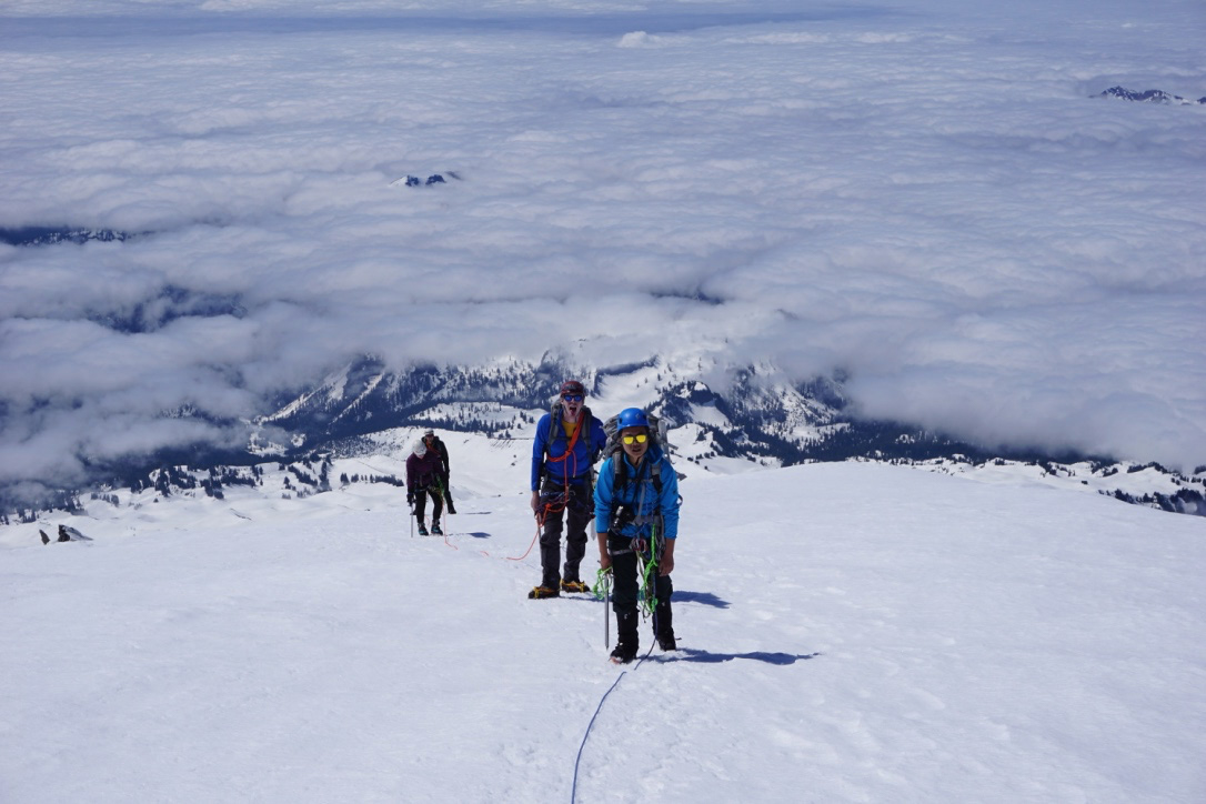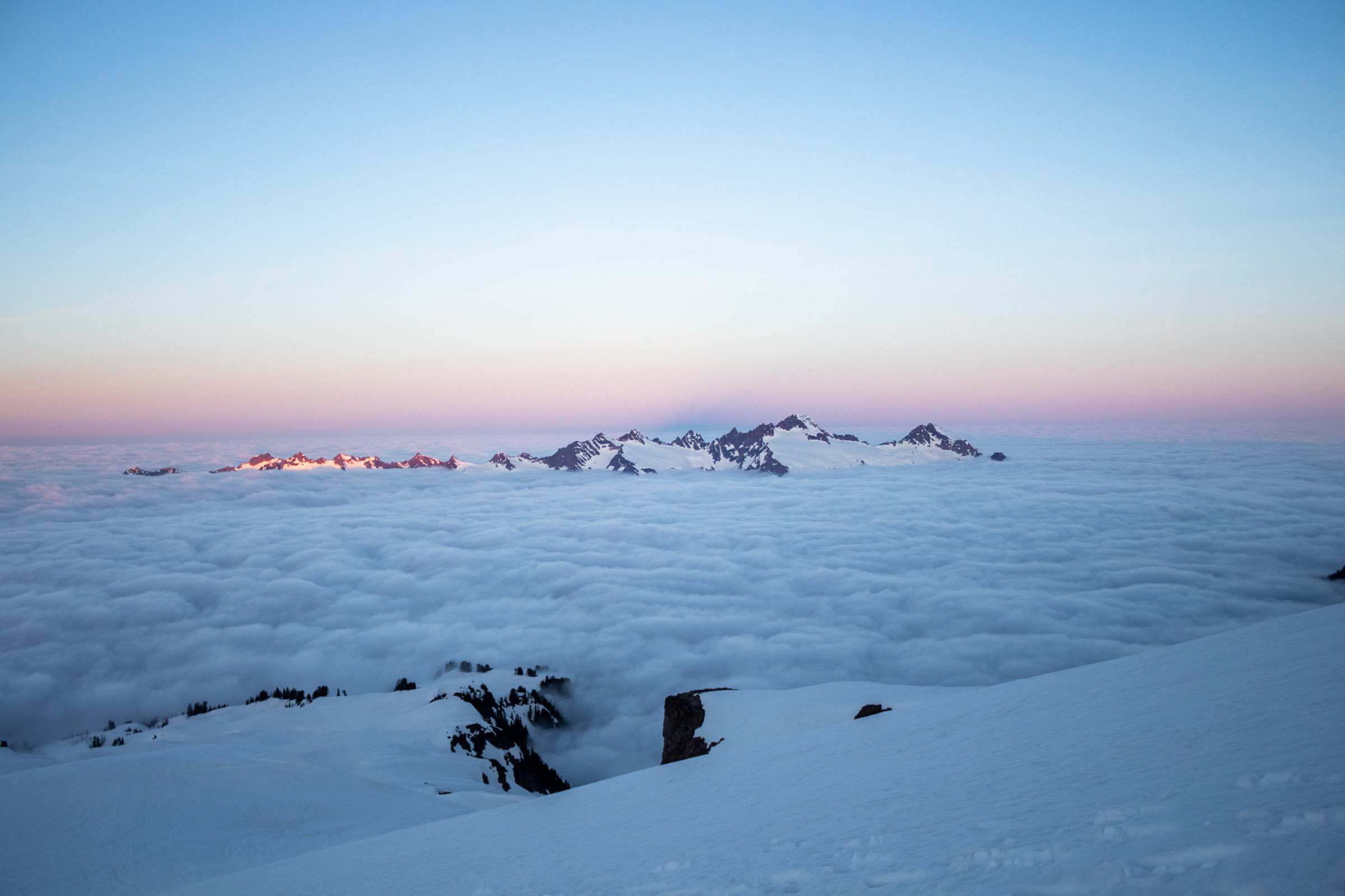 Even though we got up before the sunrise, many groups were already half way up the mountain and even approaching the Roman Wall. Headlights were shining like connect the dots. And as we started roping up to cross the glacier, the sun started to light up the sky. And for a couple of hours, we all kept turning around, enjoying the gorgeous colorful horizon. I remember the last time up here, we also had an amazing sunrise over some cloud inversions.