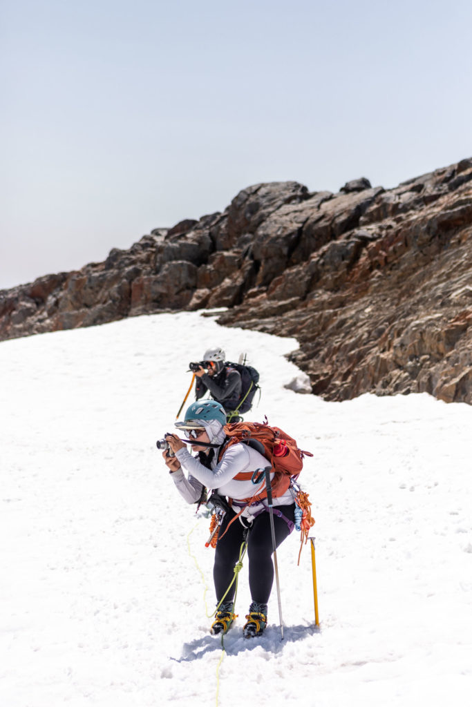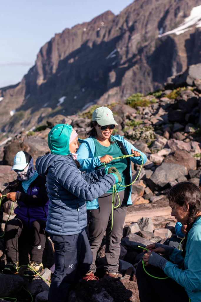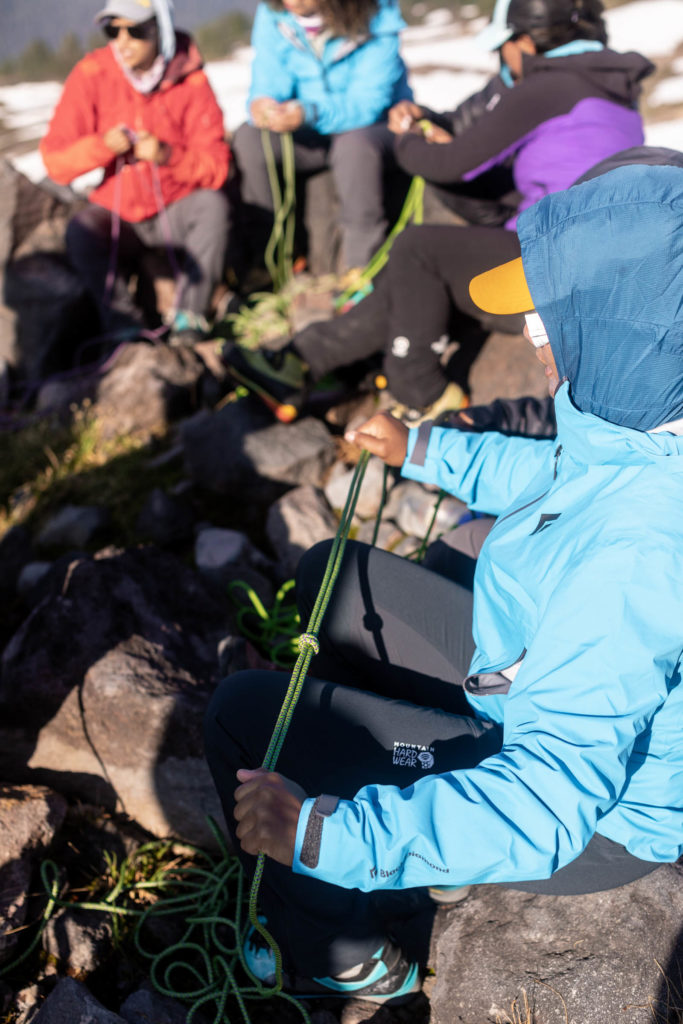 We retreated to our side of the glacial tarn to keep the 12-person party limit in check. We being my rope team of photographers. The next morning, we had an early wake up and straight into lessons. At least everyone could stay seated on the rocks to practice rope skills and tying knots. Mariko and Theresa led this section as Dawa took a break. It was cool to see them take turns teaching, since it must be exhausting to be “on” for so long. Even with my goal as a photographer, I would need to take breaks and just sit and watch. It’s Theresa’s first season as an AMGA mountain guide, and how amazing it is that she can continue knocking down walls and bringing more people of color into the world of mountaineering as an instructor for Climbers of Color.