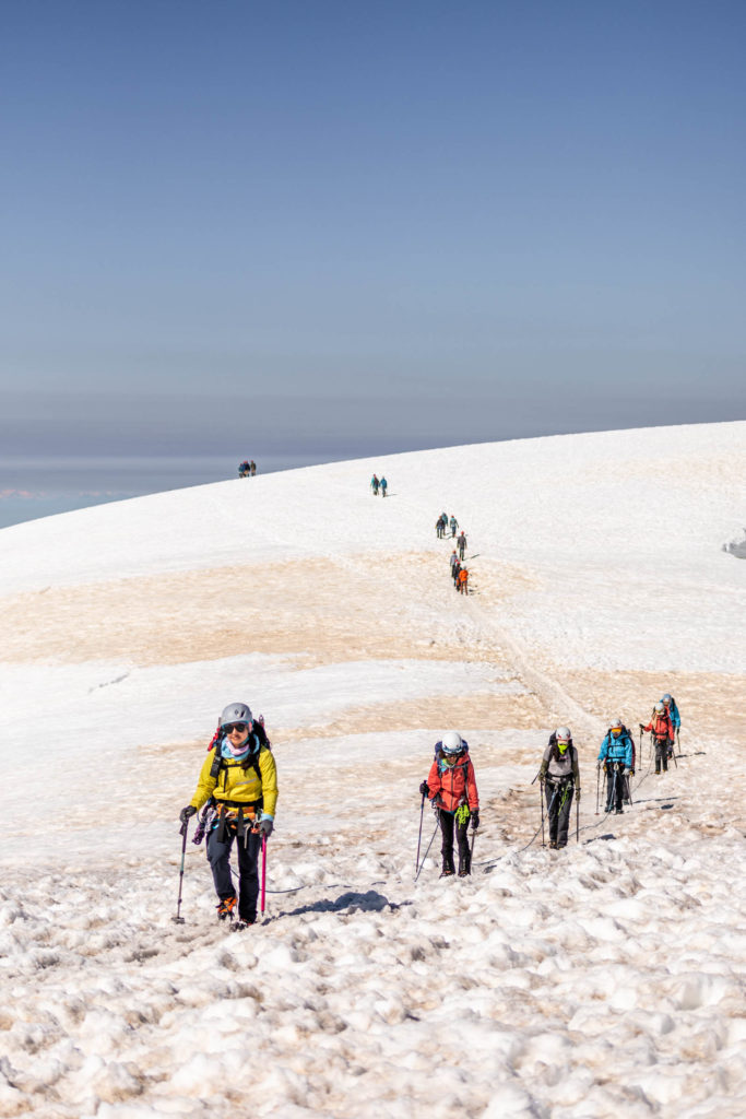 Finally, we were headed up the Roman Wall, a steeper slope with even more giant crevasses to switchback through. And some of the crevasses I even recalled them the same as before. Probably due to the fact that I pour over my pictures often rather than my actual memory. But the best part was as we crested the edge of the flat summit. I couldn’t believe that I could actually walk at a decent speed rather than dragging them up to the true summit. Feeling strong is incredible and it definitely helps to have a direct comparison to the past.