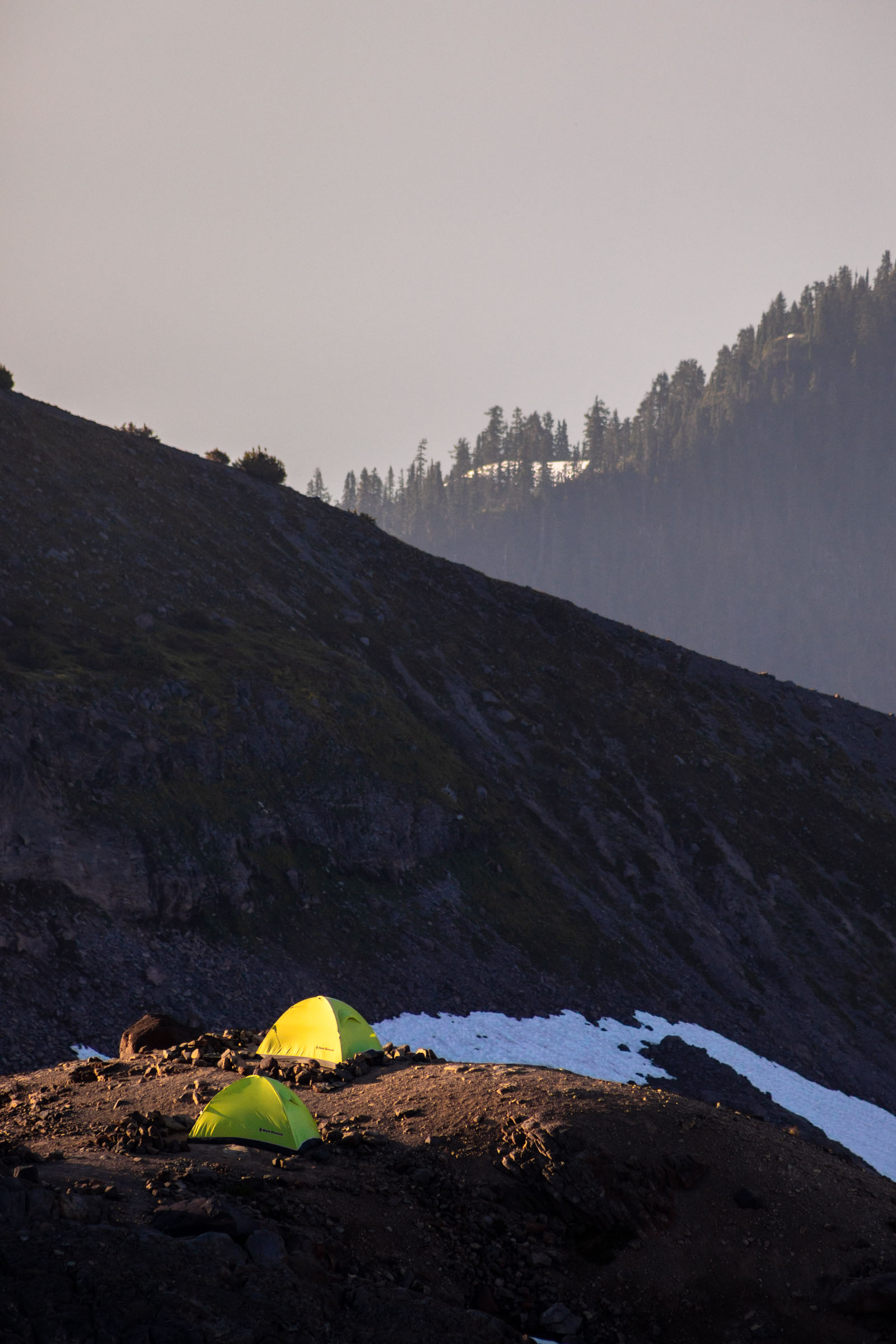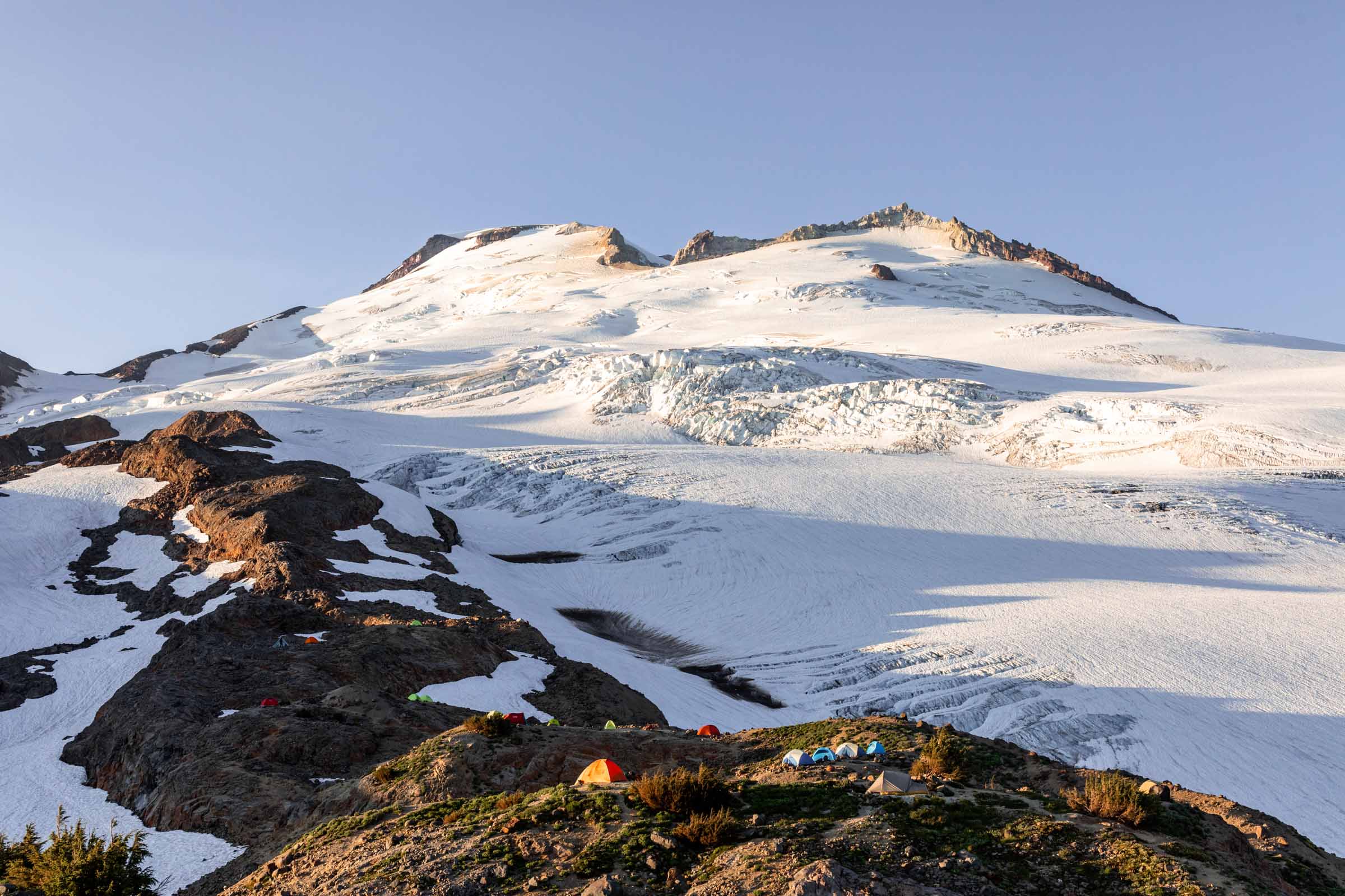 Due to scheduling conflicts, we arranged for me to hike separately from the main group (we technically had to be separate groups due to the 12-person wilderness limit anyway) and meet everyone at base camp. The tricky thing is that camp has a potential to move based on availability and communication would not be easy without cell service. So starting from the Park Butte trailhead, I followed the trail and then once it ended, I followed a dot on my map, eventually reaching Sandy Camp. I had summited Baker the same route a few years ago during the early season when everything was snow covered from the trailhead. It was unfamiliar to follow the trail through the subalpine meadows, but a pleasant walk without the drag of the snow. Sandy Camp was truly a mountaineer’s base camp with dozens of groups littering the Railroad Grade trail.