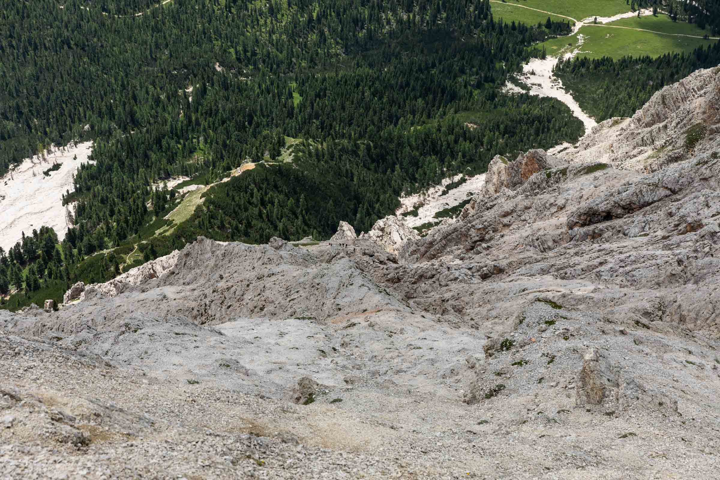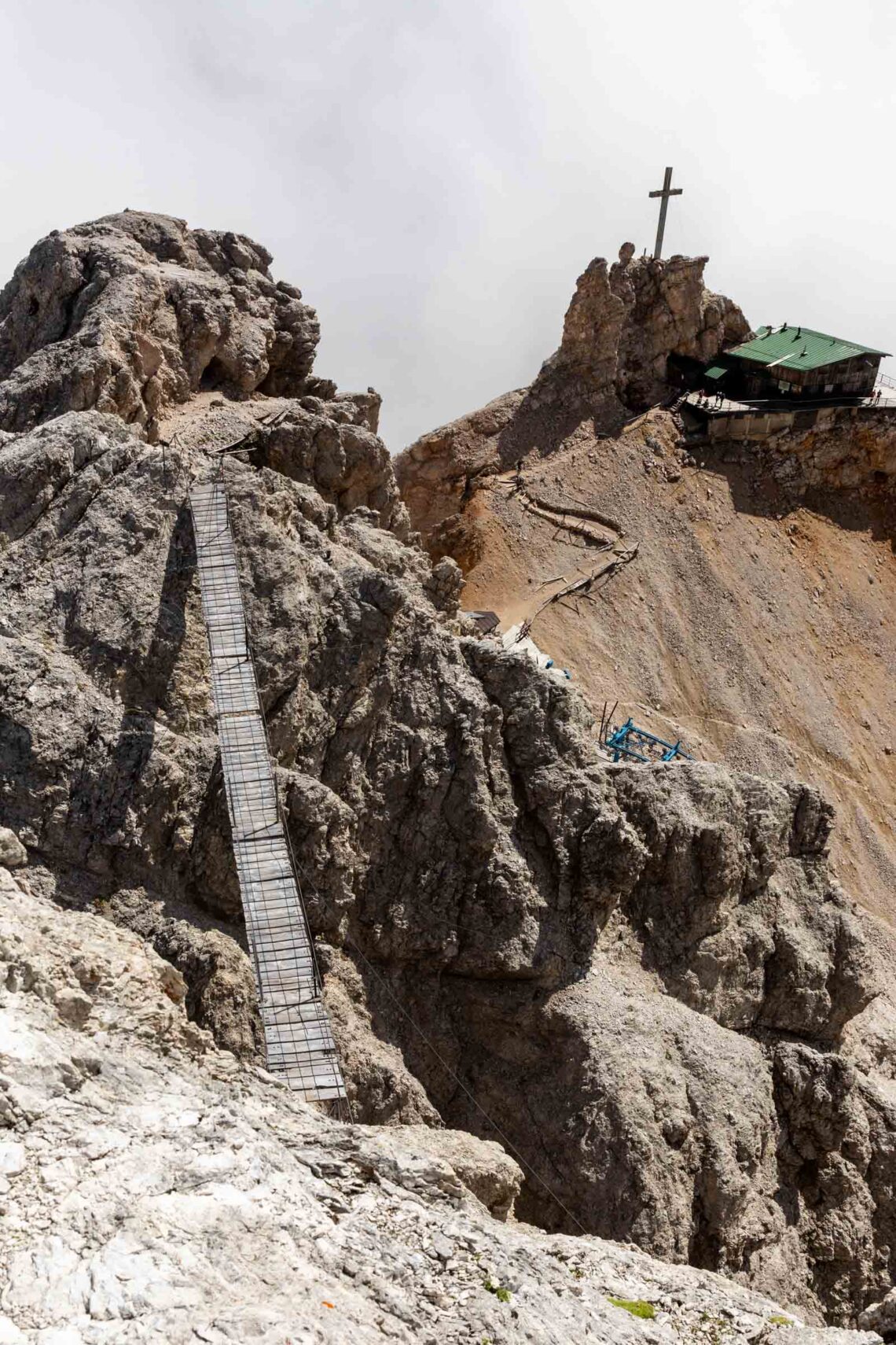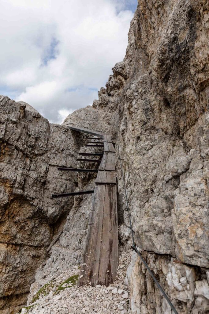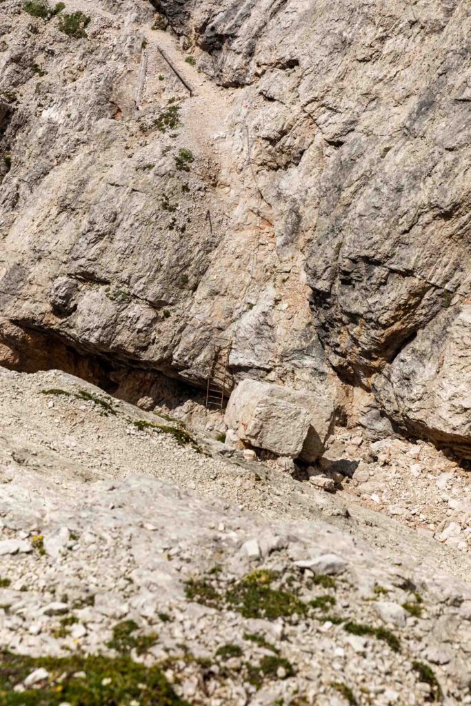 The bus ran ahead of the lifts actually, but I only had to wait a few minutes behind a couple groups and for the lift counter to begin concessions. The Rio Gere-Son Forca lift is really nice and it would be lovely to take a covered lift like this in the winter! But since it was summer, I felt no need to pull down the cover. Instead, I enjoyed my 15.5€ ride to save time and energy. This cuts off 1600 ft of elevation. From the Rifugio, you go around and up the the big gully where it’s marked for the via ferrata. Half way up, you’ll find a faint trail that is good to follow but it switchbacks relentlessly. If you step off the trail, you’ll immediately cause a landslide, but the trail somehow is very solid. Since the trail goes straight up, it gains quickly and I think I was able crush it all within 45 minutes somehow. Old maps and tracks seem to suggest taking a looker’s left up another gully, but no one went that way. Perhaps it’s fine to do that but you’ll miss the major attraction of the long suspension bridge!