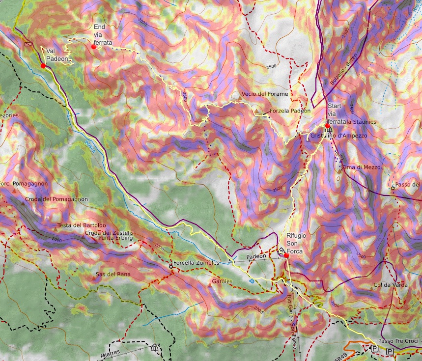 - If descending via the ridge for the lower Ivano Dibona, you’ll end up at Val Padeon, the intersection of trail and a forest road. Either hike back east an easy uphill 4 miles to Passo Tre Croci or a shorter downhill one mile west to your car shuttle at Ospitale d’Ampezzo.
