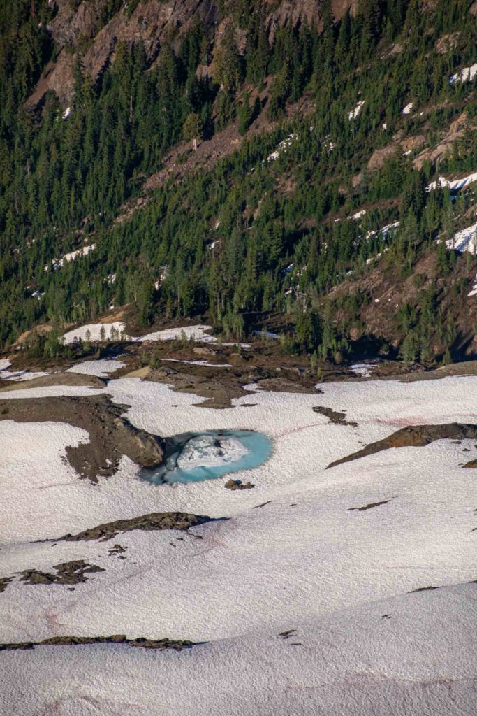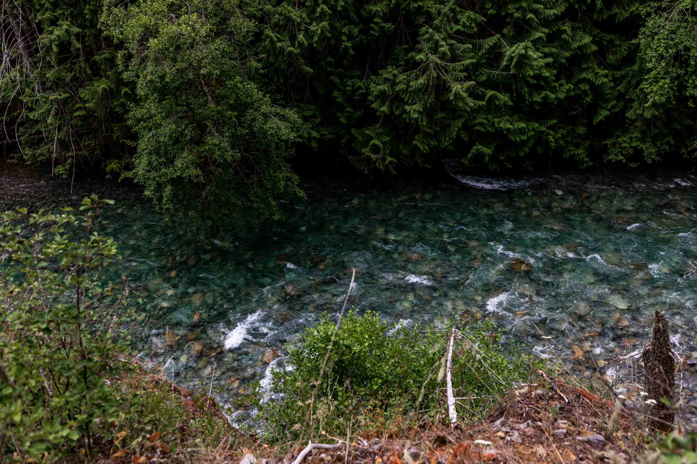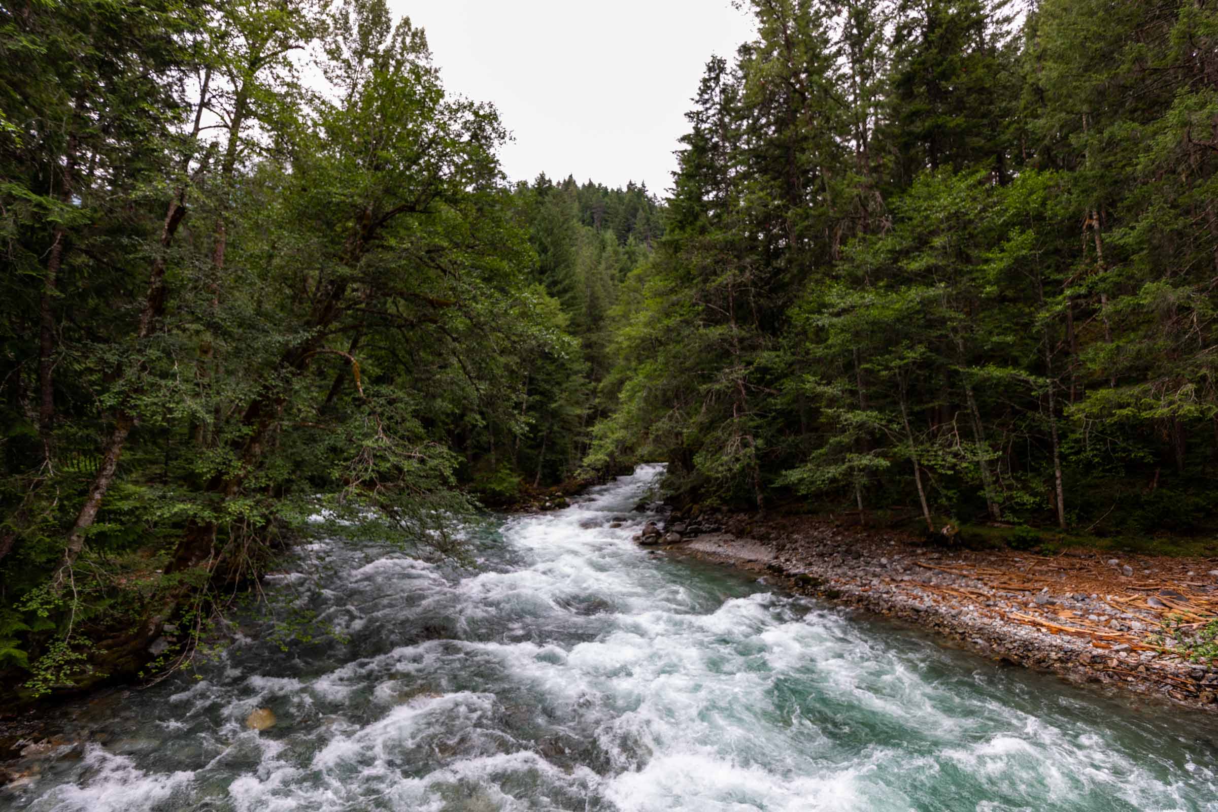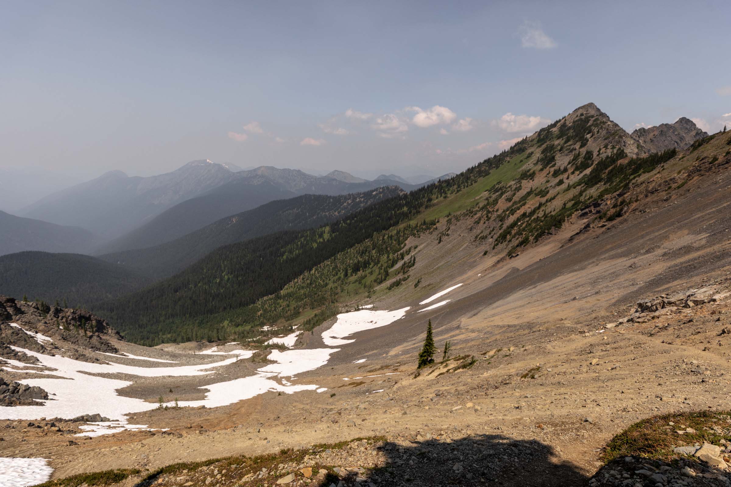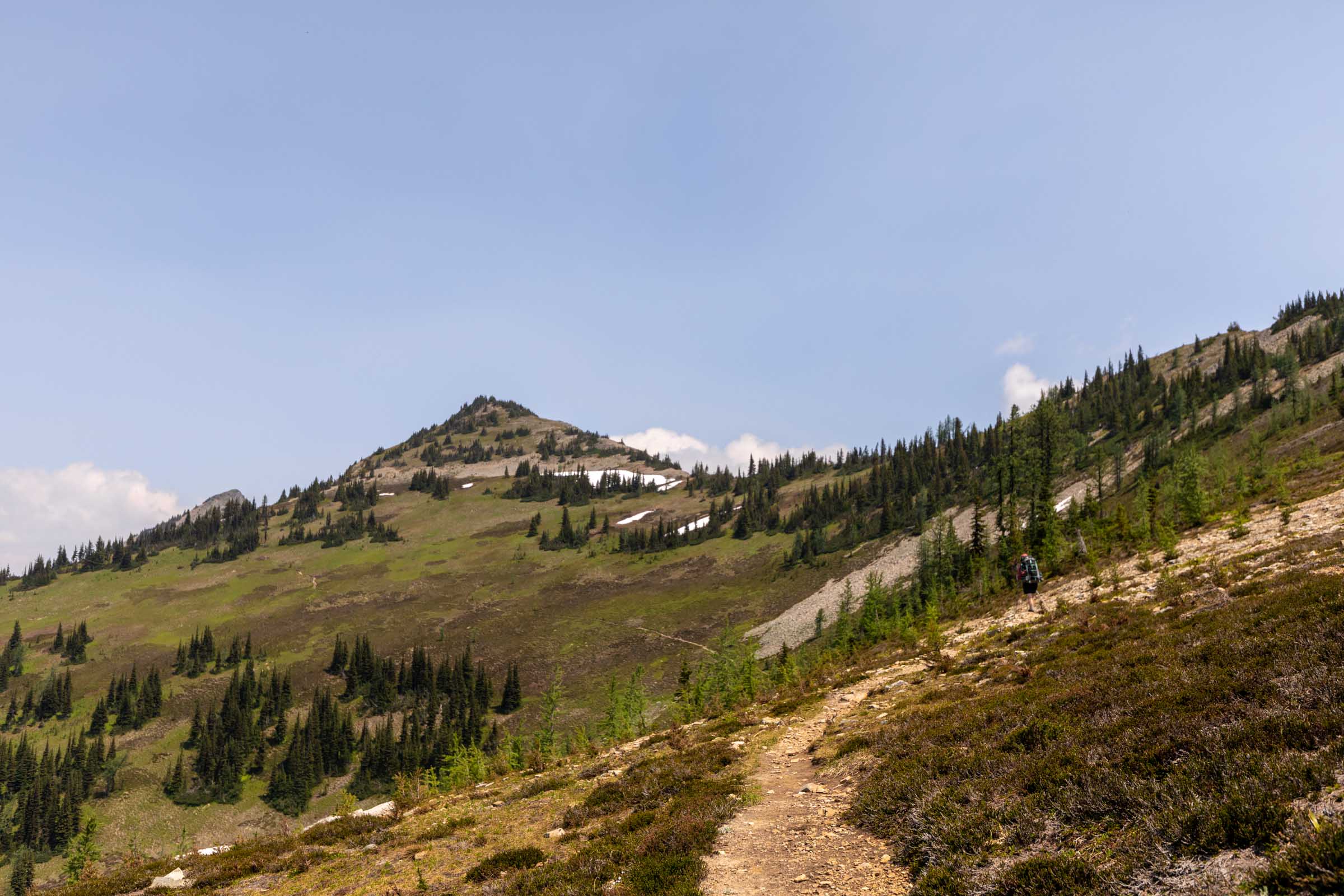 We began our first day at the East Bank Trailhead, barely finding parking in the pull off area. We double checked we had everything in our packs and left everything else in the trunk of the car. Hwy 20 is known to have car break-ins so I was meticulous in emptying the cabin so only my forest pass was in sight. 0.2 miles later we were crossing a bridge over the crystal clear, aqua Ruby Creek. And it was flowing heavily! Thankfully, we could still enjoy this river for another 3 miles as we walked beside it. And soon our leisurely, overcast stroll turned into a hot, muggy hike up the south side of the Devils Dome Loop trail. There were many switchbacks to keep me entertained and even a stream crossing where I walked barefoot to keep my shoes dry. I’m sure at other times of the year, you can easily rock hop your way across. Poles were quite helpful here!