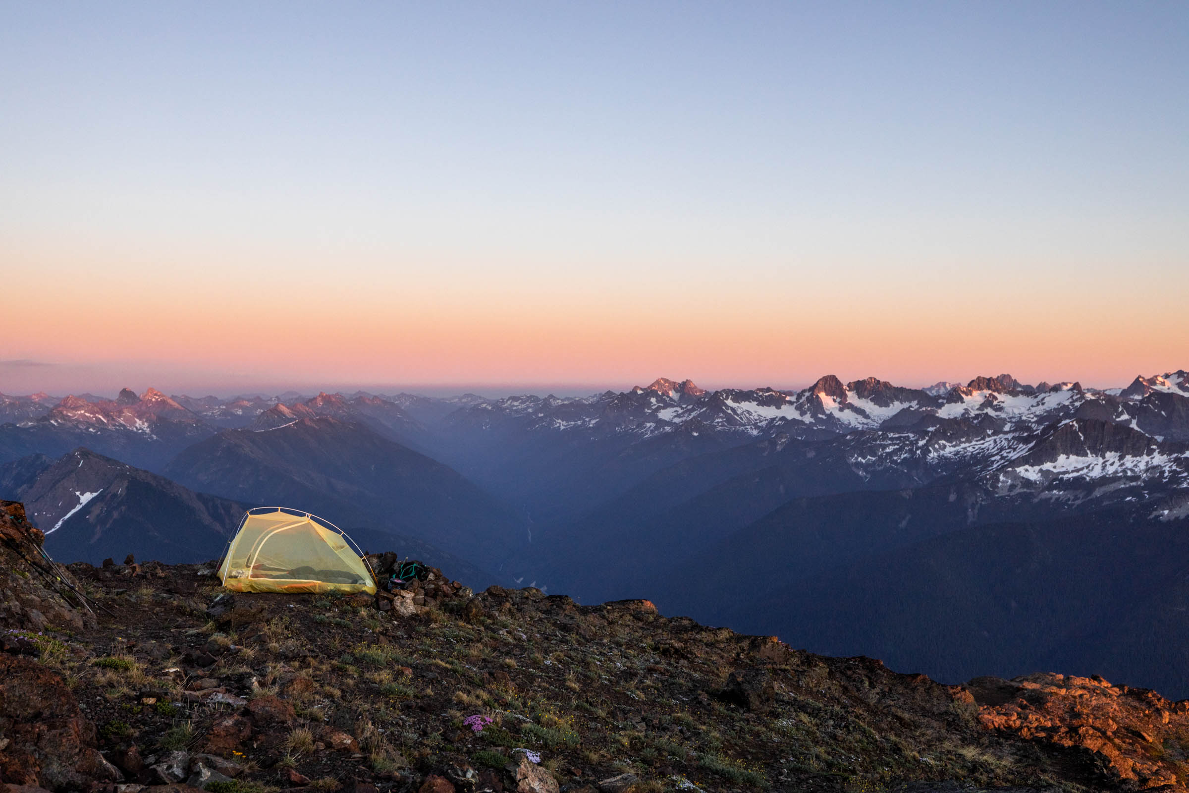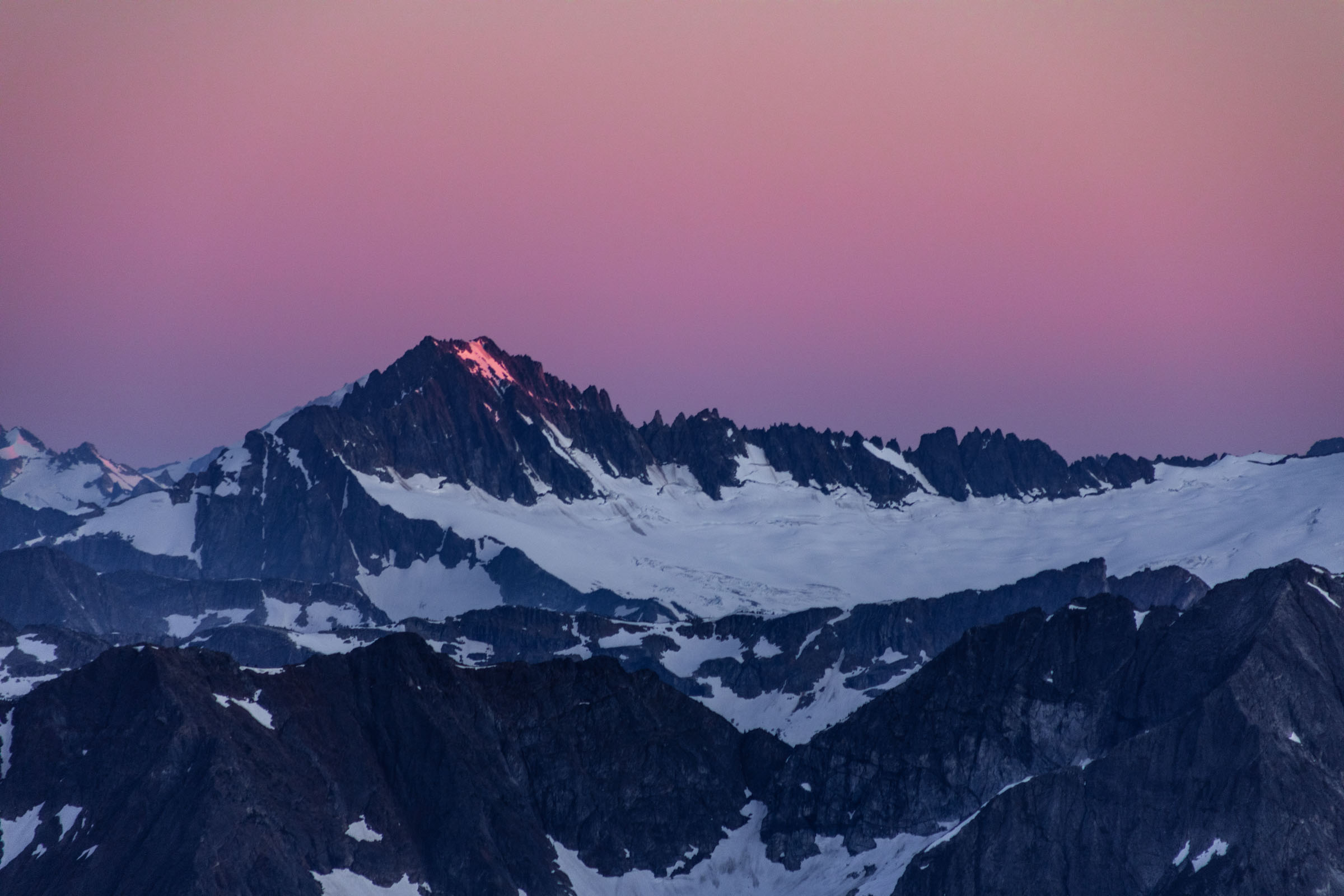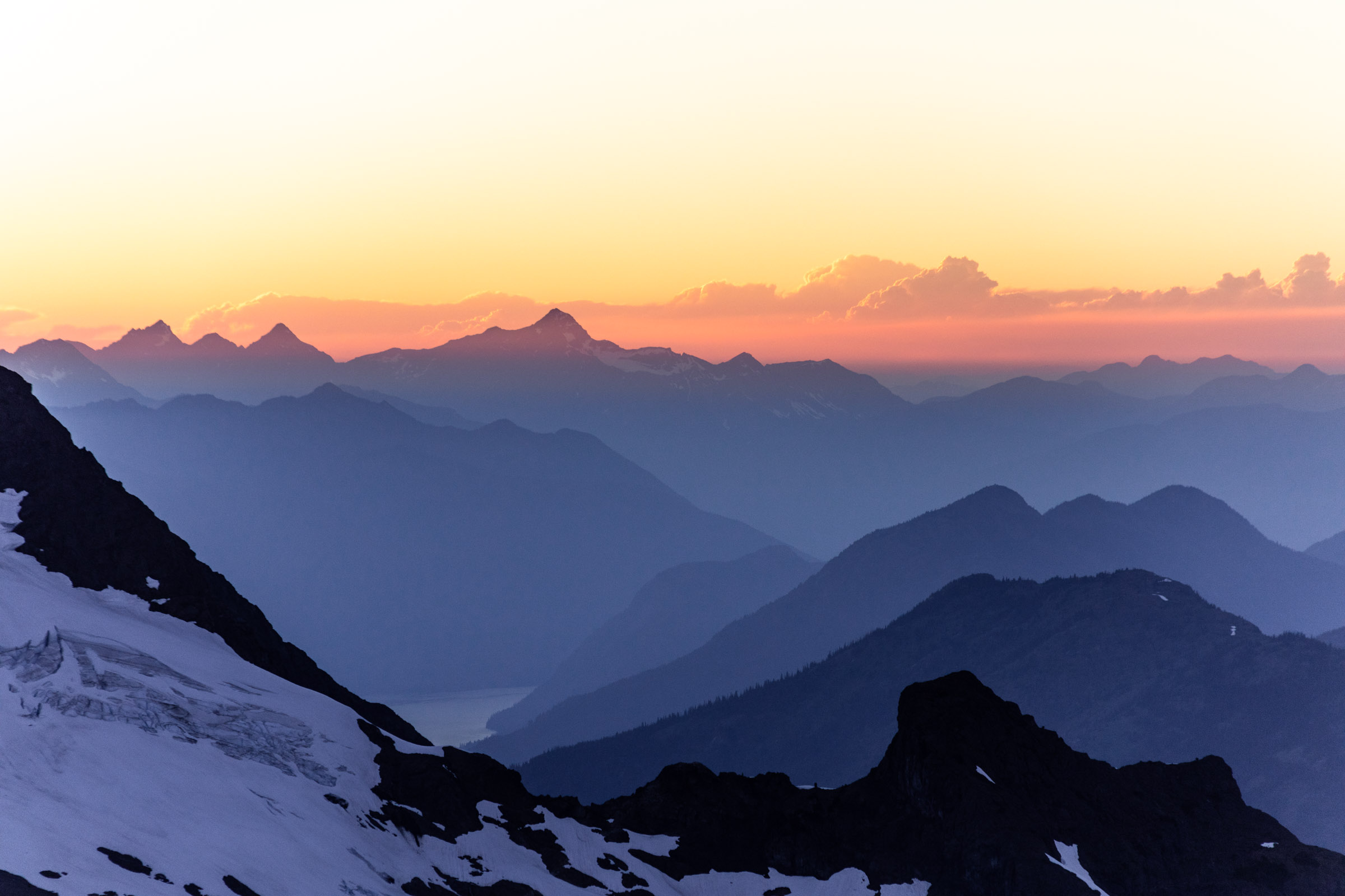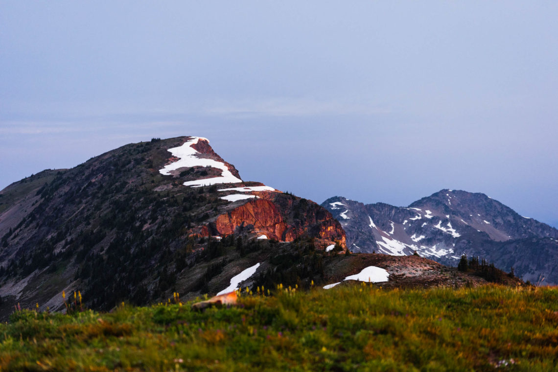 Excited to finally sit and lay down, we found a neat campsite all to ourselves. Another party was on the lower middle section of the dome, but we never exchanged a word. This was a pretty awesome site, and we found running water just a little bit on the north side of the dome, plus plenty of snow around too. It had been hazy all day but sunset was just about the right amount of pink for me. I didn’t realize that Devils Dome had such a nice view of Jack and Crater. Jack sort of looks a bit like Shuksan and it was really confusing! I knew if we had a clear sunrise, there’d be alpenglow on these mountains, so I made a decision not to stay up for astrophotography again.