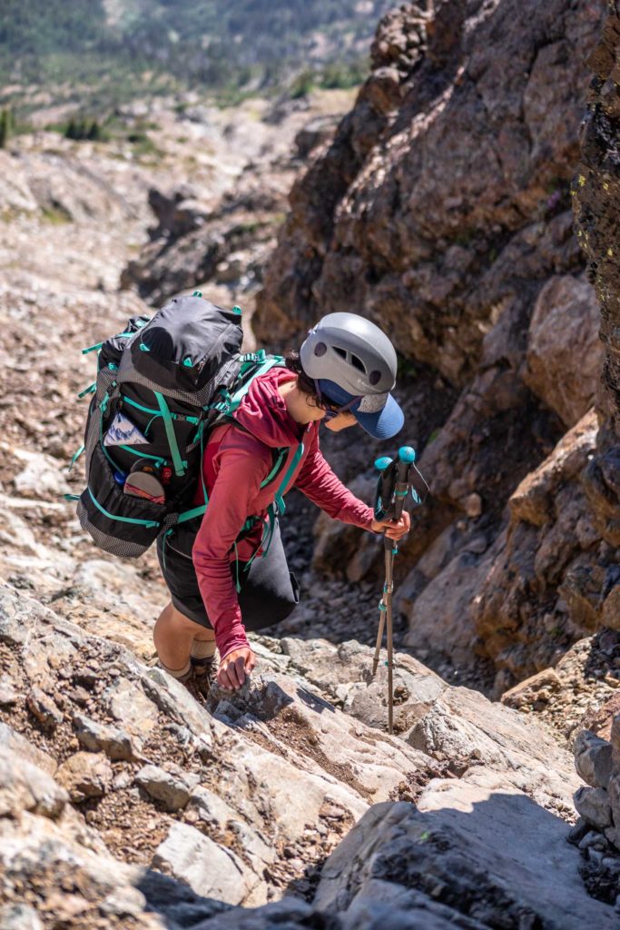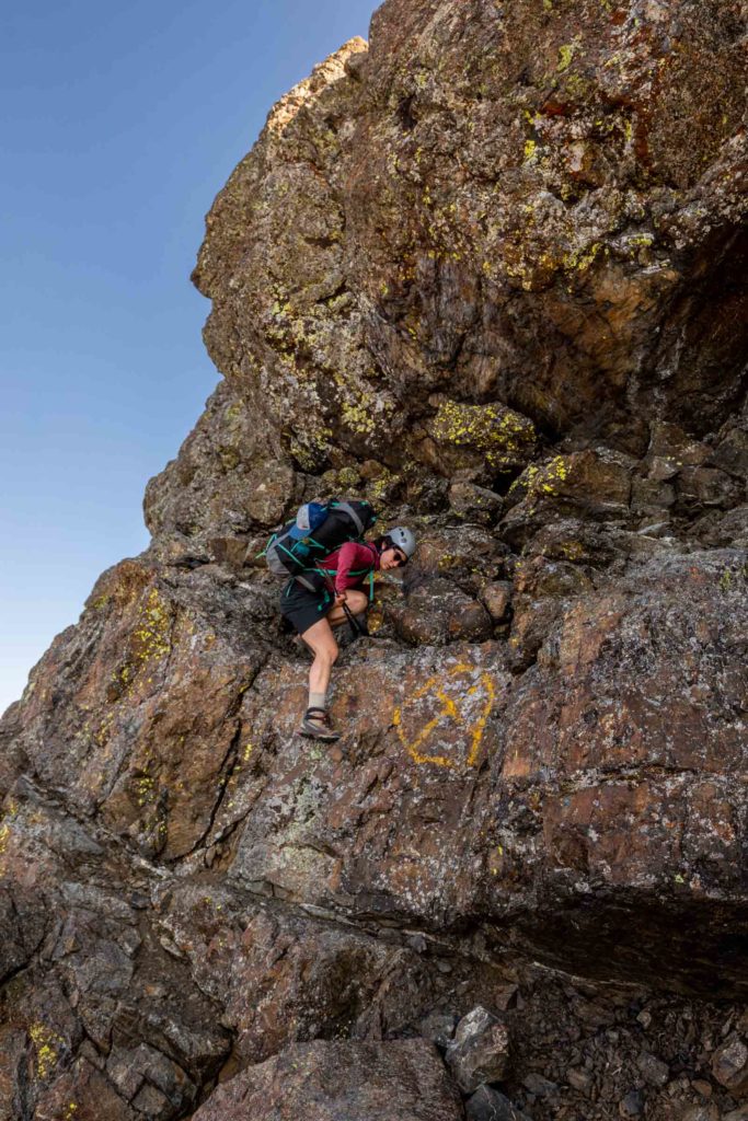 We passed by a nice gentleman who made camp on the arm above the lake. He mentioned going up to the summit earlier and he looked so peaceful lounging in solitude. He confirmed the painted x’s that we’d see as our guide up the scramble. Another short break later, we donned on our helmets and started the class 2-3 scramble. In my opinion, it is solidly class 3 when it is class 3. And most definitely airy at times. However, the rock is very solid and secure, giving us comfort as we traversed narrow ledges. Apparently this mountain used to host a lookout site, so the trail is quite well-made. Where the path could have been a scramble, a beautifully built trail wove its way upwards, so you could hardly even call it class 2 scramble since it was just a heavily switchbacked hike.