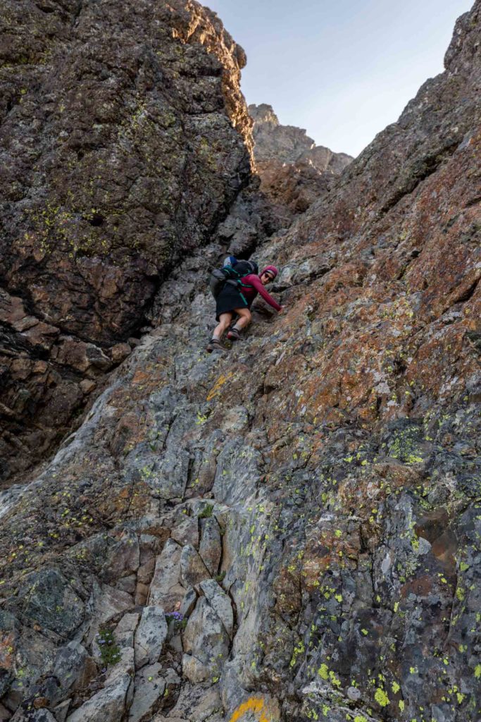 - Crater Mountain is a significant Class 3 scramble but also well marked by yellow x’s and arrows. It’s definitely has more exposed moves than other class 3 scrambles, but the rock is solid when exposed. There’s room for 2 tents to fit comfortably, possibly three 2-person tents could be made to work.