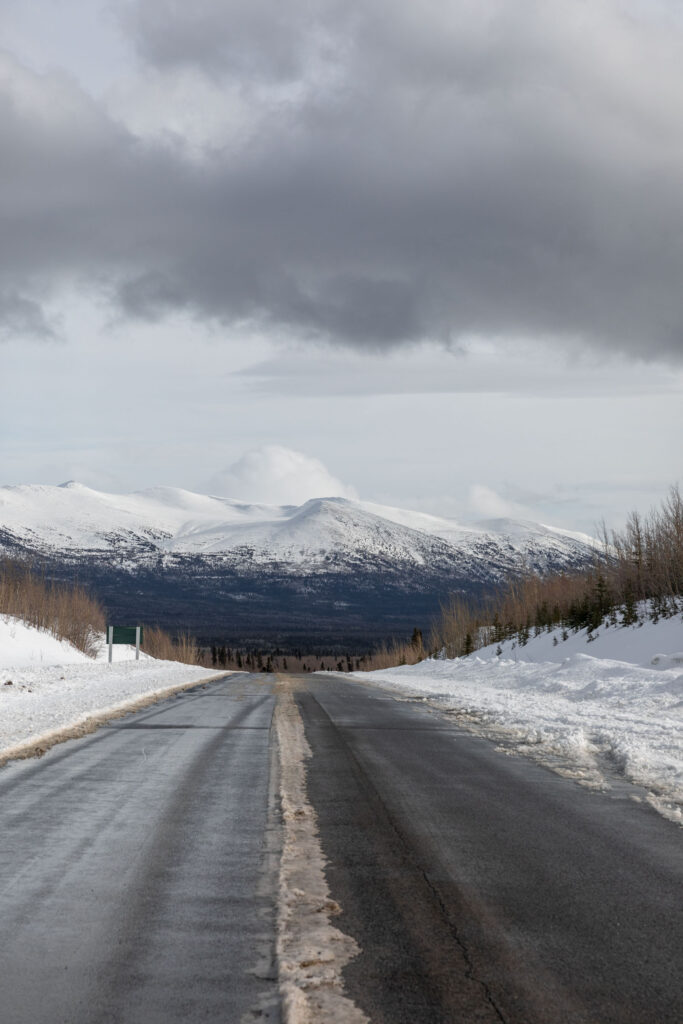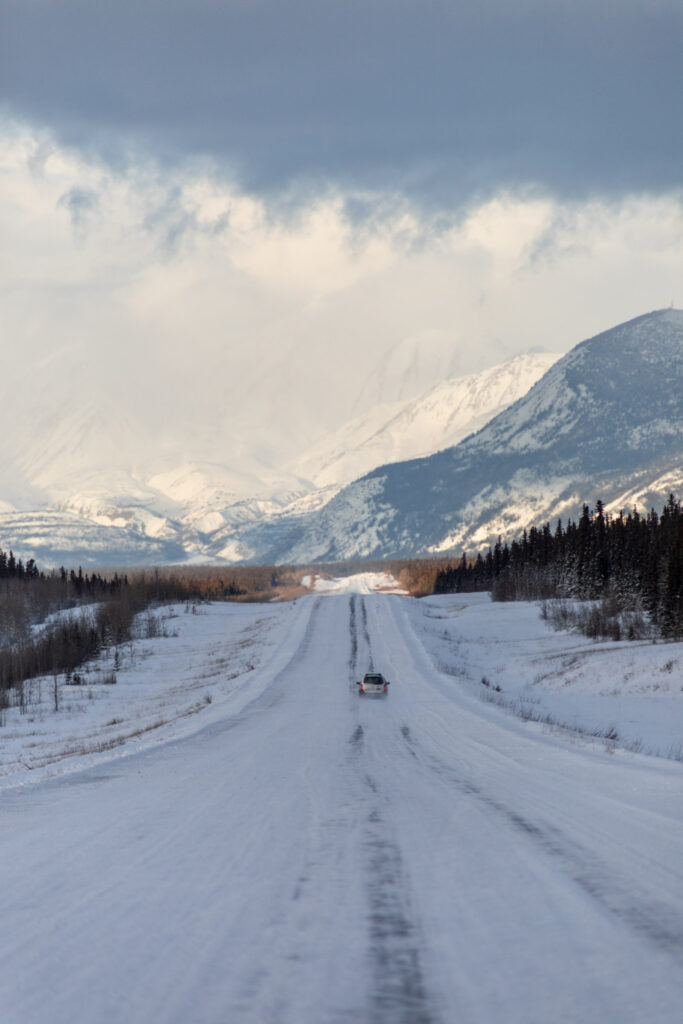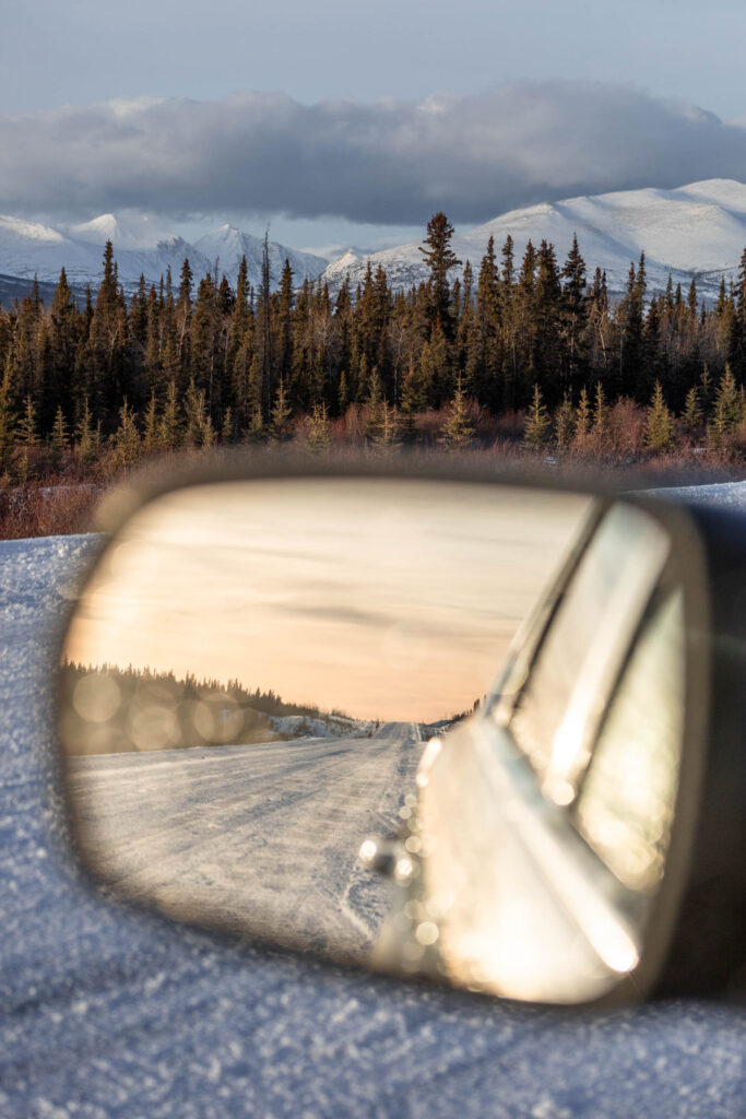 I’d recommend driving up north on the Alaska Highway at least to the Thechàl Dhâl Visitor Center, which is closed in the winter, but serves as a great parking lot and turnaround spot. It’s right next to Kluane Lake which is frozen in the winter. Be careful of high winds along this road!