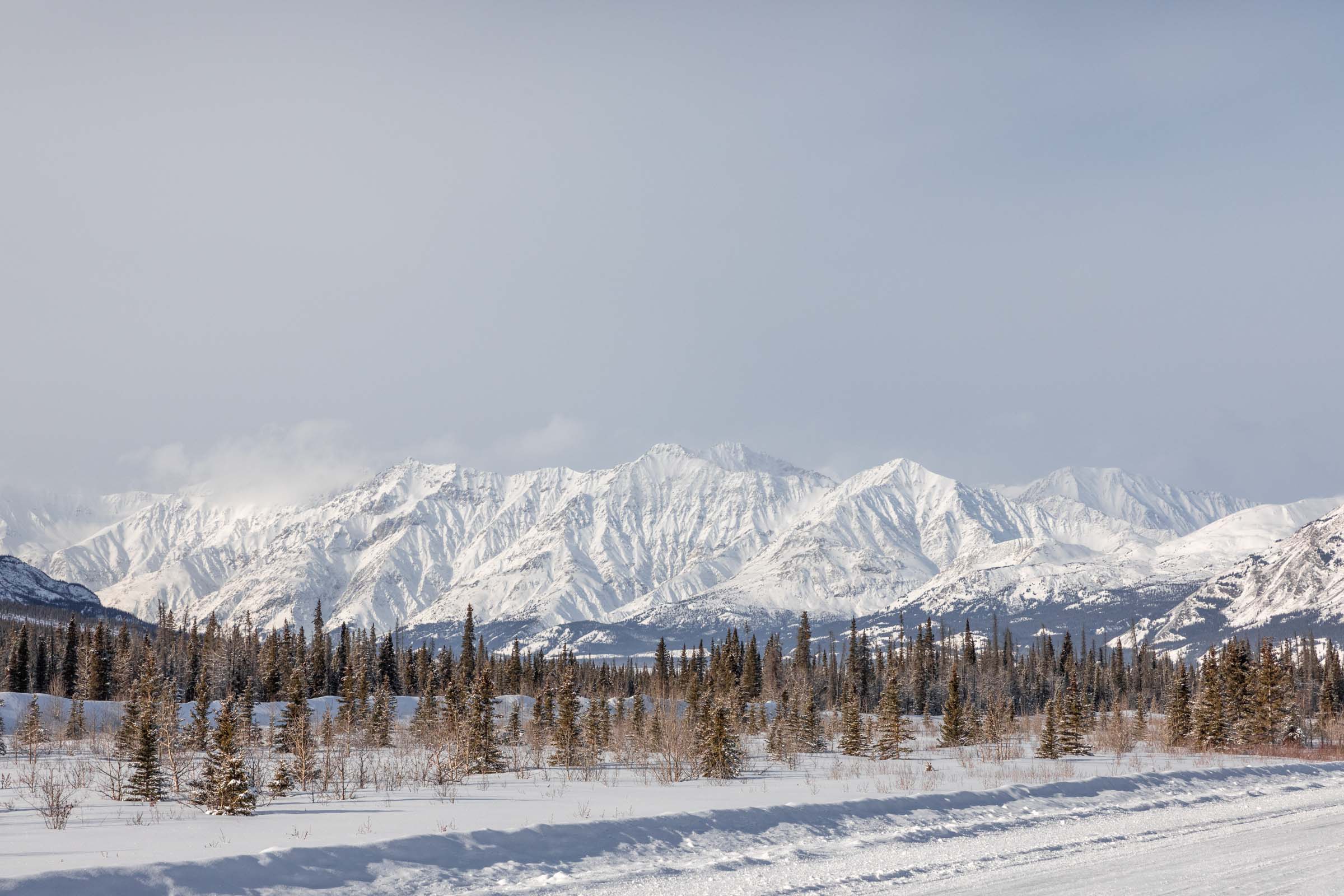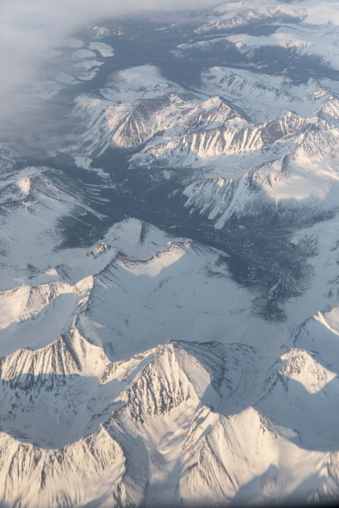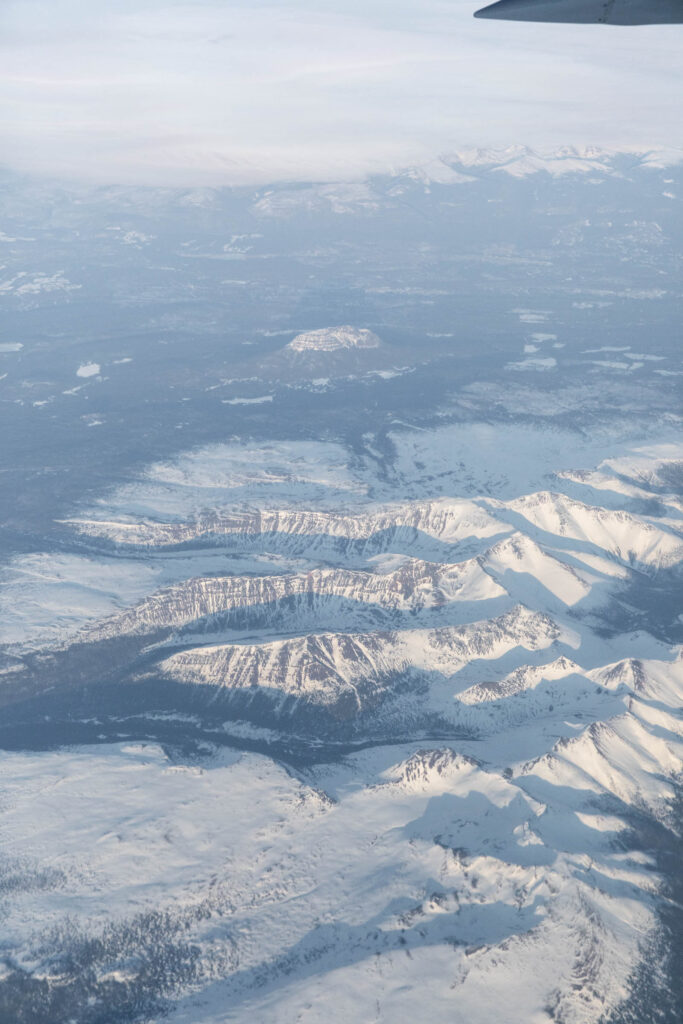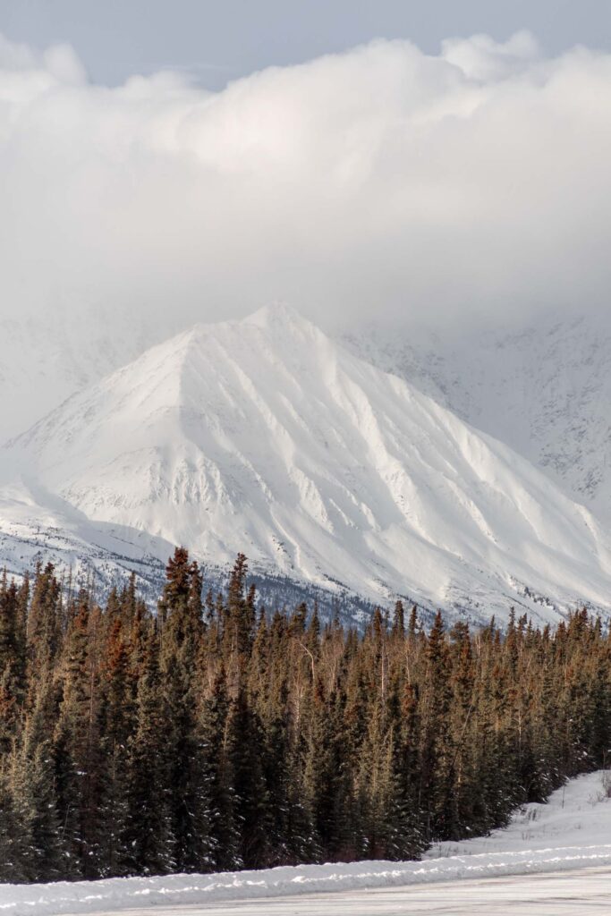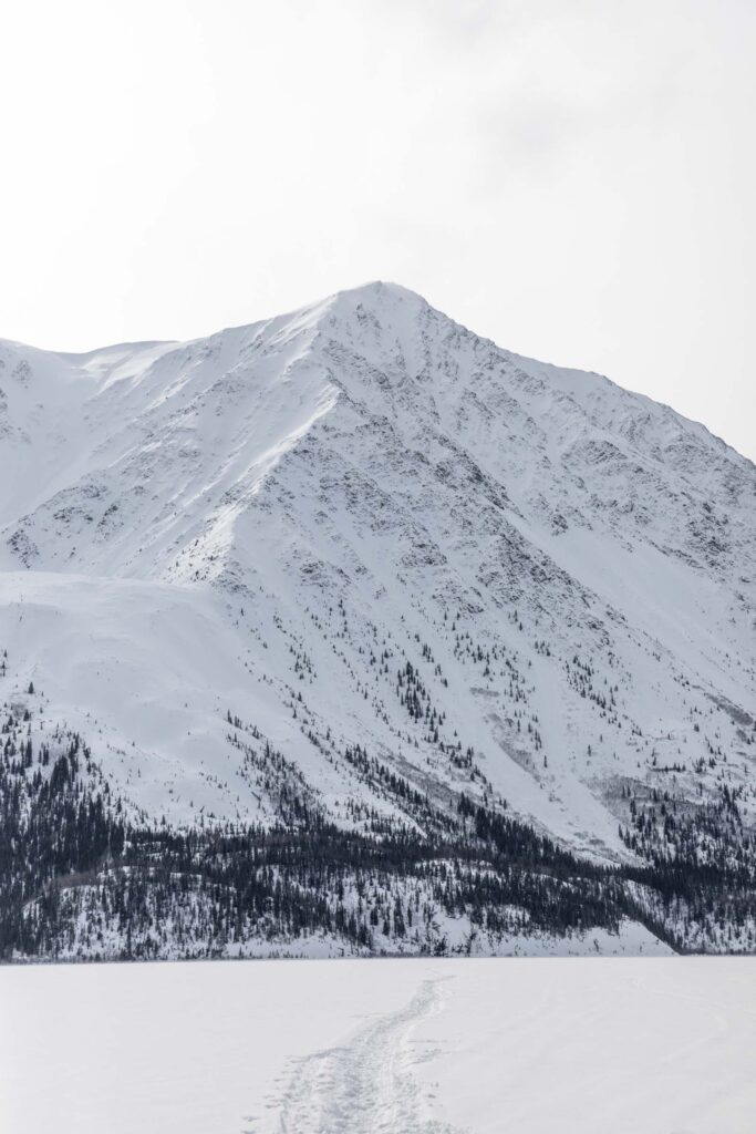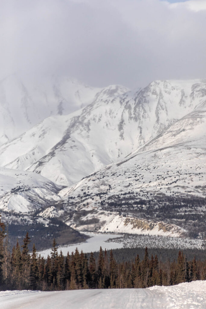 While seeing northern lights is not guaranteed, there are still fun times to be had in the Yukon. The Kluane National Park resides in the Saint Elias Mountains, where you might find Mt Logan — the tallest peak in Canada and second tallest peak in North America. The beauty of the park is how the mountains stretch from the valley all the way to the peaks with geometric couloirs defining their shape. When covered in snow, these mountains looked extra magnificent. Even the drive on Highway 1 from Whitehorse is gorgeous and they’re technically not part of the Kluane mountains. It’s not till you arrive in Haines Junction that you realize how immense the mountains are in the National Park. Mt Logan sat too far west for us to see on the partly cloudy day, but it’s wild to think of how many peaks are connected and how difficult the access is to many of them.