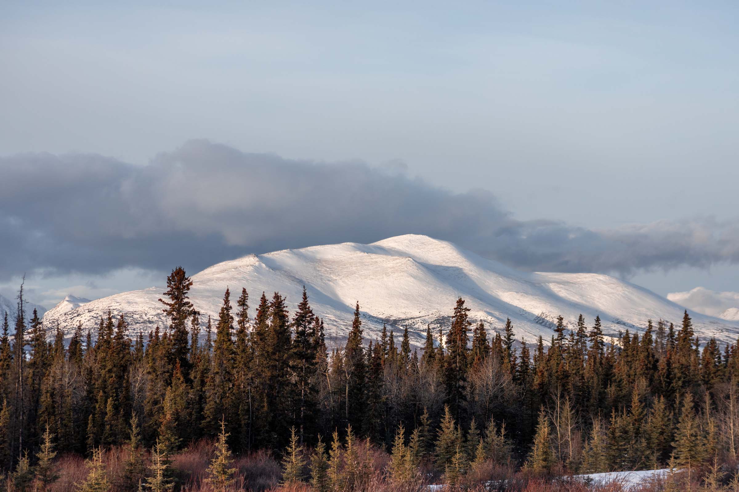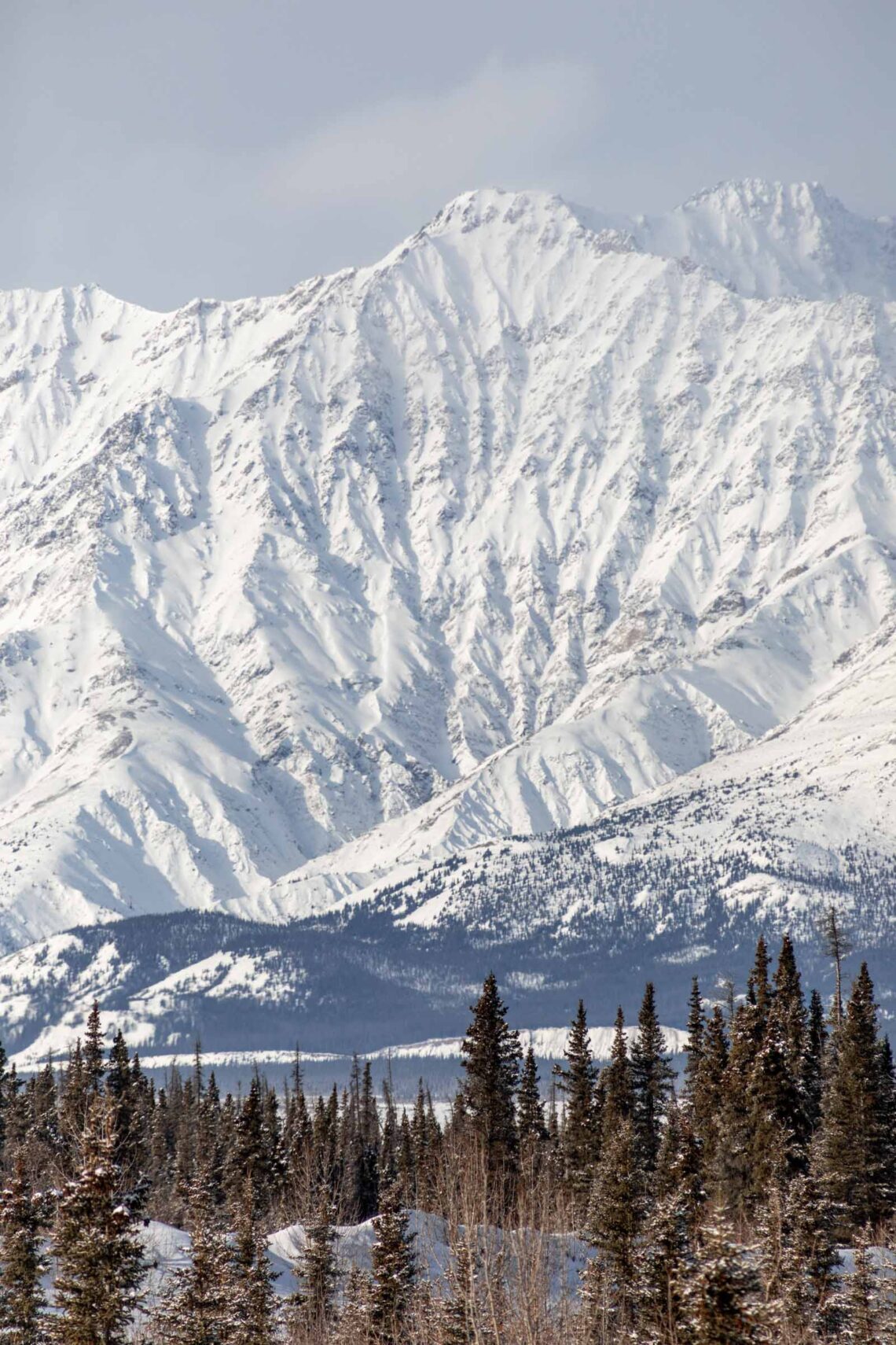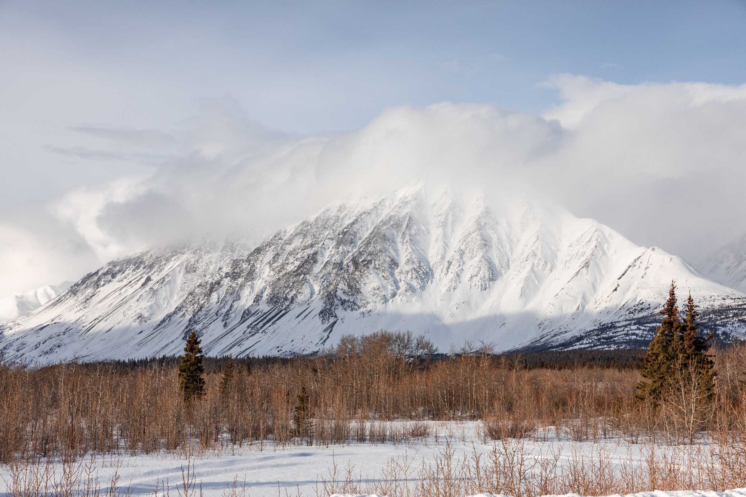 While seeing northern lights is not guaranteed, there are still fun times to be had in the Yukon. The Kluane National Park resides in the Saint Elias Mountains, where you might find Mt Logan — the tallest peak in Canada and second tallest peak in North America. The beauty of the park is how the mountains stretch from the valley all the way to the peaks with geometric couloirs defining their shape. When covered in snow, these mountains looked extra magnificent. Even the drive on Highway 1 from Whitehorse is gorgeous and they’re technically not part of the Kluane mountains. It’s not till you arrive in Haines Junction that you realize how immense the mountains are in the National Park. Mt Logan sat too far west for us to see on the partly cloudy day, but it’s wild to think of how many peaks are connected and how difficult the access is to many of them.