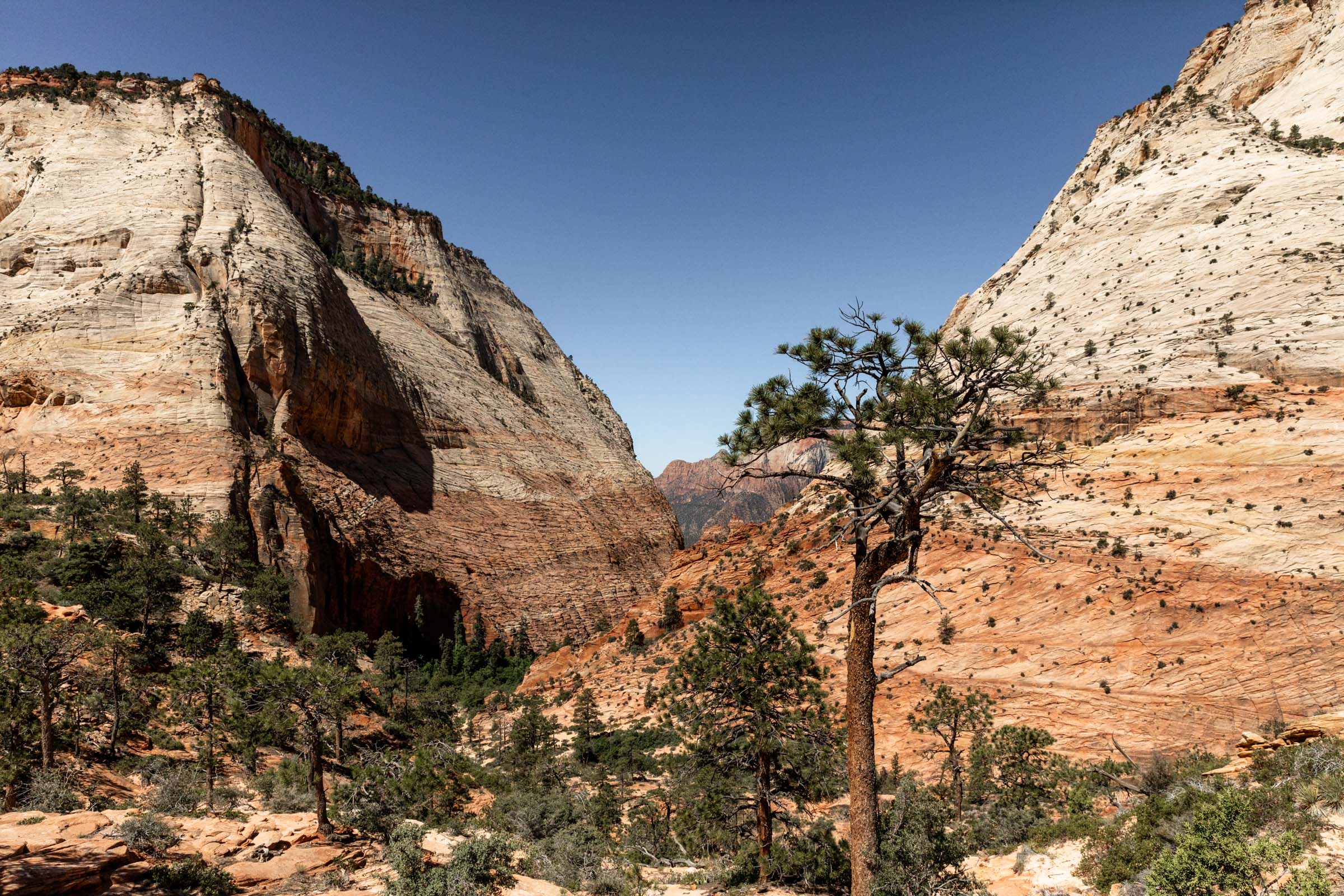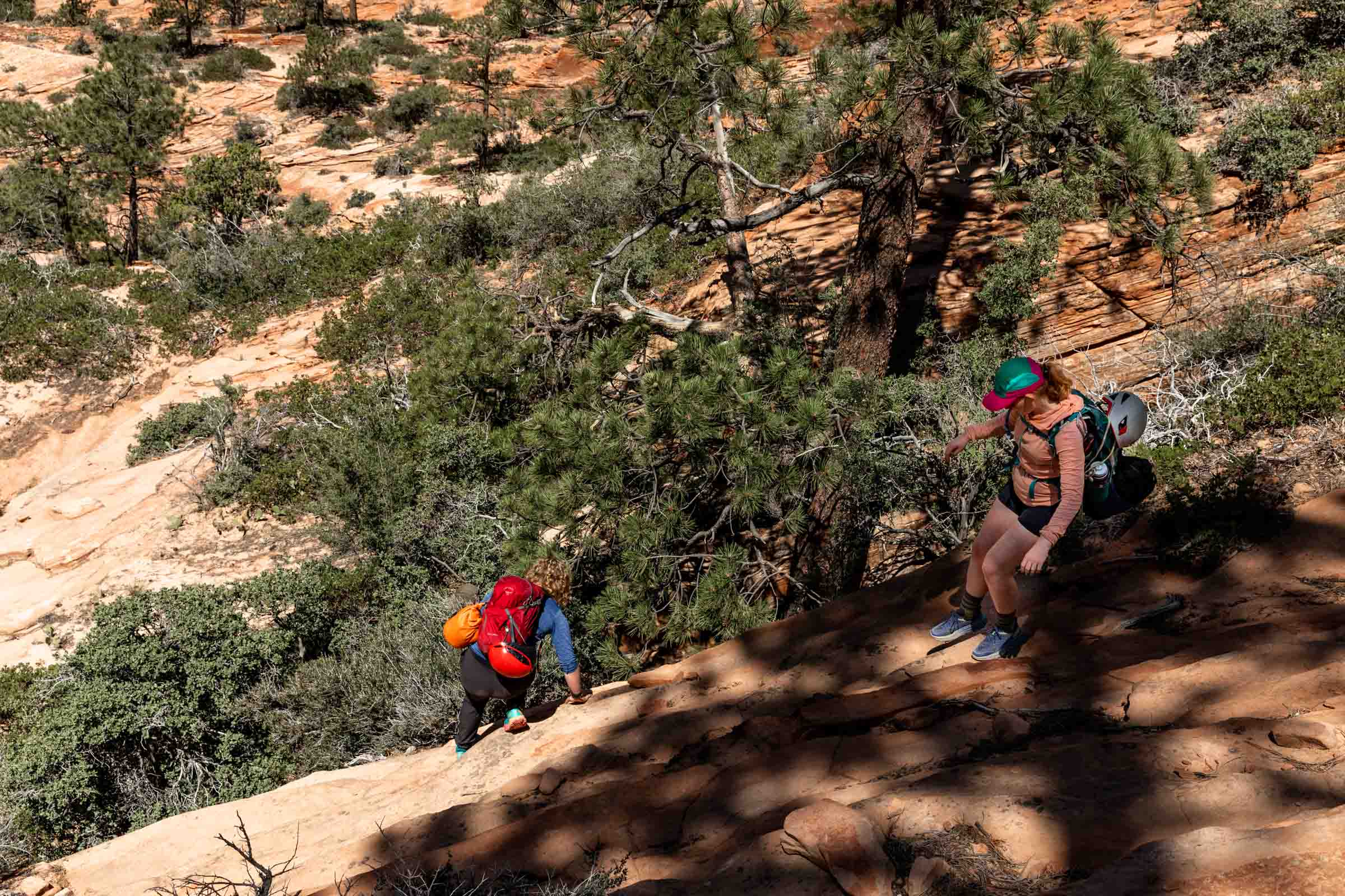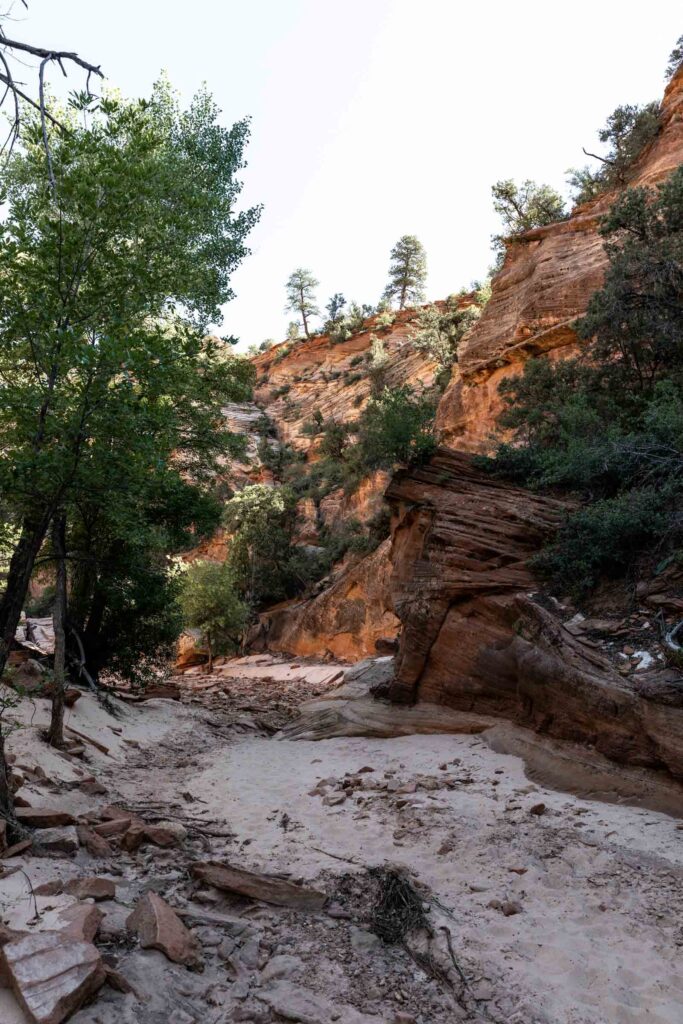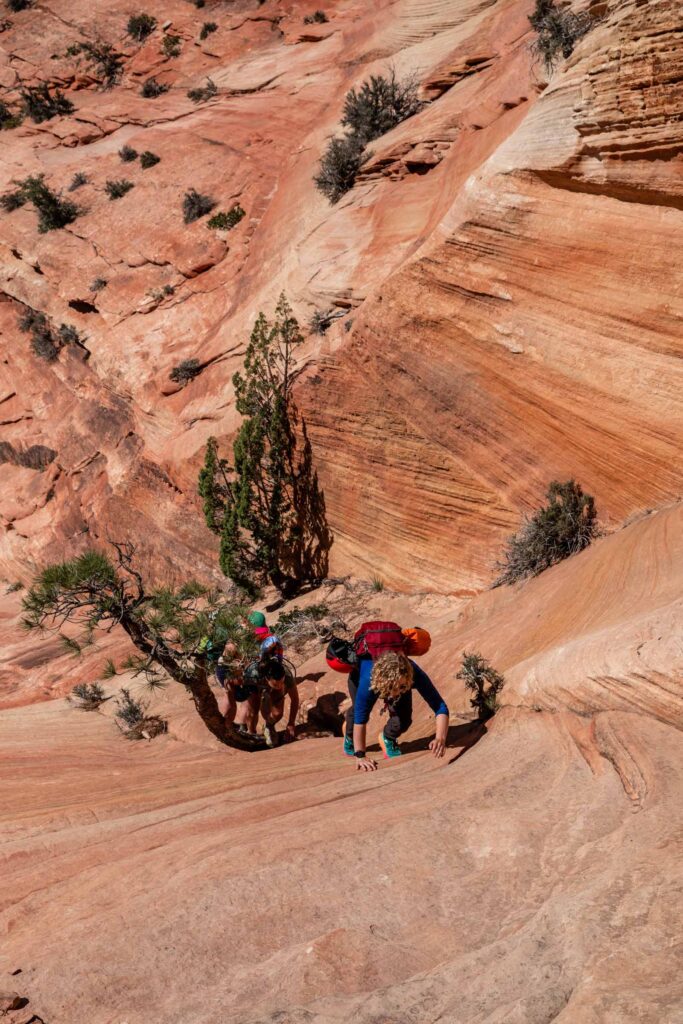 The morning was a lovely temperature as we hiked through a wide canyon on sandy ground. We followed the dried up Pine Creek until the canyon got too narrow and started making our way up the saddle. Some scrambling was involved and we noticed certain footwear was better than others. It was interesting picking our way through the horizontal layers of Zion’s red rocks but we managed to find the least steep way up, careful not to cliff ourselves out.
