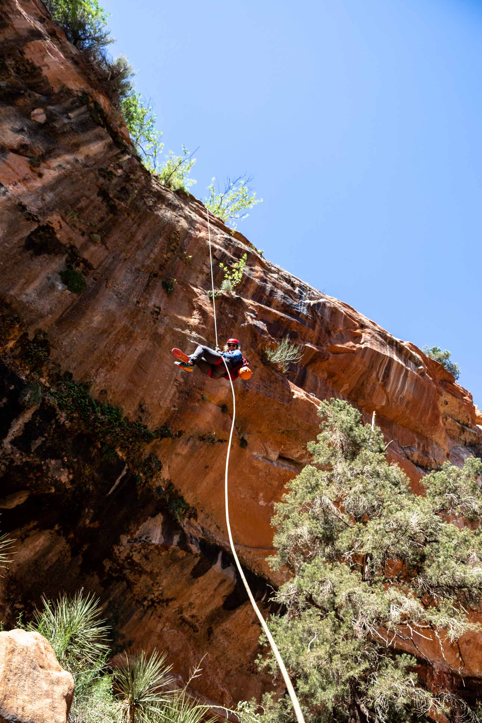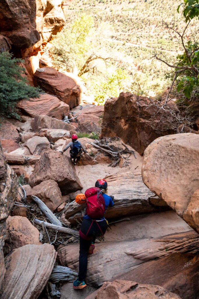- There’s 2 main free-hang rappels, lots of scrambling up steep sandstone and scrambling down big boulders and sandy ground at the end.