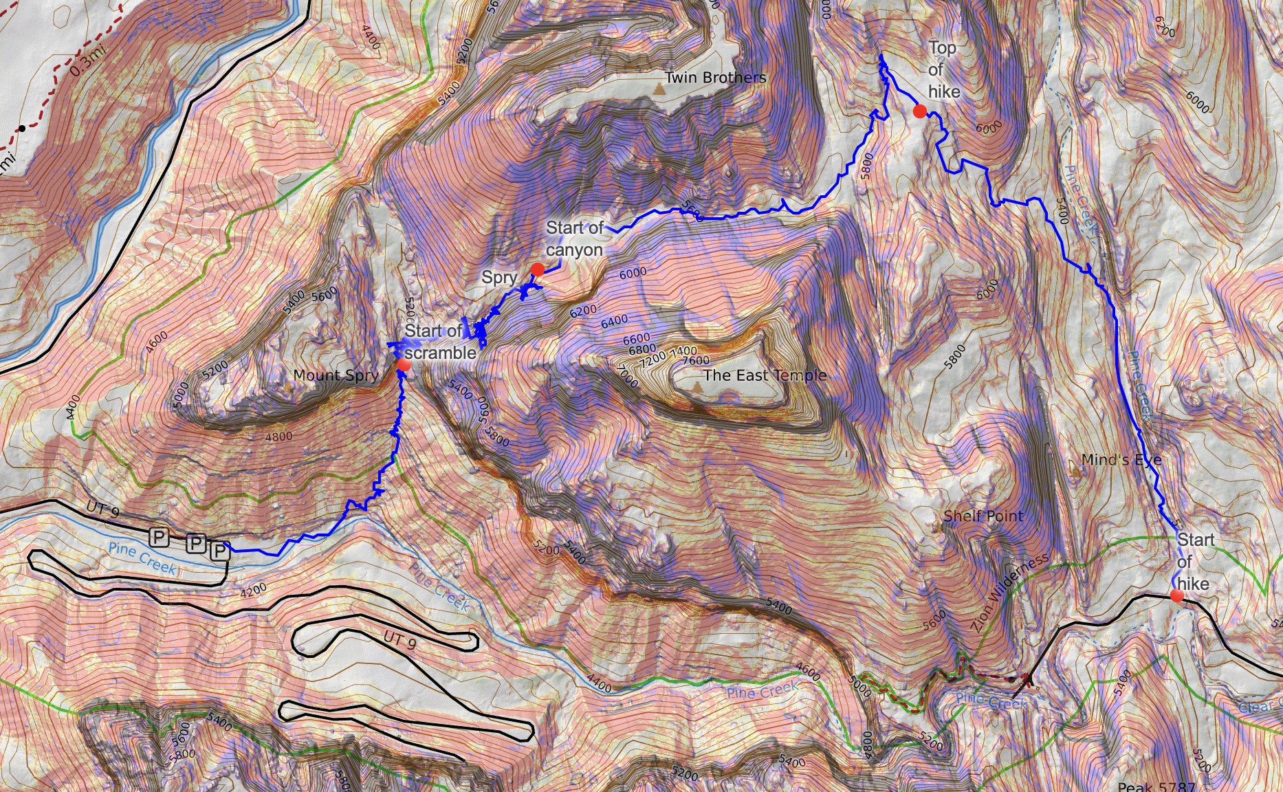 At the saddle, we enjoyed a short break to enjoy the scenery, away from all the tourists in our own solitude. We could see the canyon we’d descend shortly, or at least the area which seemed to get narrow. We needed to get down to the drainage of Spry, opposite of Pine Creek. Navigating cacti and other prickly plants, we found ourselves between East Temple and Twin Brothers, which create the walls of Spry Canyon. A trickling of water was our indicator we landed in the right spot for the start of the canyon.