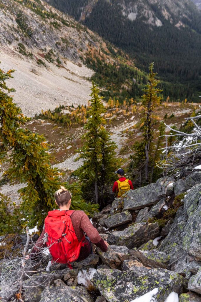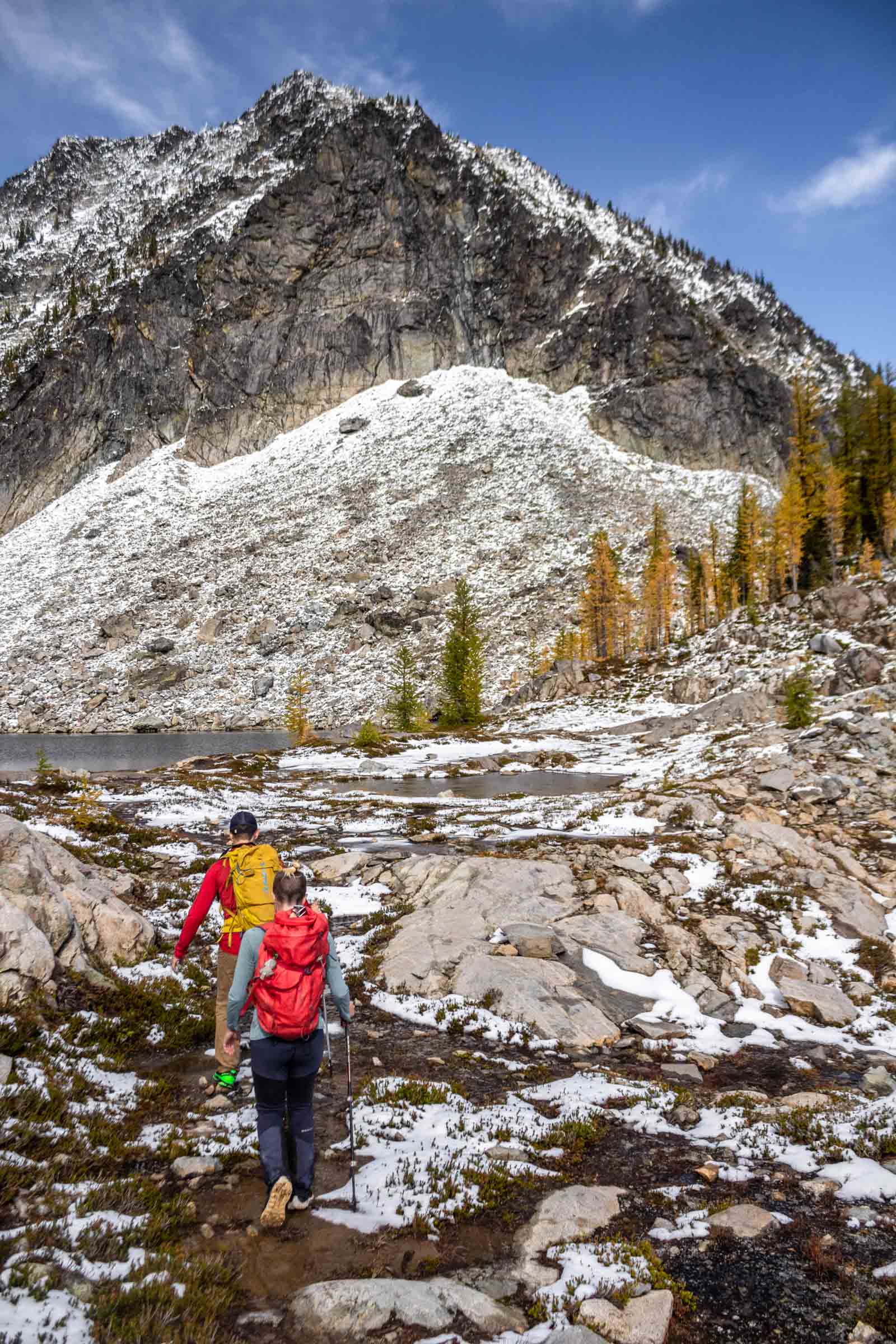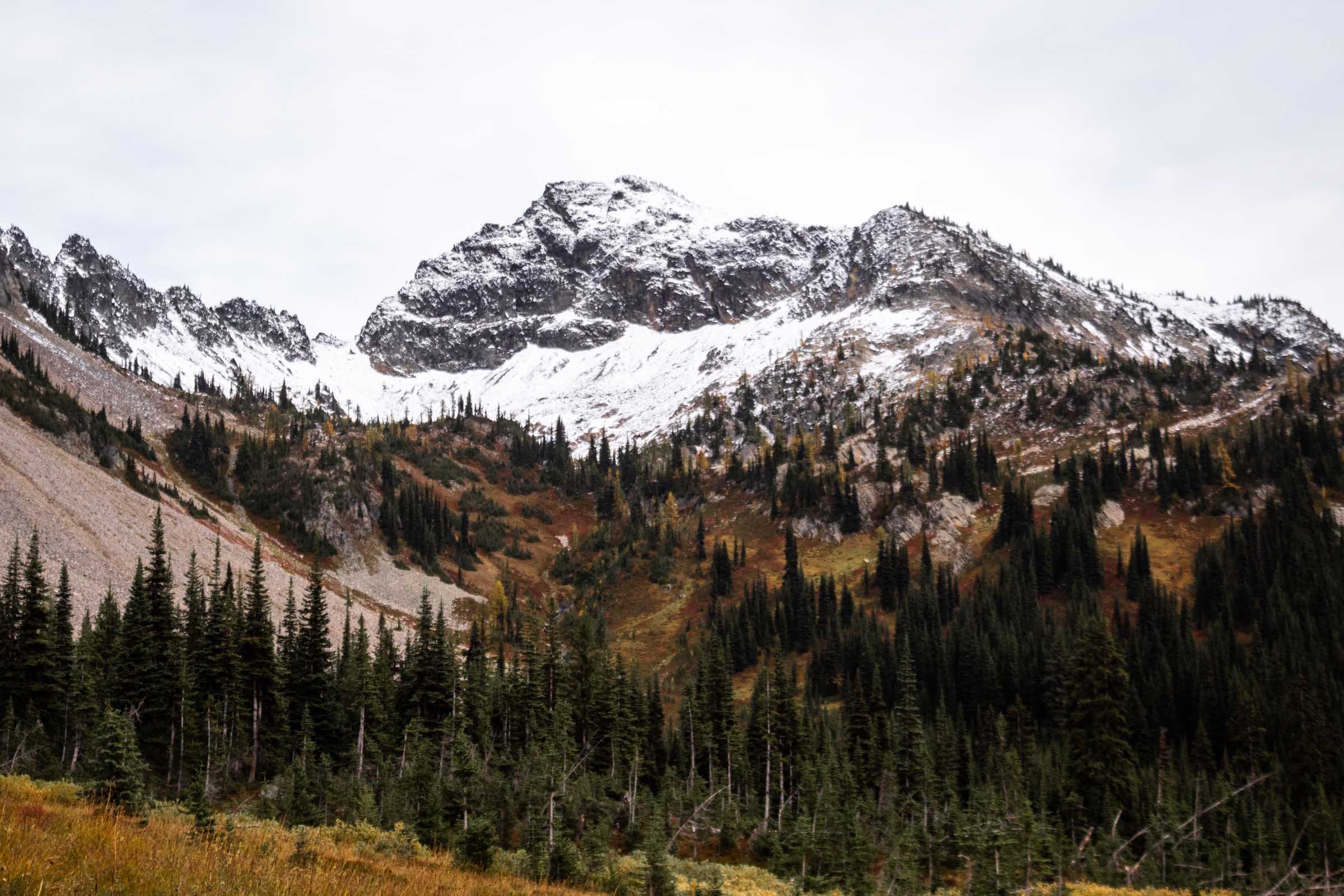 I think that a light layer of snow always makes the scenery look more beautiful than it ever could. The contrast of white and color is just perfect! It’s what gets me excited to take pictures and capture everything I saw (700+ photos later, I’m drowning in editing, but a good kind of swimming!). We’d weave in and out of the trees and eventually climbed back up to the little Stiletto Lake. Most people probably would enter via the Twisp Pass route, but we didn’t see anyone other than the couple we were following from the lookout site. I assumed they may have descended by Twisp Pass since we didn’t see them on our way out to Copper and we had met up with them back at the trailhead. I apologize for being loud and obnoxious if they wanted peace and quite, but I couldn’t contain my excitement!