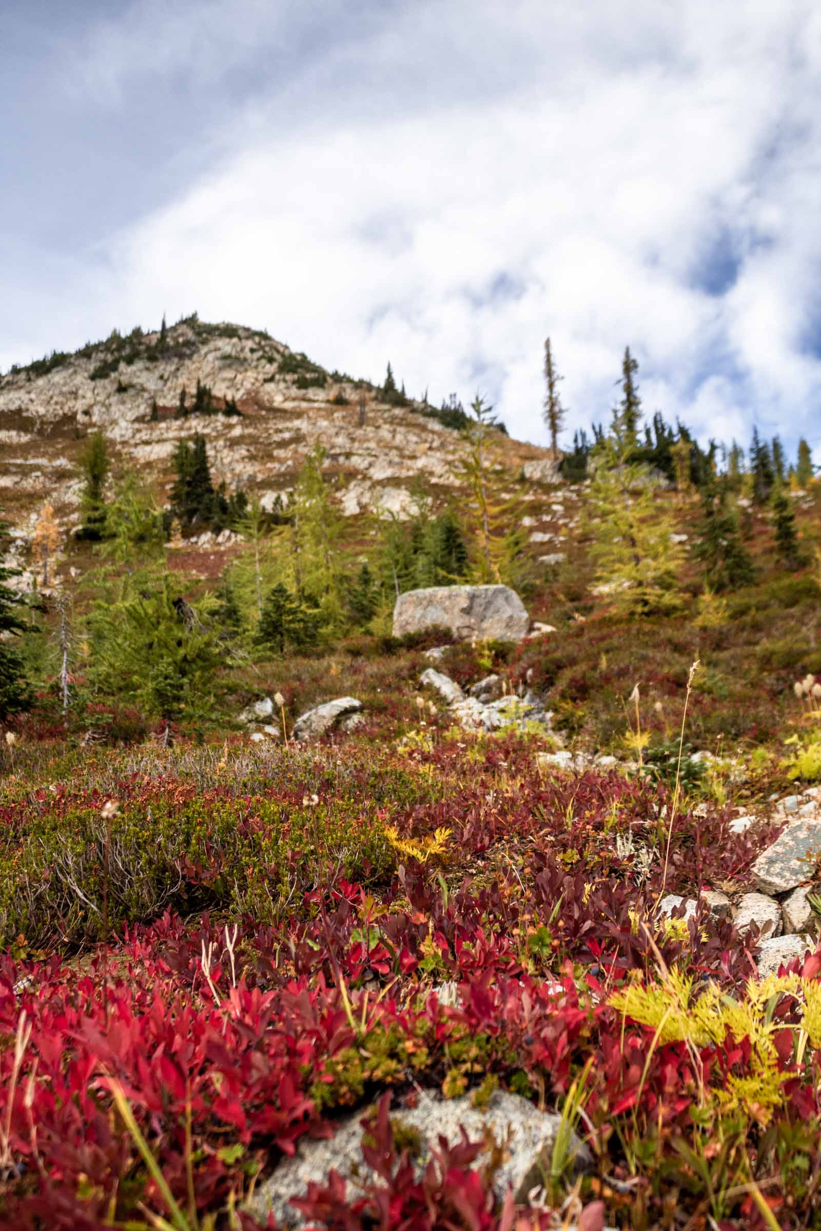 But soon at last, we reached the end of the boulders and the start of the meadowy yellow tree forest. It was so nice to just enjoy the views going up and down the valley, spying yellow trees near and far. This last segment to get to Copper Pass was probably the most colorful of the day. We had all the colors of the rainbow as far as I was concerned. It was more of the take 5 steps, take a picture, take another 5 steps and another picture, and repeat until we finally got to the ridge. On paper, we could see an easy passage to saddle point by taking the ridge.