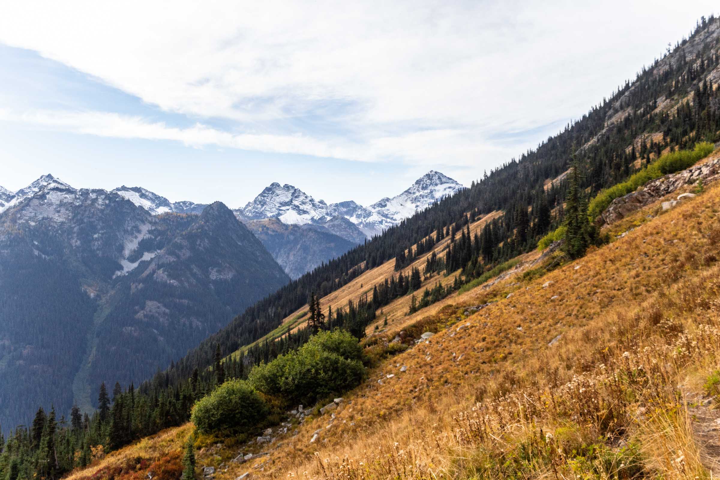 The wonderful thing about many Washington trails is that there are often signs to point you in the right direction and this was no different. We crossed about 3 intersections after starting on the PCT and eventually found ourselves climbing up a heavily switchbacked trail till we started emerging from the forests. Blue had the most curious time figuring out if she should go under or over the fallen trees, making Isaac’s first big PNW hike even more of an adventure. And then of course the whole time I’d ask about the yellow trees. Where are these famed yellow trees I was promised to see? Clearly not this valley at this point, I kept thinking.