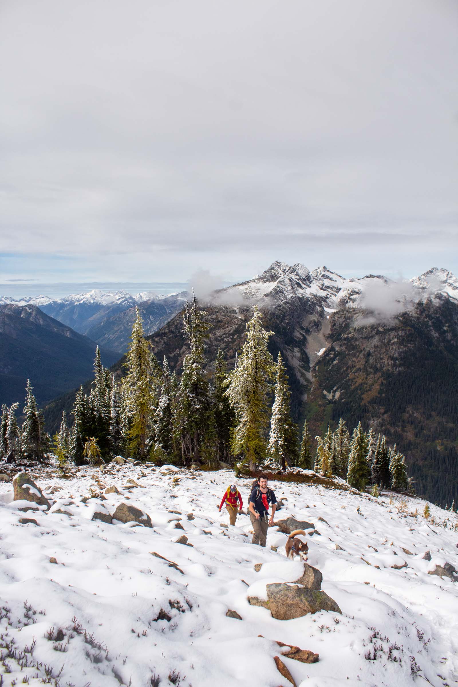 Our running joke was that this was like a kindergarten field trip. And that’s probably an accurate description. I’d ask about the yellow trees and Nastassia would ask about the peaks and Isaac would just revel in everything we saw. Then Kyle would calm us all down and teach us all about the mountains. In no time, we reached the Stiletto Lookout Site and found the two people whose footprints we were following. To be clear, there is no lookout, just remnants of one and a wind barrier created by a stacked rock wall. Looking East, we could see the true Stiletto summit, what I originally wanted to scramble. But seeing that the snow was sketchy and Blue was probably having enough of it, we skipped it. The views would have been even more incredible, but till next time.