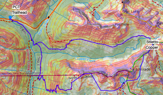 Looking at a topographic map, it seemed reasonable to travel off-trail from Stiletto Lookout to Copper Pass while checking off all my other criteria. And anything further to another peak or range would constitute a 18+ mile loop. And I vetoed those options for this time. We’d start at the same trailhead that Kyle used last year to get to his loop last year. But we’d loop east instead of west and south.